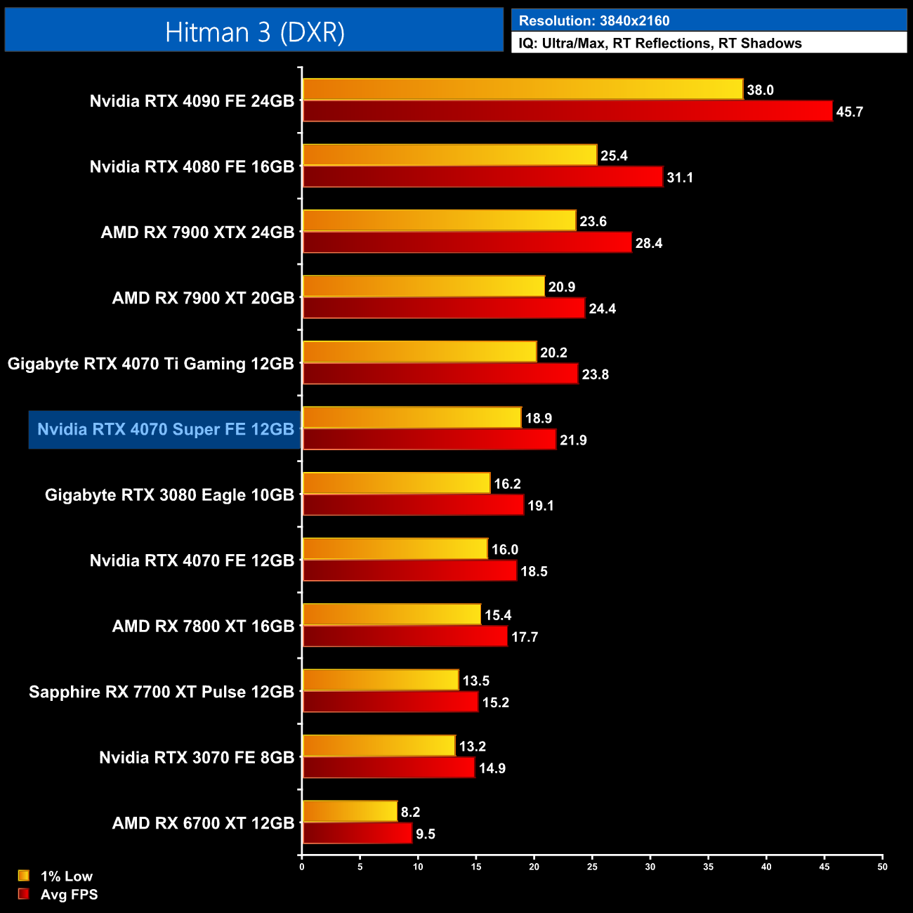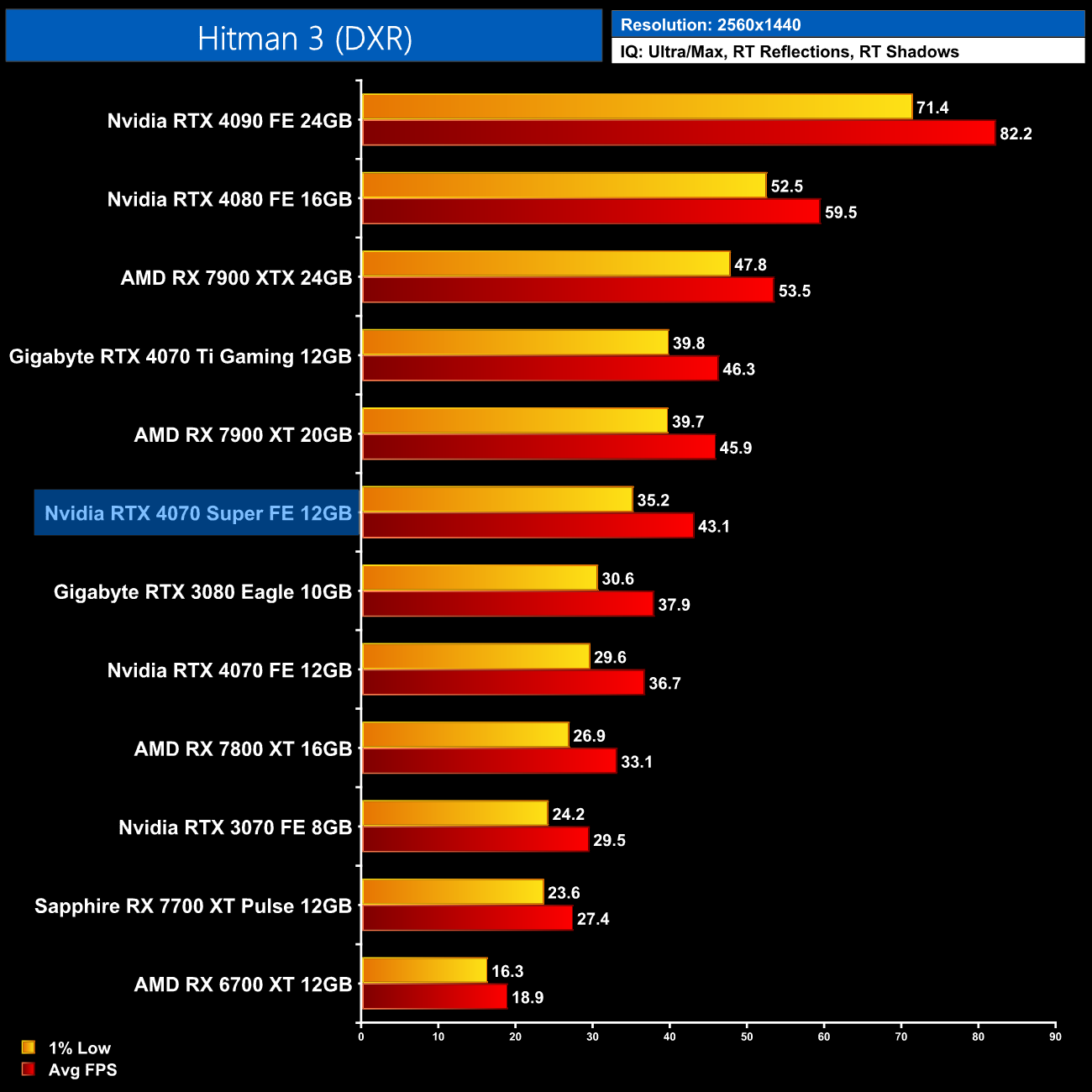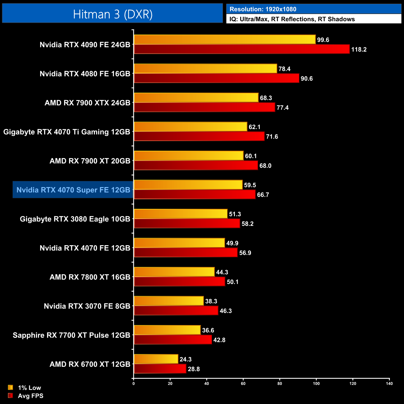 Hitman 3 is surprisingly punishing, despite only featuring ray traced shadow and reflections. At 1440p, the 4070 Super is still 17% faster than the 4070 and 7% slower than the 4070 Ti, but it's more or less equal to the RX 7900 XT, and 30% ahead of the 7800 XT.