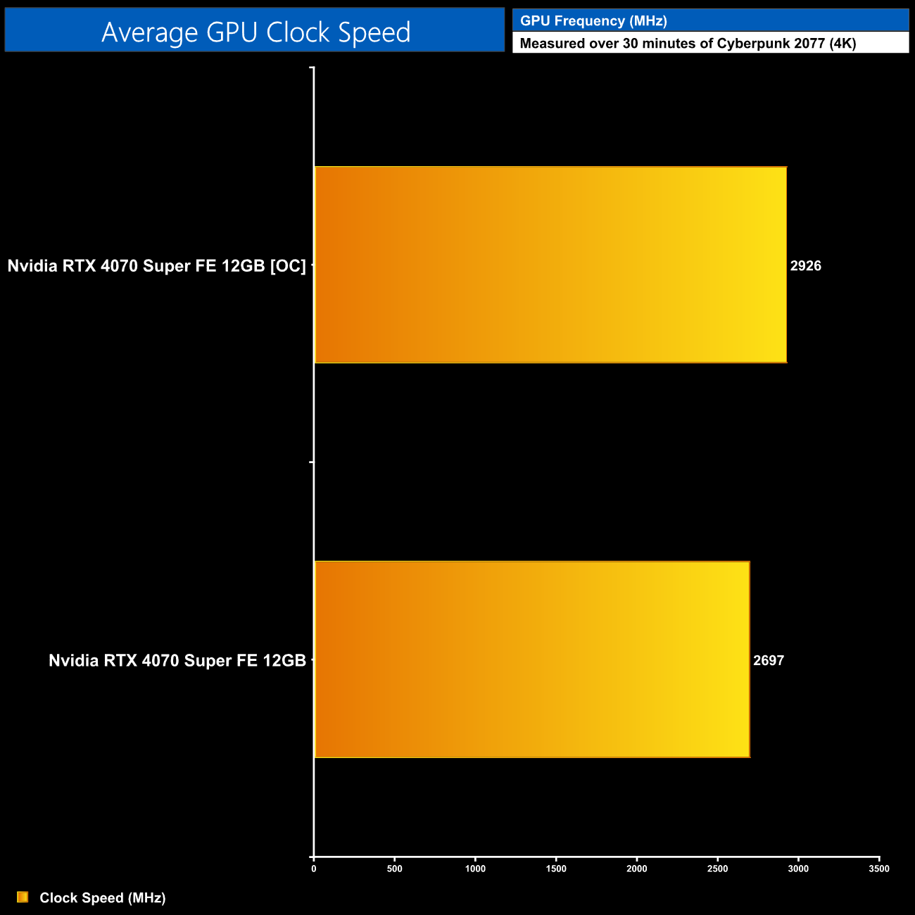 This resulted in a real-world clock speed of 2926MHz, measured over a 30-minute stress test in Cyberpunk 2077.