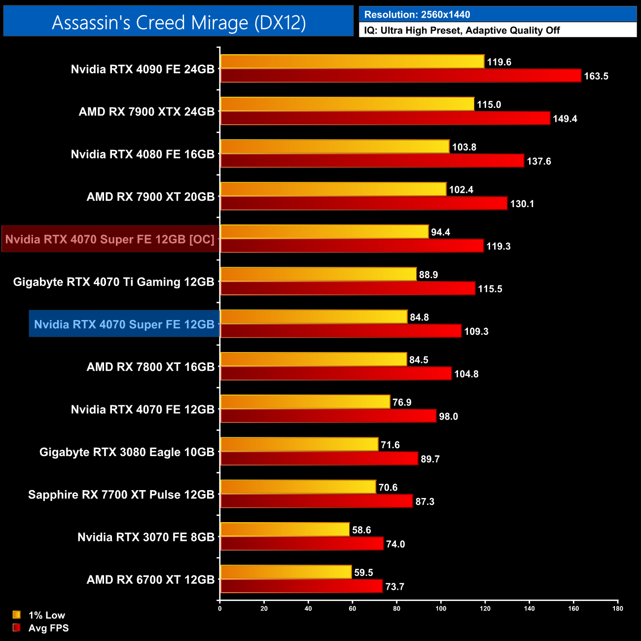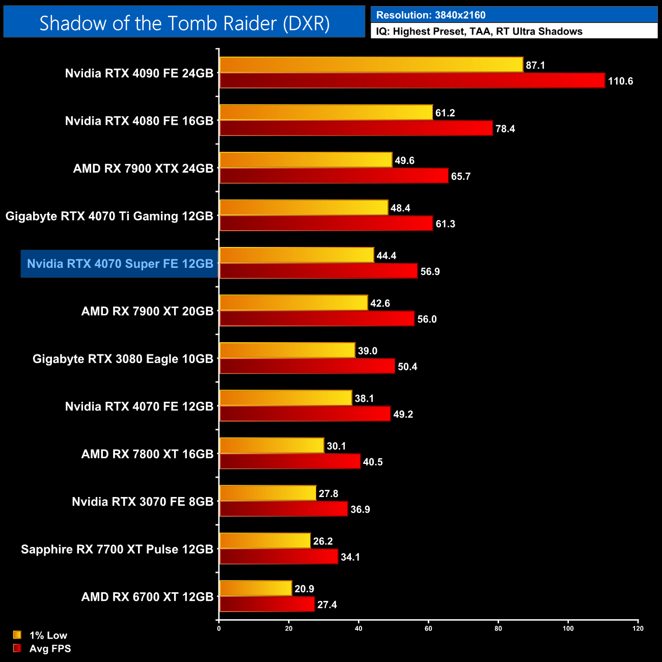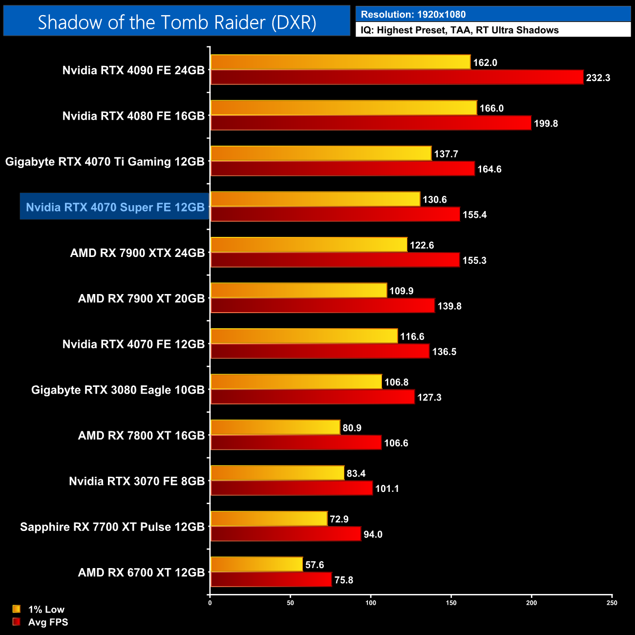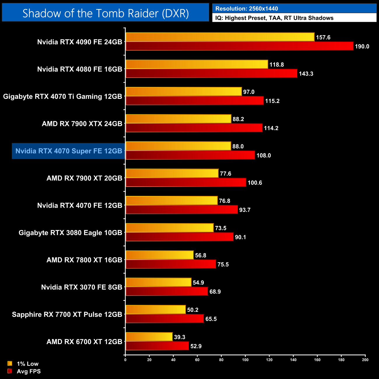Lastly, we finish up with Shadow of the Tomb Raider. Despite being one of the first ray-traced games to hit the market back in 2019, while only featuring ray traced shadows, we still see a clear lead for Nvidia hardware in this title. The 4070 Super is 43% faster than the RX 7800 XT at 1440p for instance, while it's within touching distance of the RX 7900 XTX.