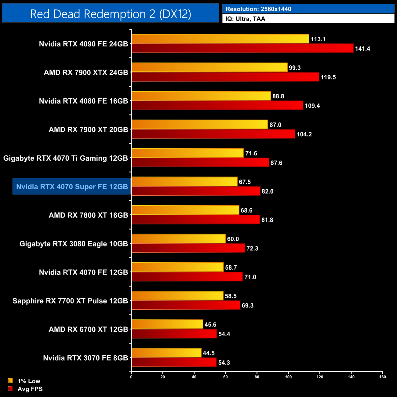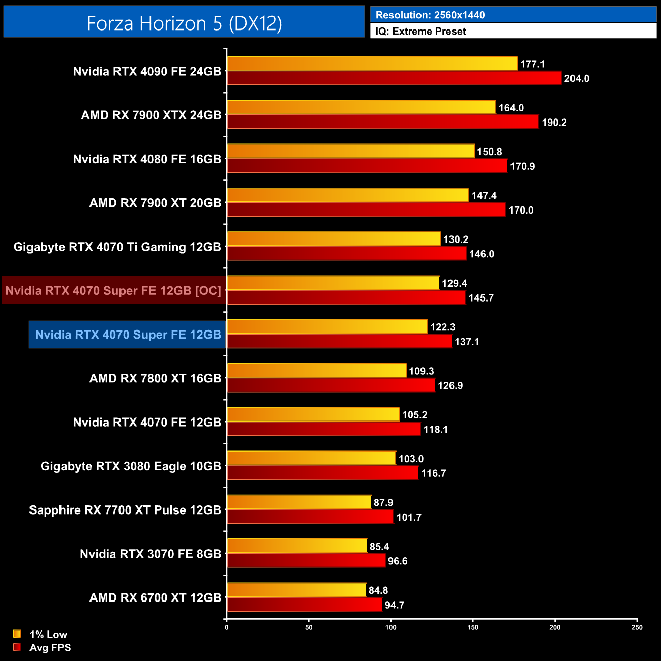 Overall, for ray tracing it is clear that Nvidia hardware does have the edge. We can see that in the average results at 1440p, where the 4070 Super comes in 47% faster than the RX 7800 XT, 8% ahead of the RX 7900 XT and is only 5% behind the much more expensive 7900 XTX. Relative to Nvidia's own offerings, we see pretty typical results, with the 4070 Super 17% faster than the 4070 and 8% slower than the 4070 Ti.