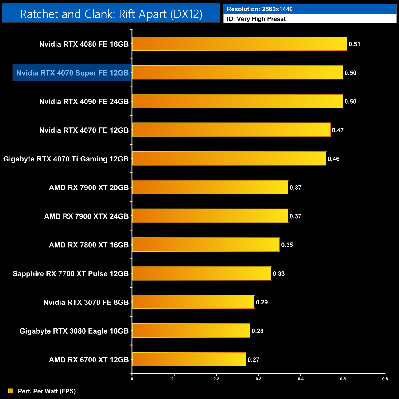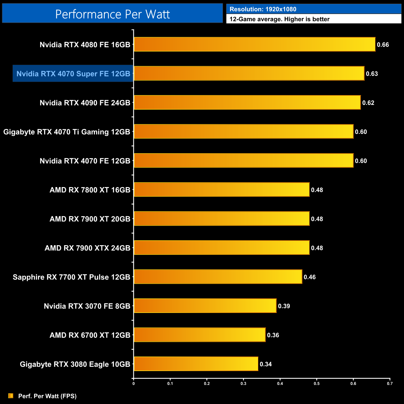 The low power draw figures coupled with the performance improvements on offer over the vanilla RTX 4070 does make the 4070 Super that bit more efficient, second only to the RTX 4080 in our chart.