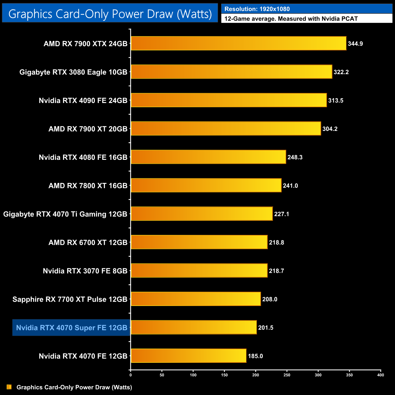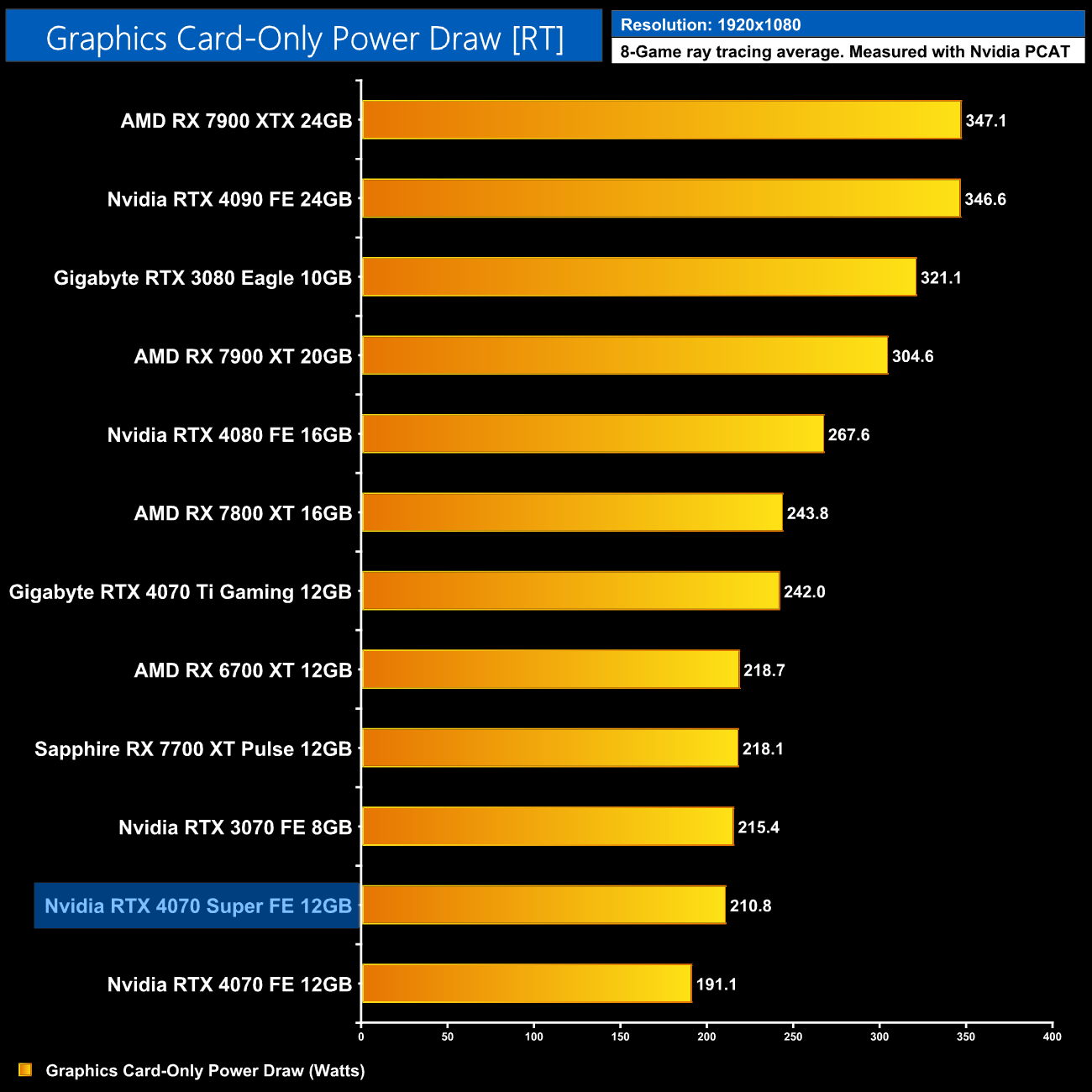 Here we present power draw figures for the graphics card-only, on a per-game basis for all twelve games we tested at 1080p. This is measured using Nvidia's Power Capture Analysis Tool, also known as PCAT. You can read more about our updated power draw testing methodology HERE.