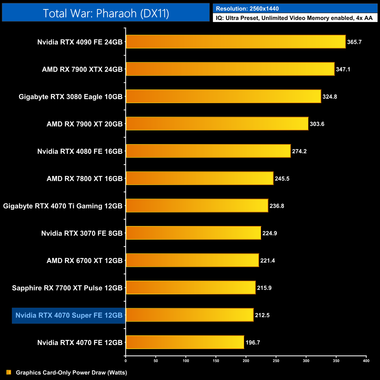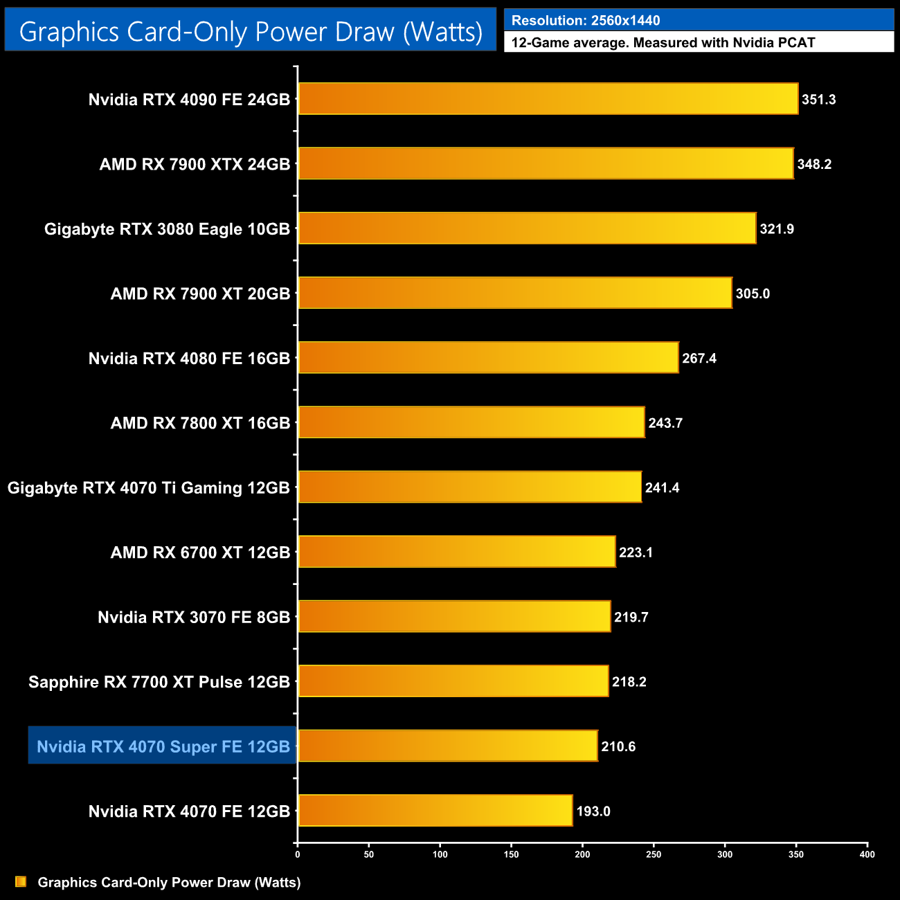 Here we present power draw figures for the graphics card-only, on a per-game basis for all twelve games we tested at 1440p. This is measured using Nvidia's Power Capture Analysis Tool, also known as PCAT. You can read more about our updated power draw testing methodology HERE.