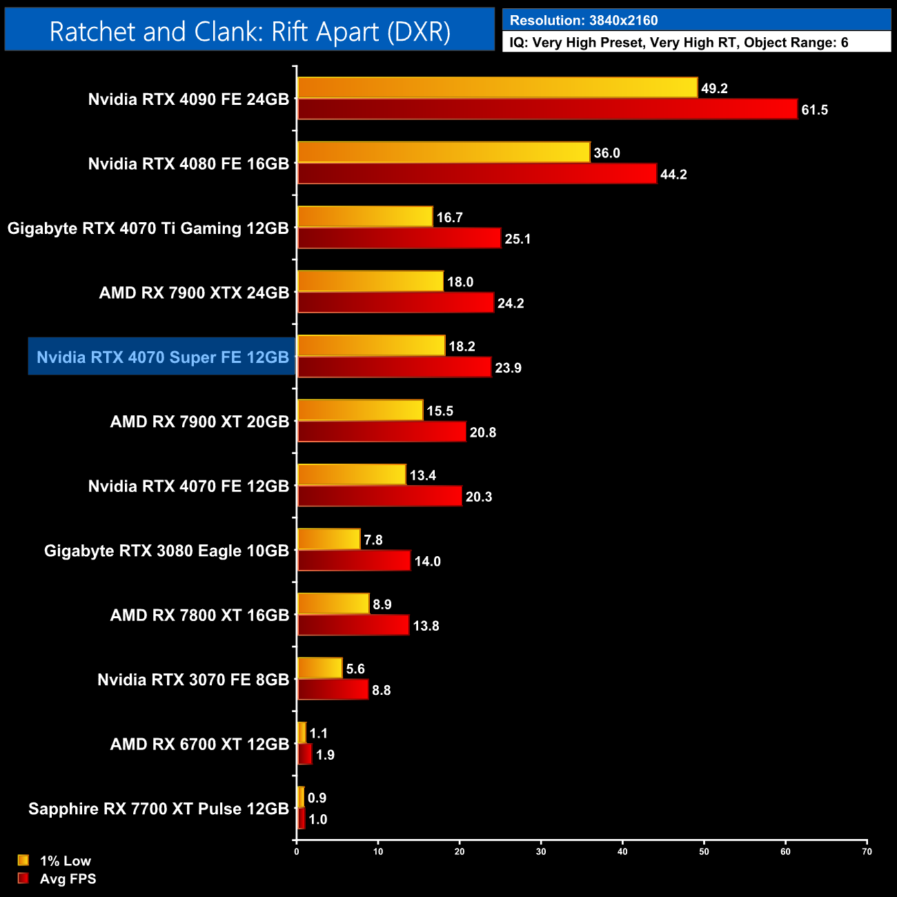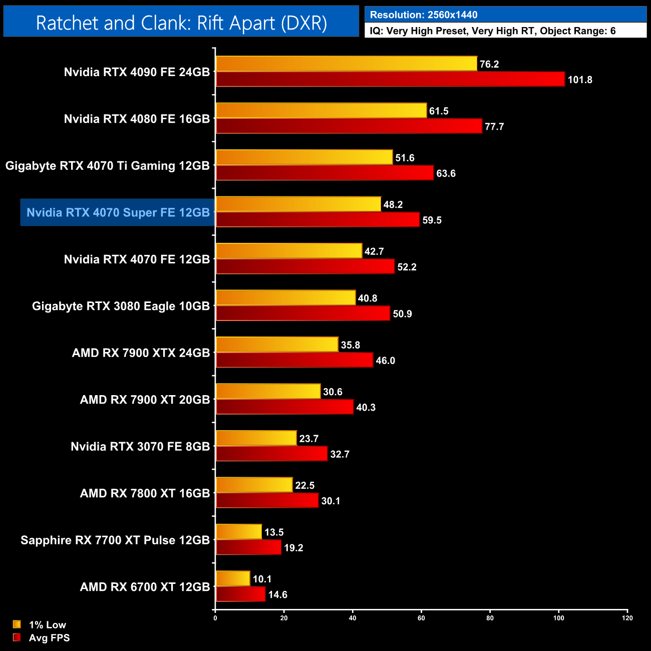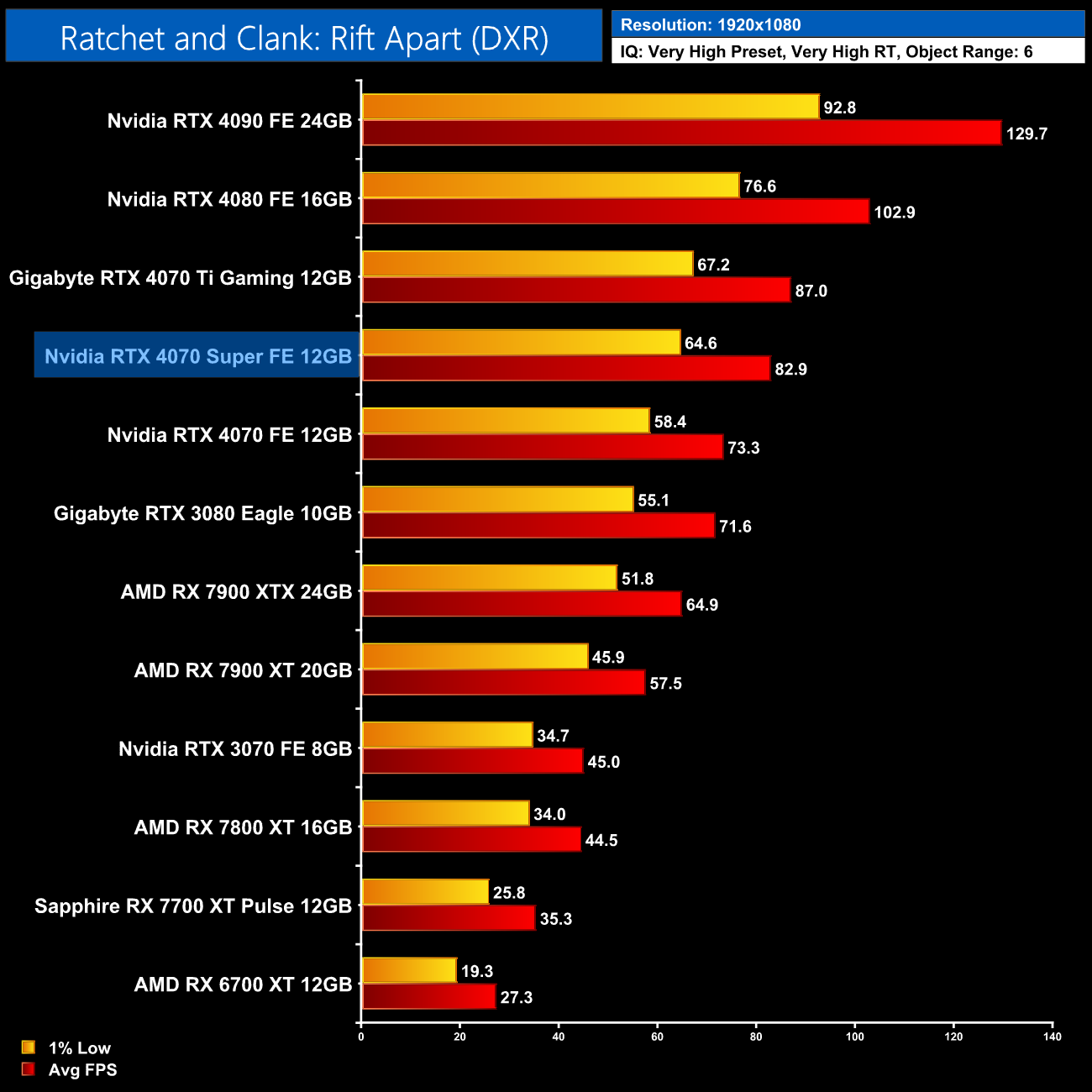 Ratchet and Clank is next, and with ray tracing maxed out, AMD GPUs absolutely crumble. At 1440p for instance, the RTX 4070 Super is faster than AMD's flagship 7900 XTX by a 29% margin. Compared to the RX 7800 XT, we're talking about almost a doubling of the frame rate.
