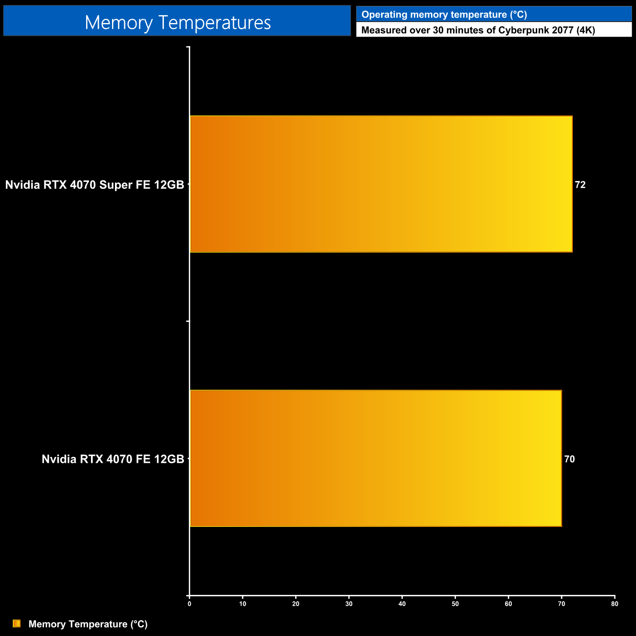 Likewise, GDDR6X memory temperatures peaked just 2C hotter on the 4070 Super, but it's still well within safe limits.