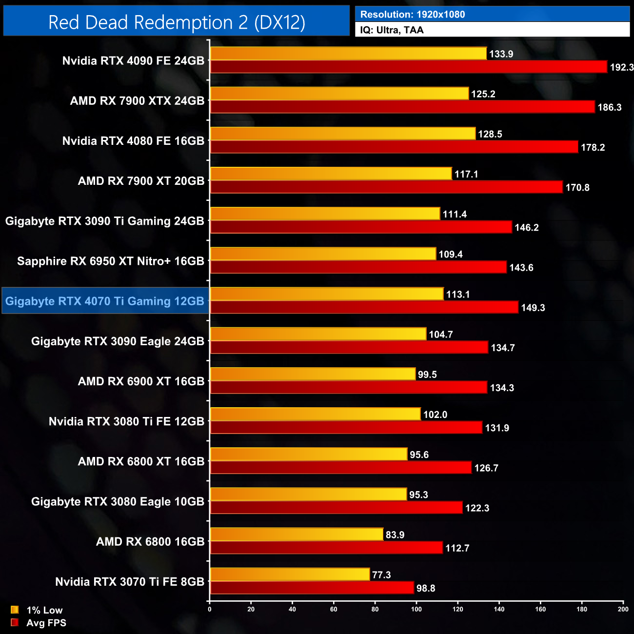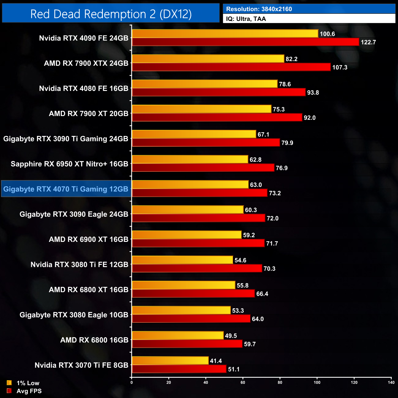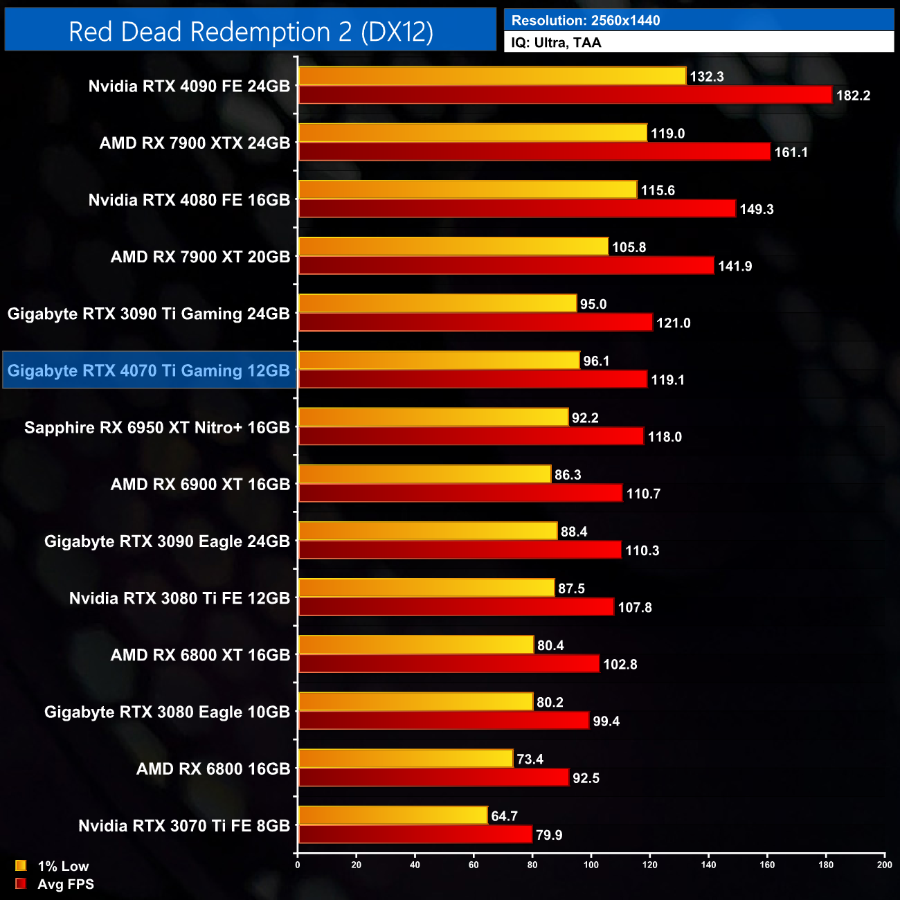 Performance from the RTX 4070 Ti is very strong in Red Dead Redemption 2, at least at 1440p – here it delivers almost 120FPS on average, putting it level with the RTX 3090 Ti and RX 6950 XT.