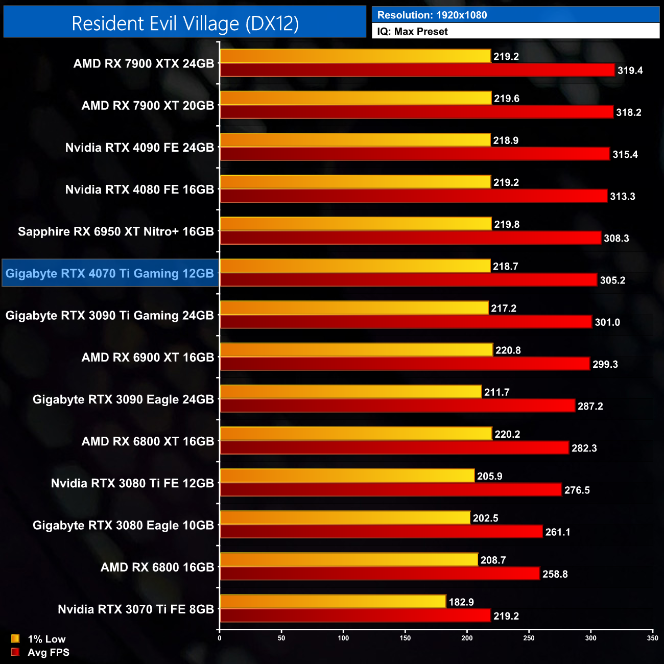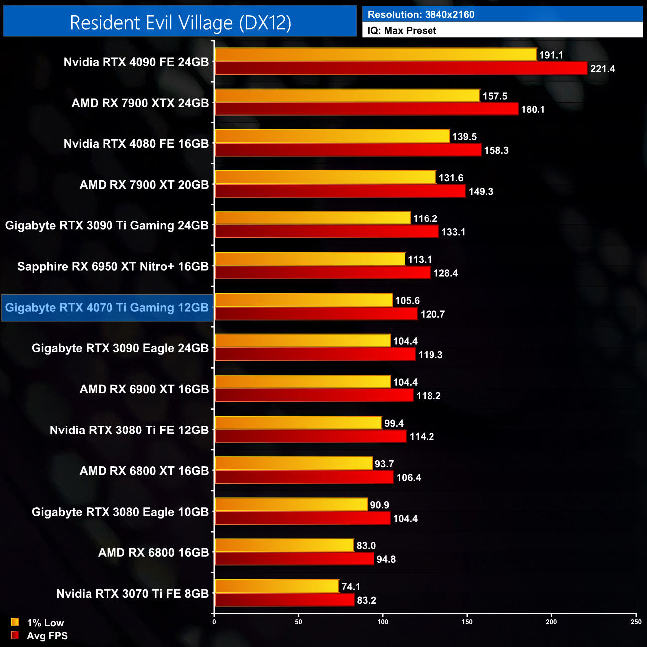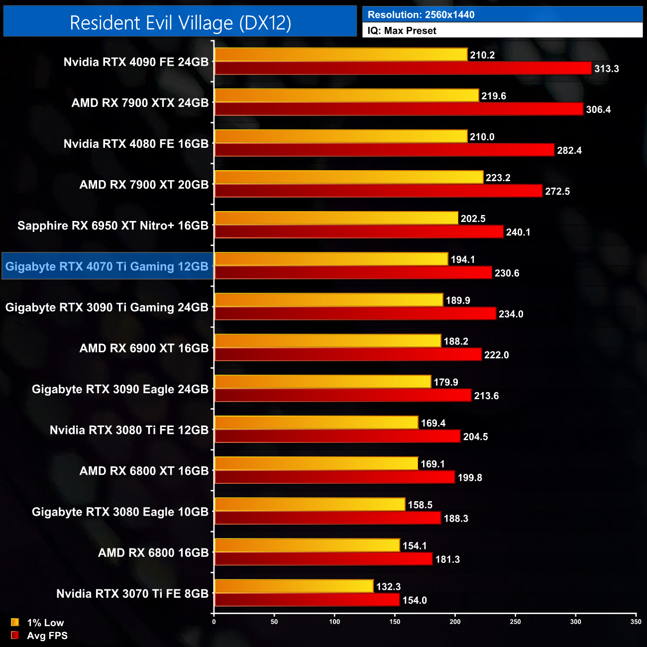 Resident Evil Village follows a very similar trend to RDR2. At 1440p, the RTX 4070 Ti basically matches the RTX 3090 Ti, while it's about 15% slower than the RX 7900 XT.