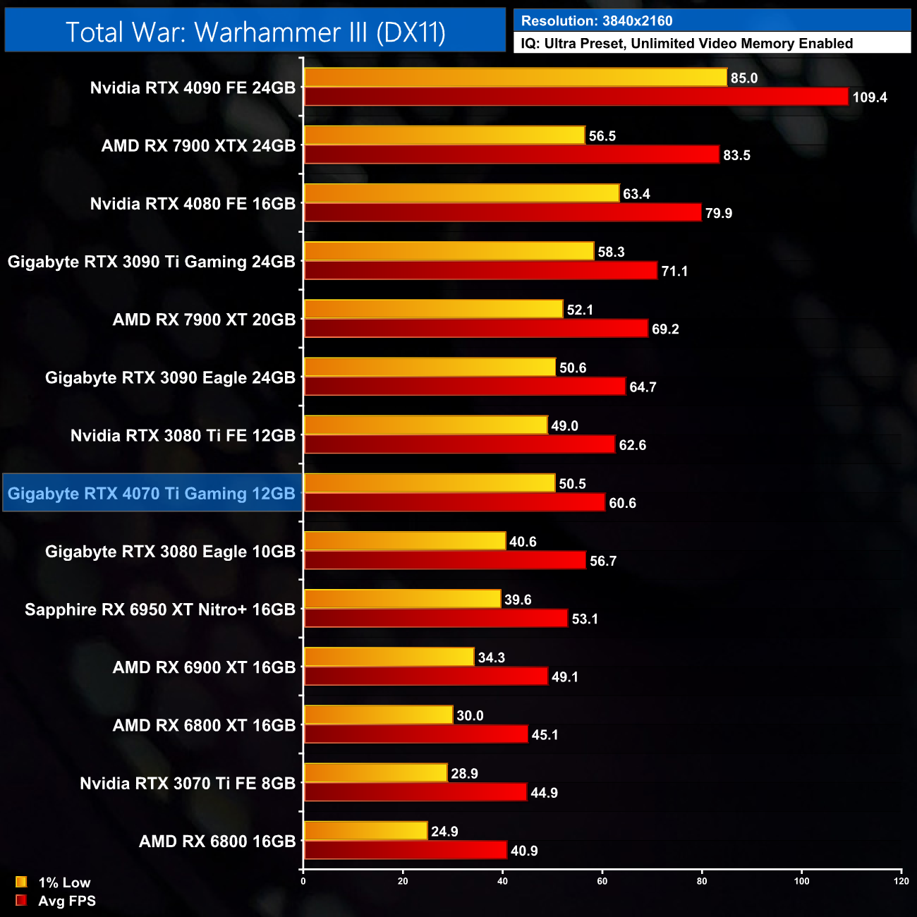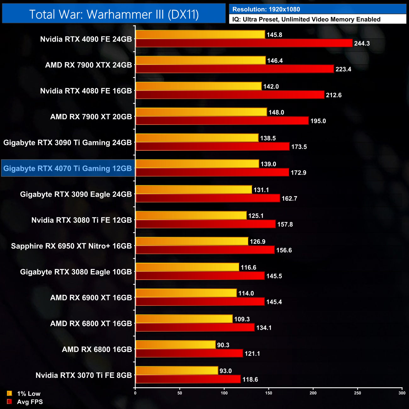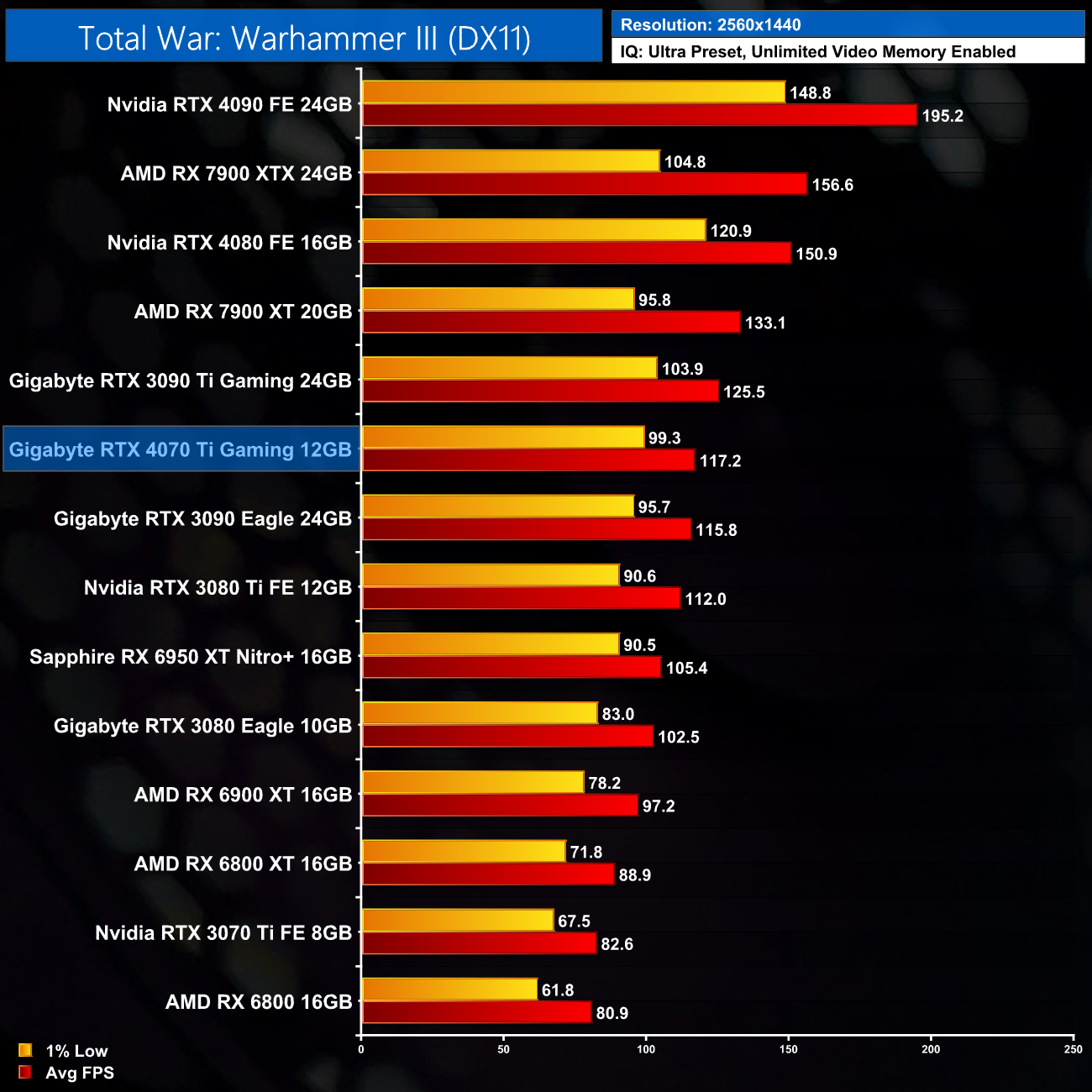 Lastly, we close our benchmarks with a look at Total War: Warhammer III. At 1440p, the RTX 4070 Ti is able to deliver over 115FPS on average, making it 7% slower than the RTX 3090 Ti.