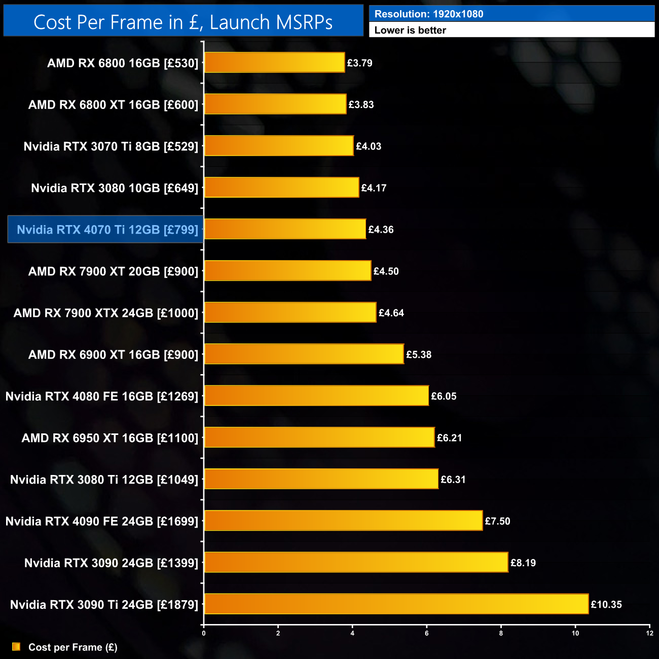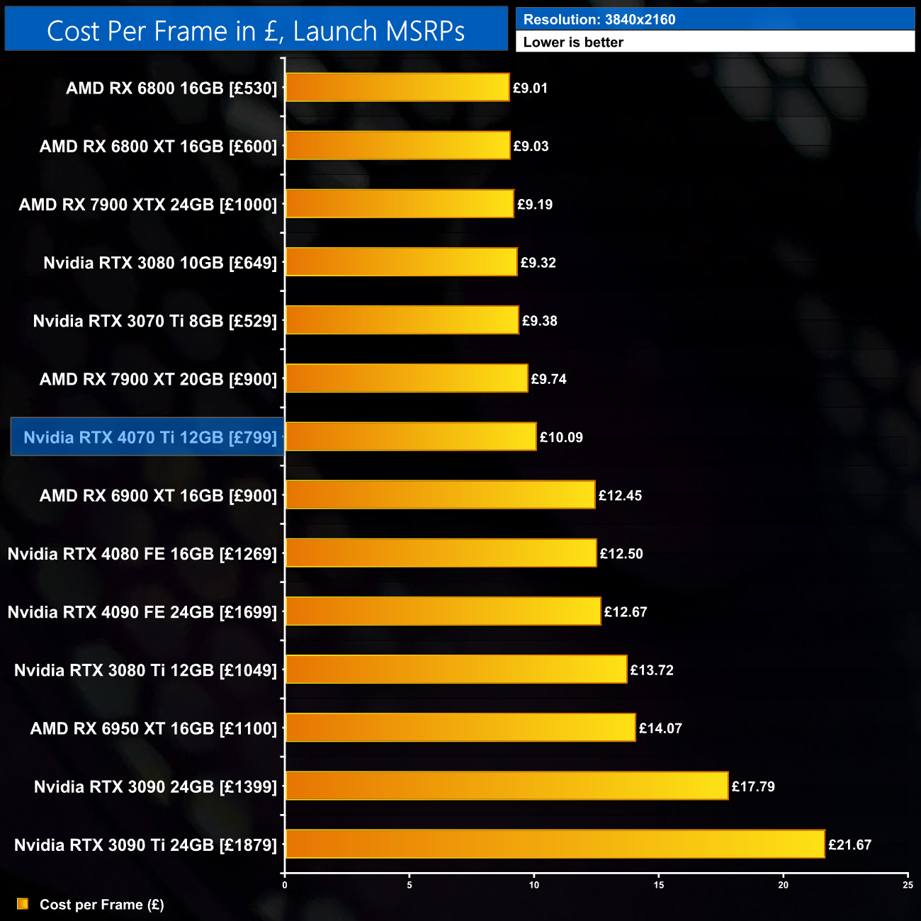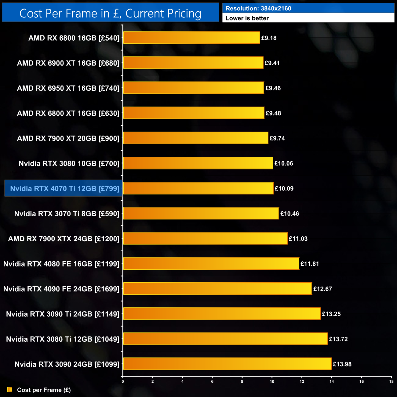 Likewise, at 4K, cost per frame matches the RTX 3080 – after all, the 4070 Ti is 14% faster than the RTX 3080 10GB, but 14% more expensive based on current pricing, so there's no real progression there in terms of value for money. It is, at least, better than any other 40-series card so far, and is within 4% of the RX 7900 XT.