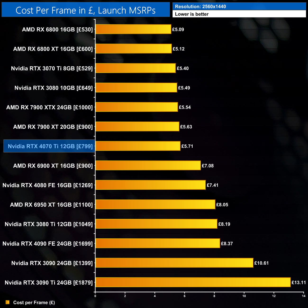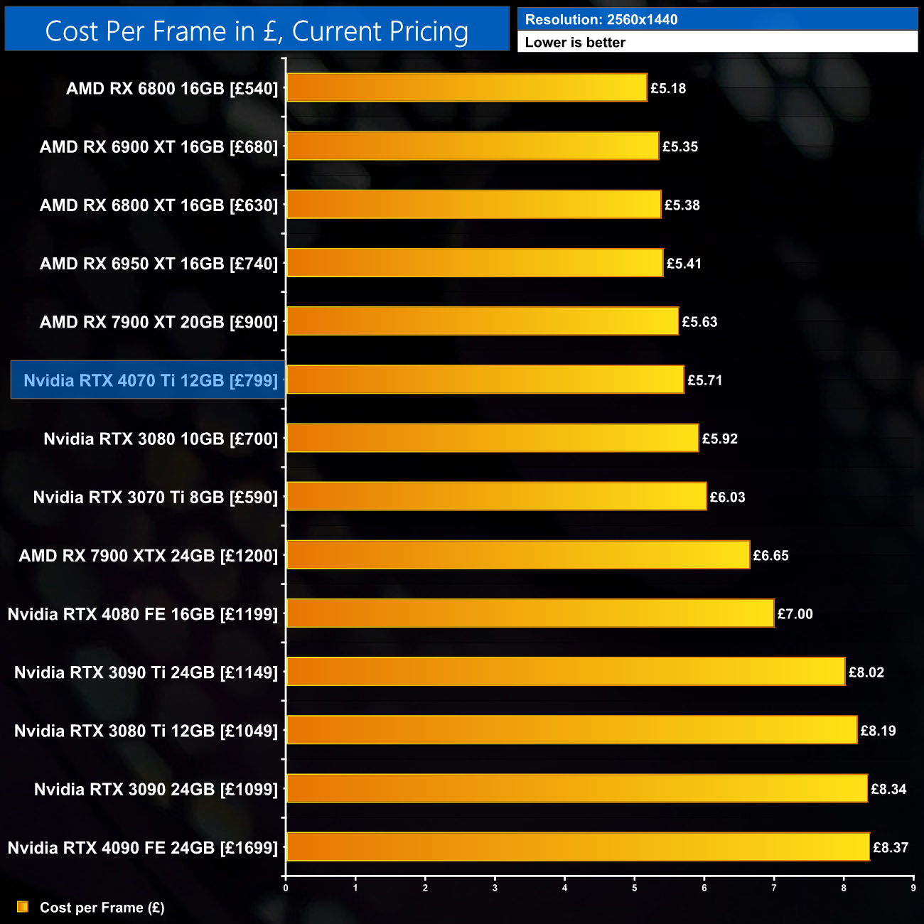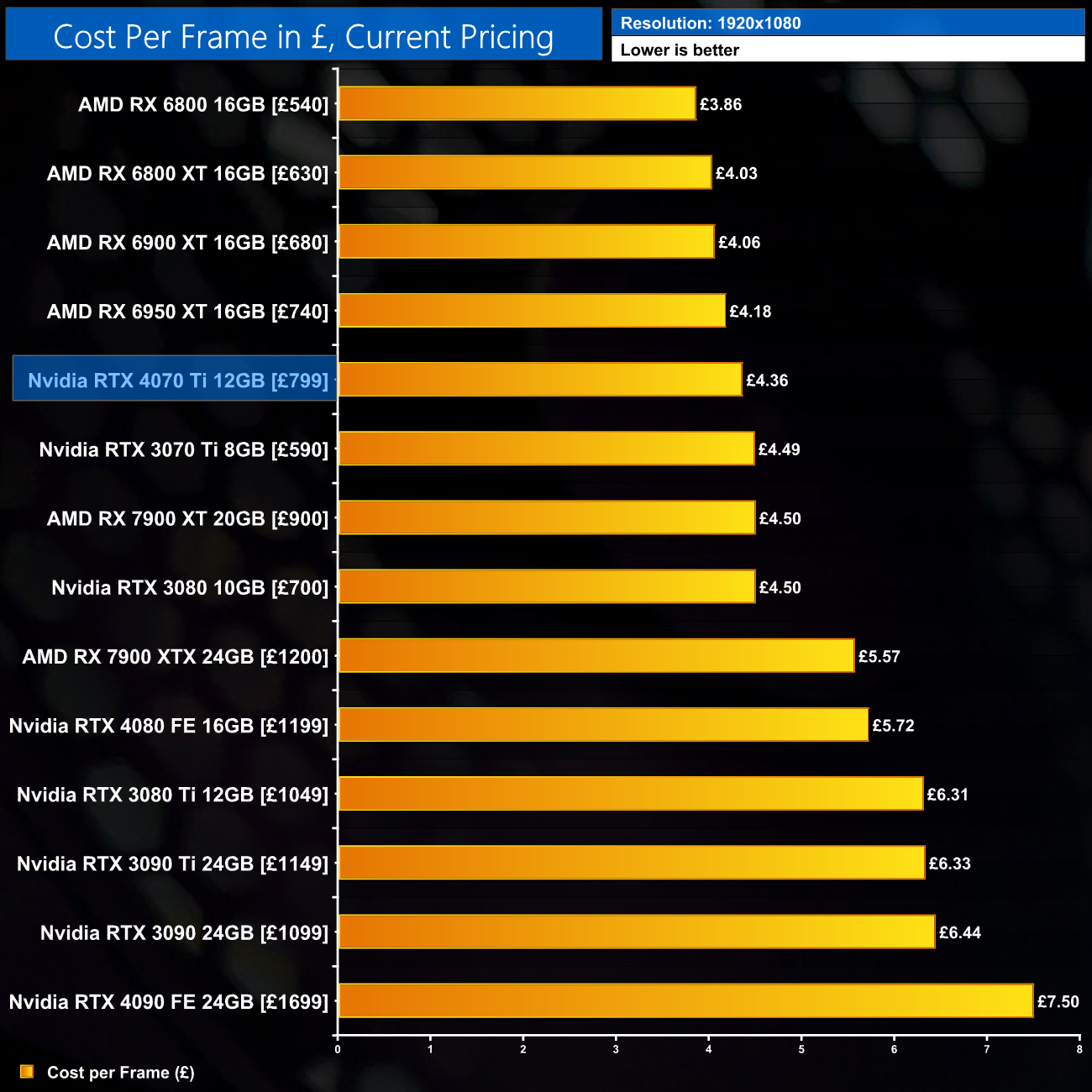 Likewise, at 4K, cost per frame matches the RTX 3080 – after all, the 4070 Ti is 14% faster than the RTX 3080 10GB, but 14% more expensive based on current pricing, so there's no real progression there in terms of value for money. It is, at least, better than any other 40-series card so far, and is within 4% of the RX 7900 XT.