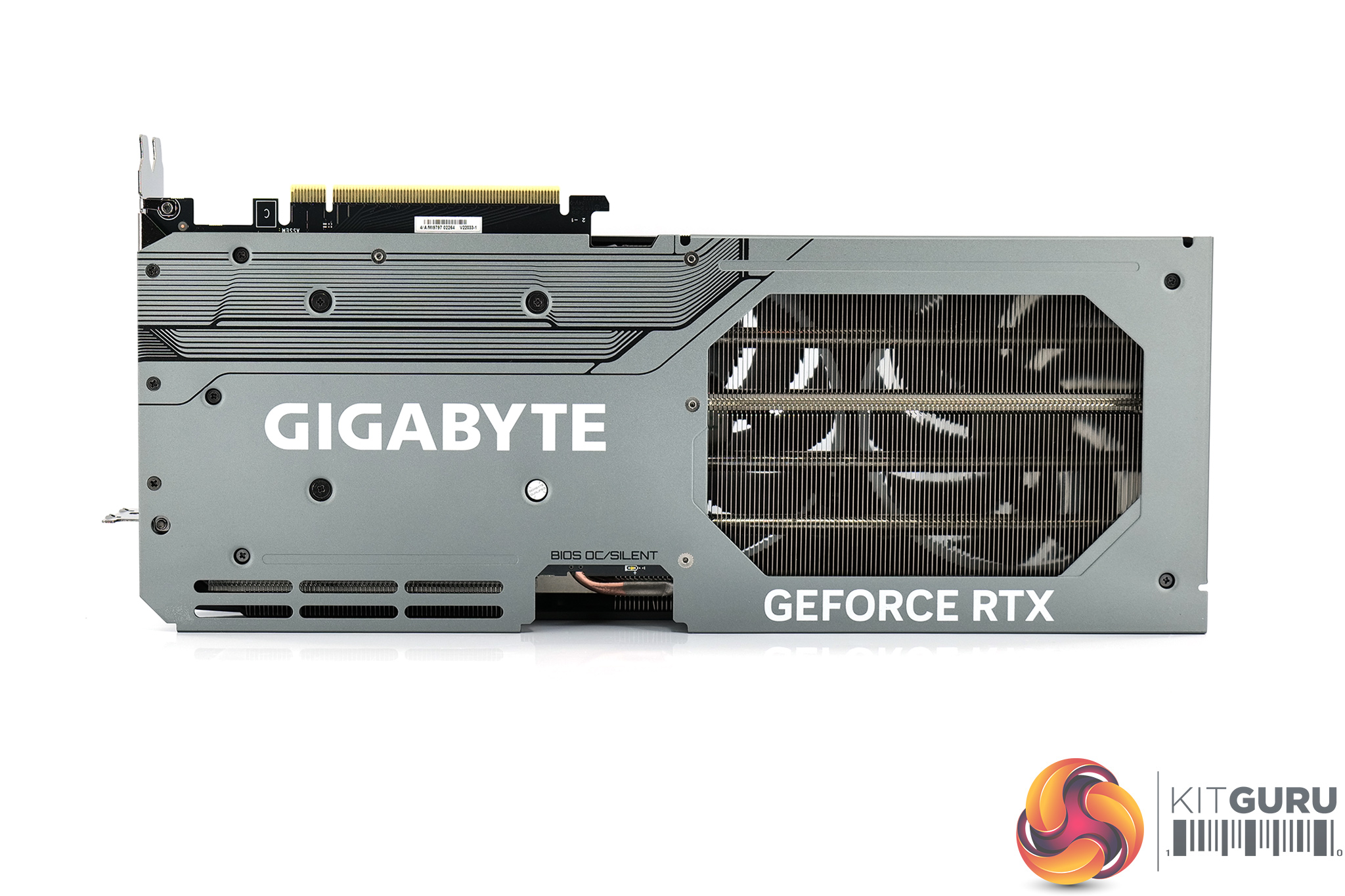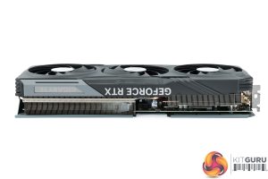 As for the backplate, this is made from metal and while it is a full-length design, there is a large cut-out towards the end of the card to allow airflow to pass directly through the heatsink. We can also note the dual-BIOS switch position in the middle, offering a choice of the OC or Silent modes. Both are identical in terms of clock speed and power limits, with the fan curve being the only difference.