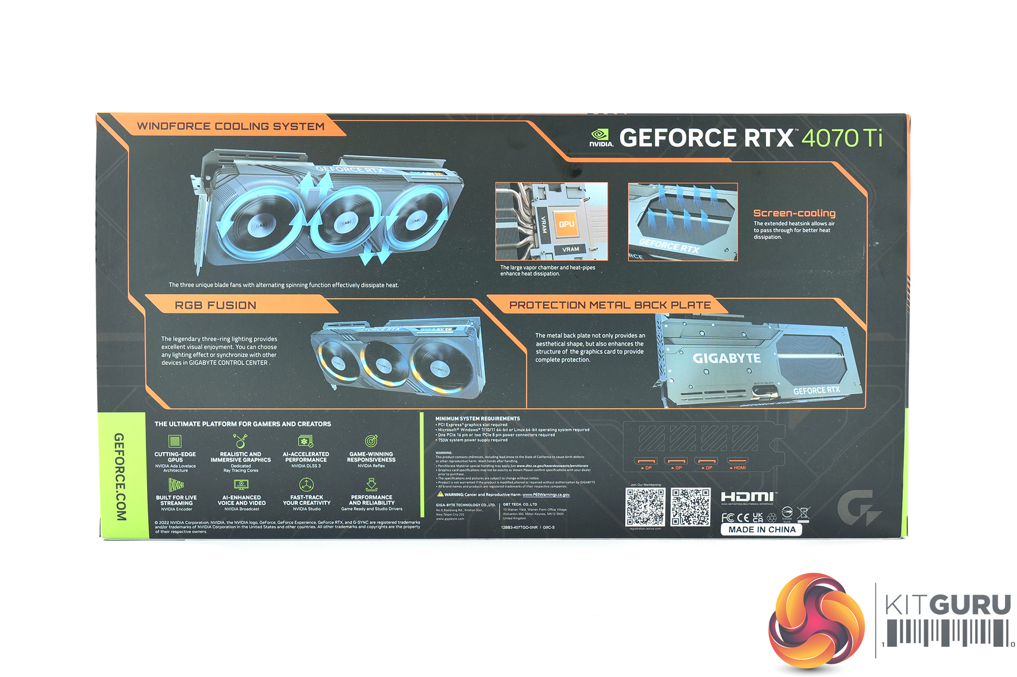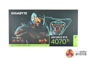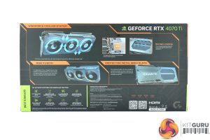 The Gigabyte RTX 4070 Ti Gaming OC ships in a black box, with a robotic-style avatar visible on the front. On the back, Gigabyte highlights various key features of the card and cooler design.