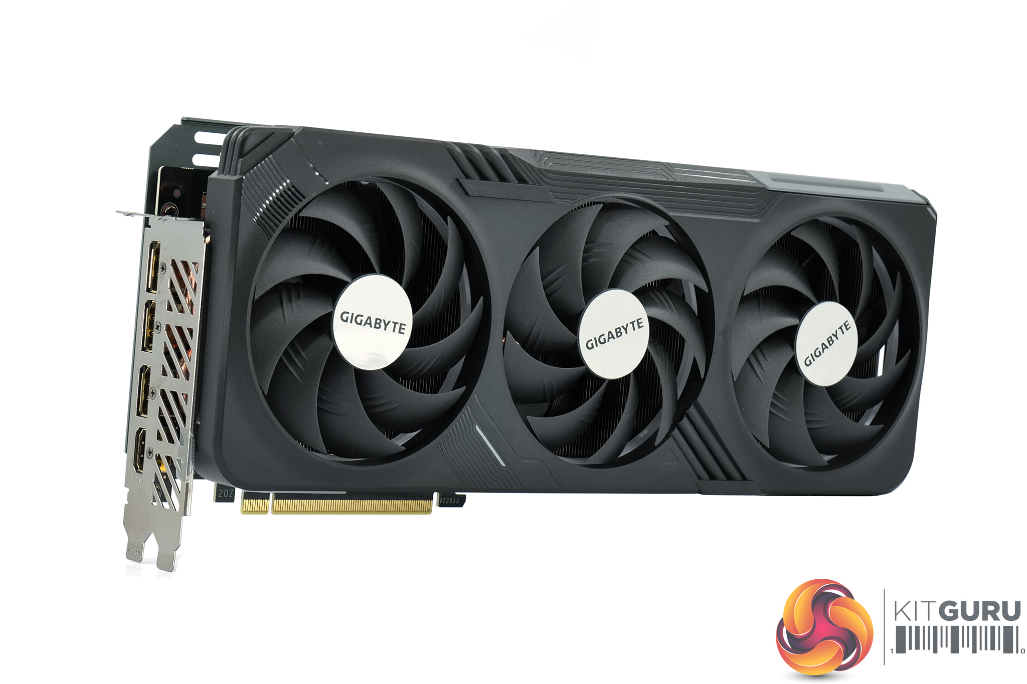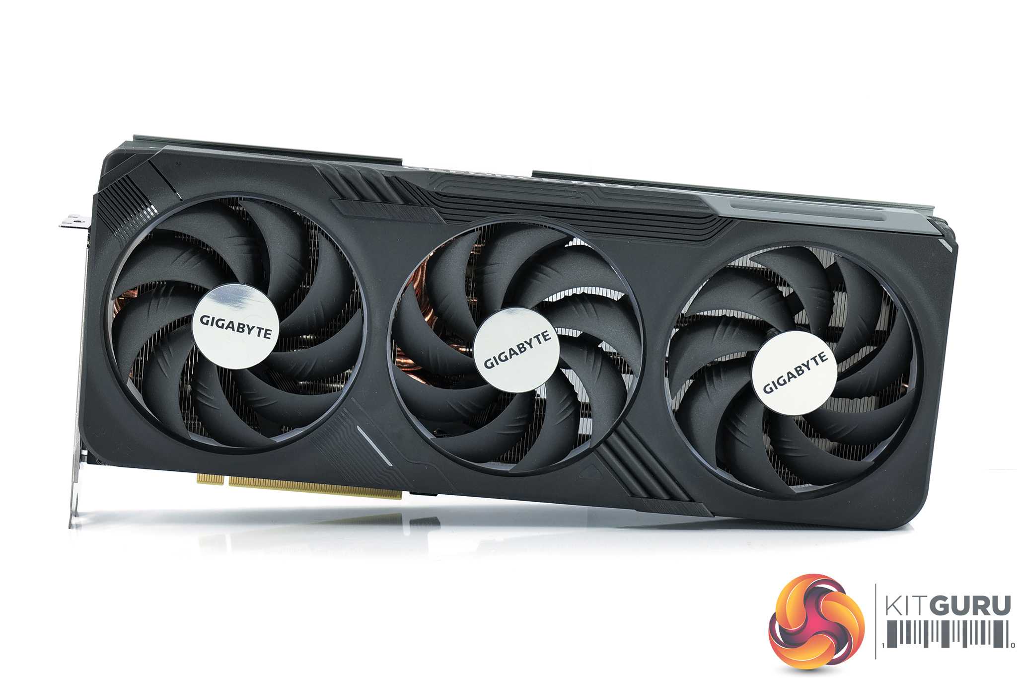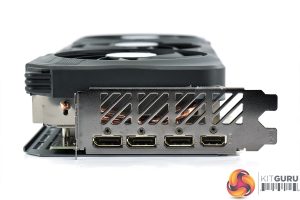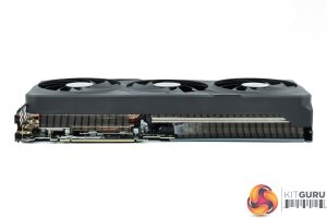 There's also three 100mm fans, using Gigabyte's so-called ‘Unique Blade Fan' design. As expected from a Gigabyte card, the central fan spins in reverse relative to the others, which Gigabyte claims helps to reduce airflow turbulence and therefore increase air pressure down into the heatsink.