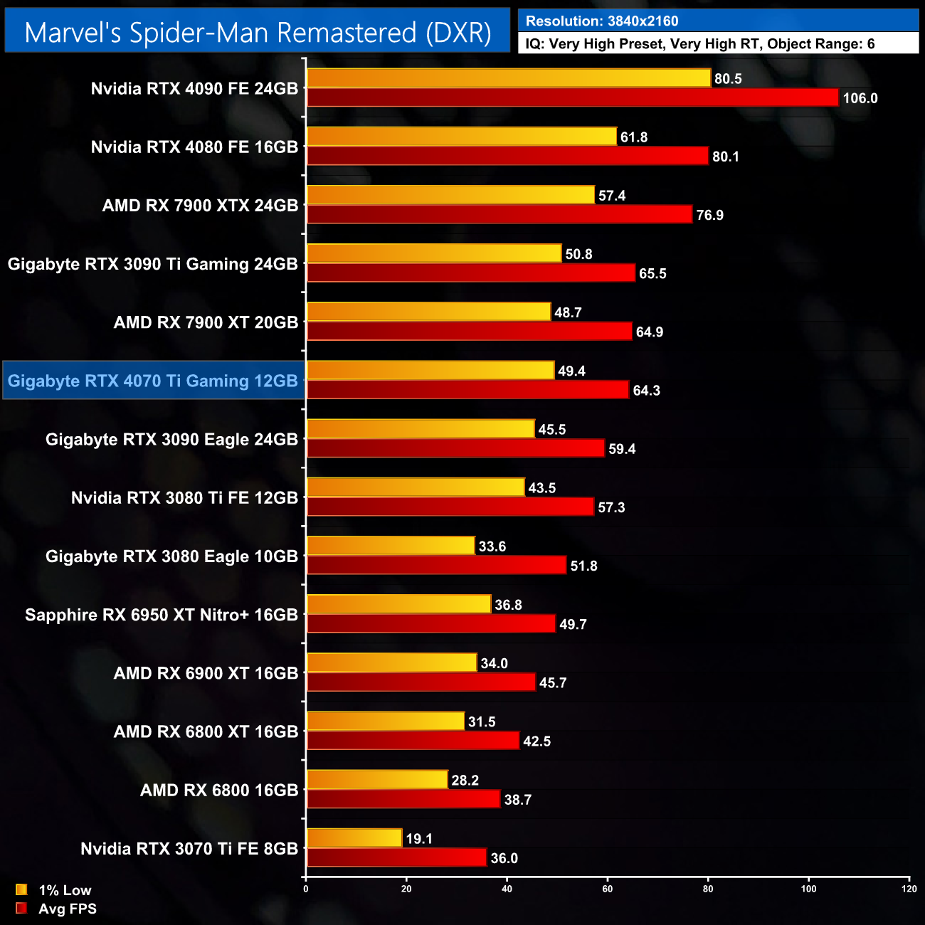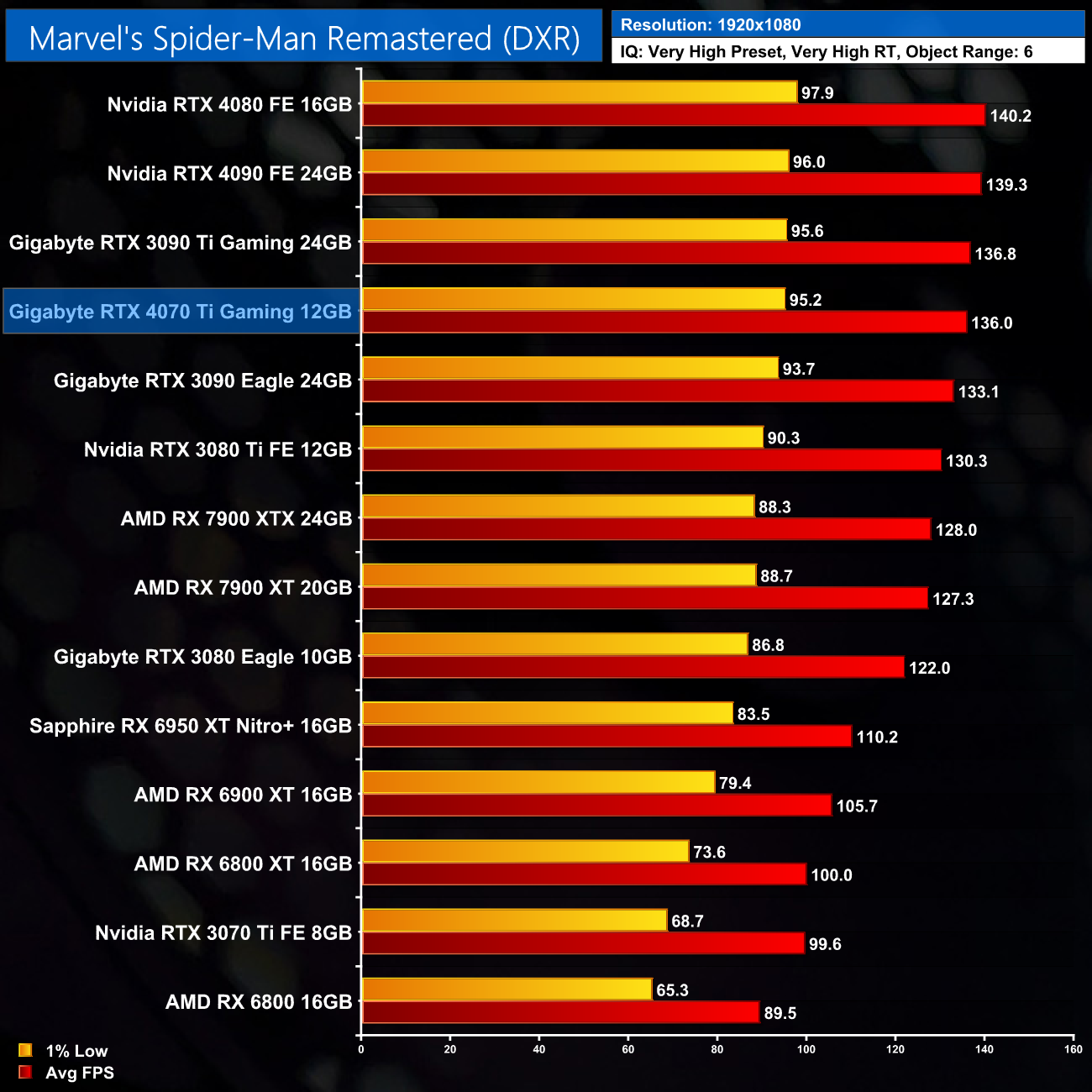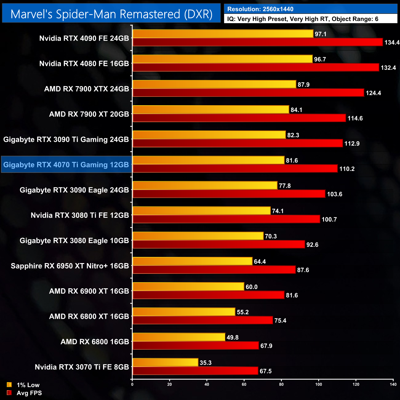 Spider-Man Remastered is next, where the 4070 Ti can average 110FPS with ray tracing enabled at 1440p, though this does also introduce a fair CPU bottleneck at this resolution.