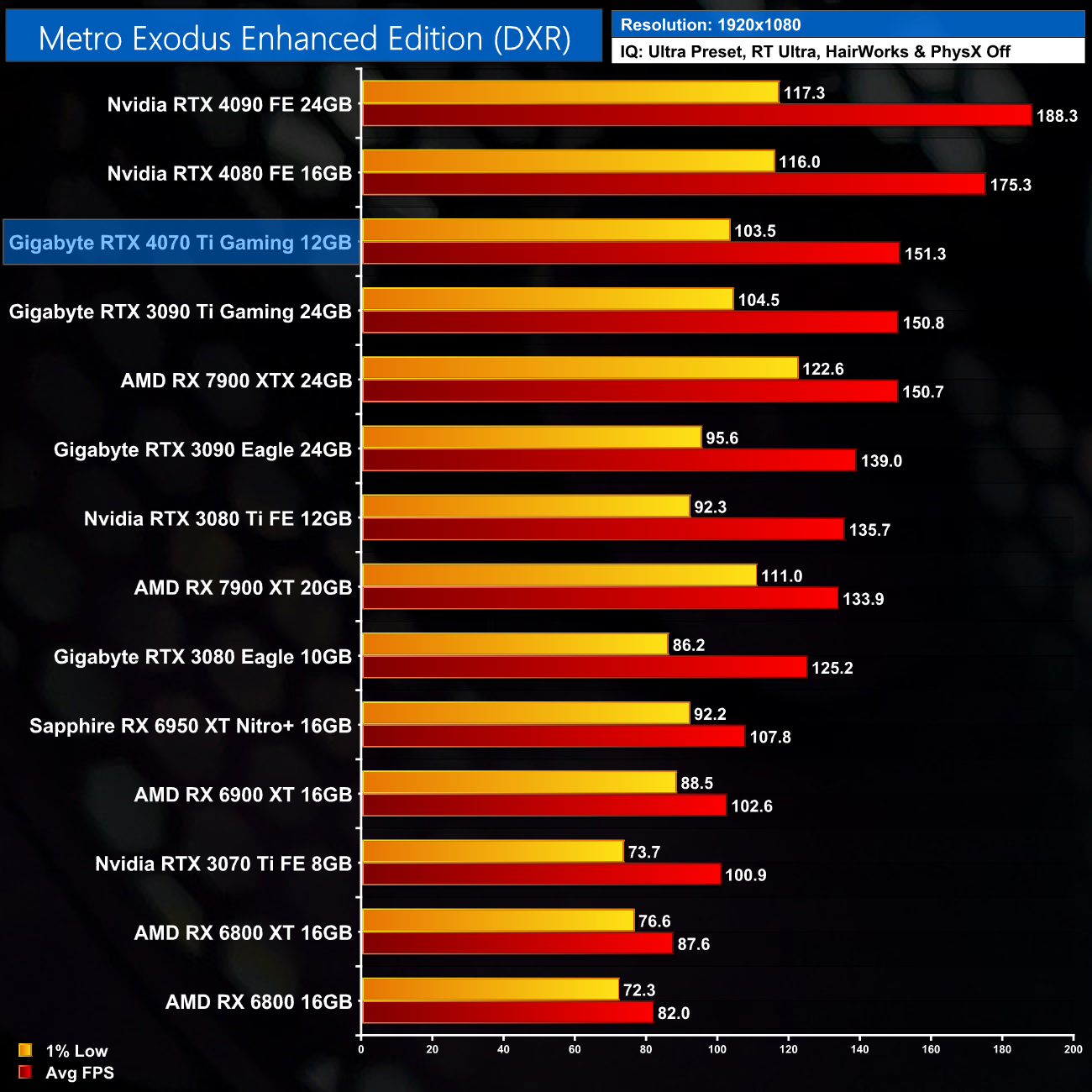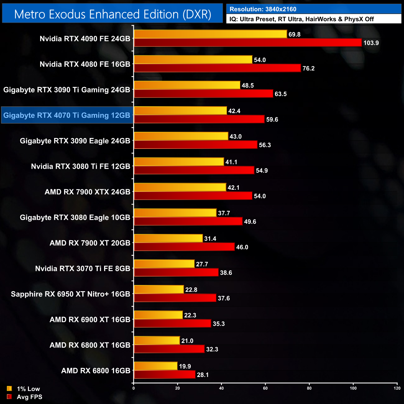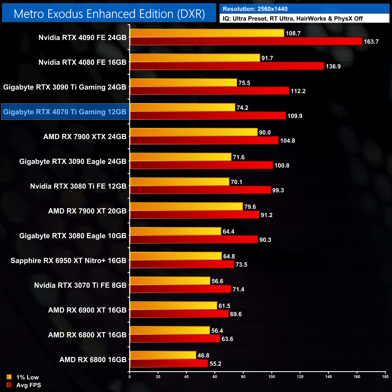 Metro Exodus Enhanced Edition also sees the RTX 4070 Ti edging-out the RX 7900 XTX, though with worse 1% low performance overall.