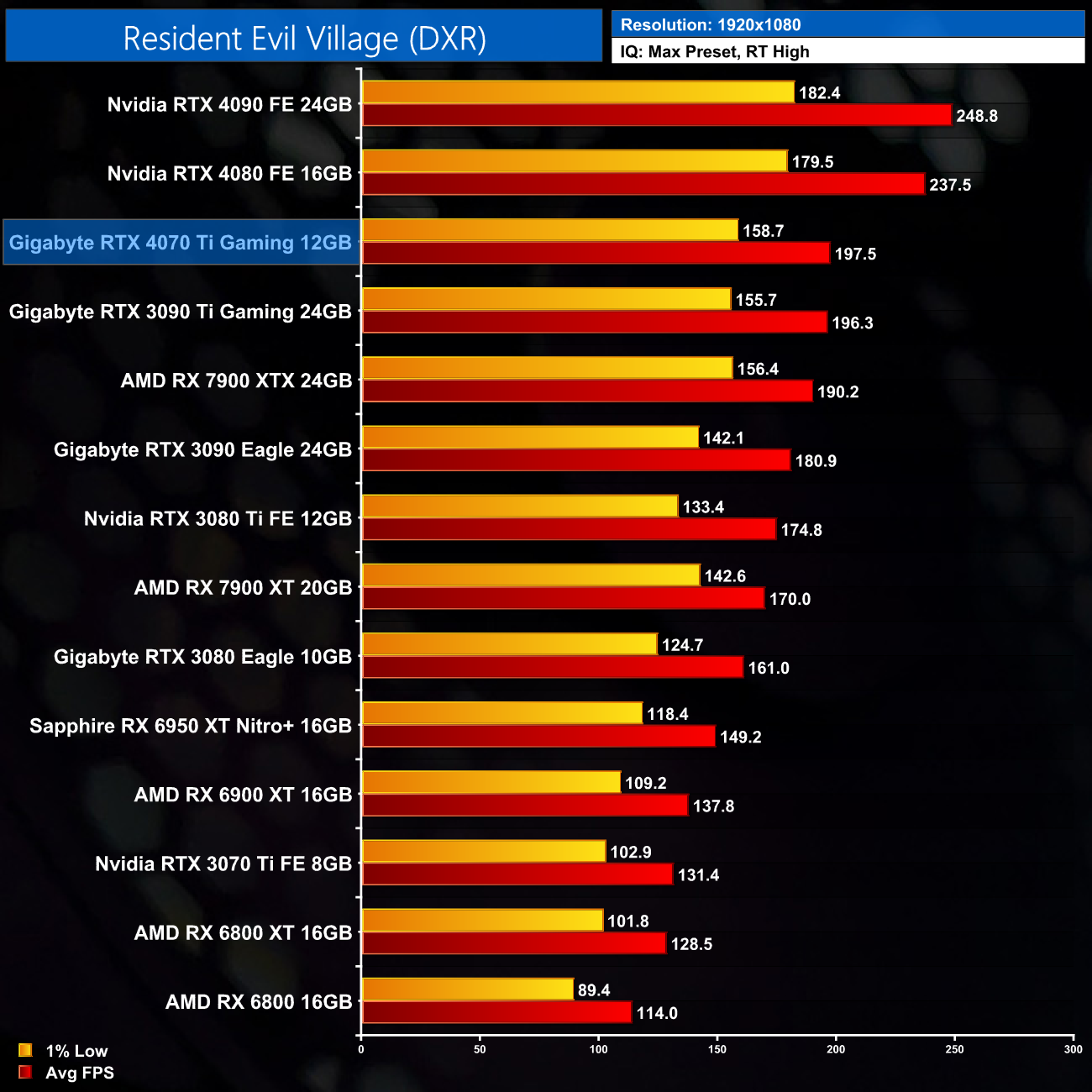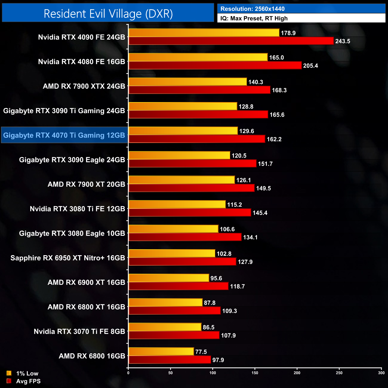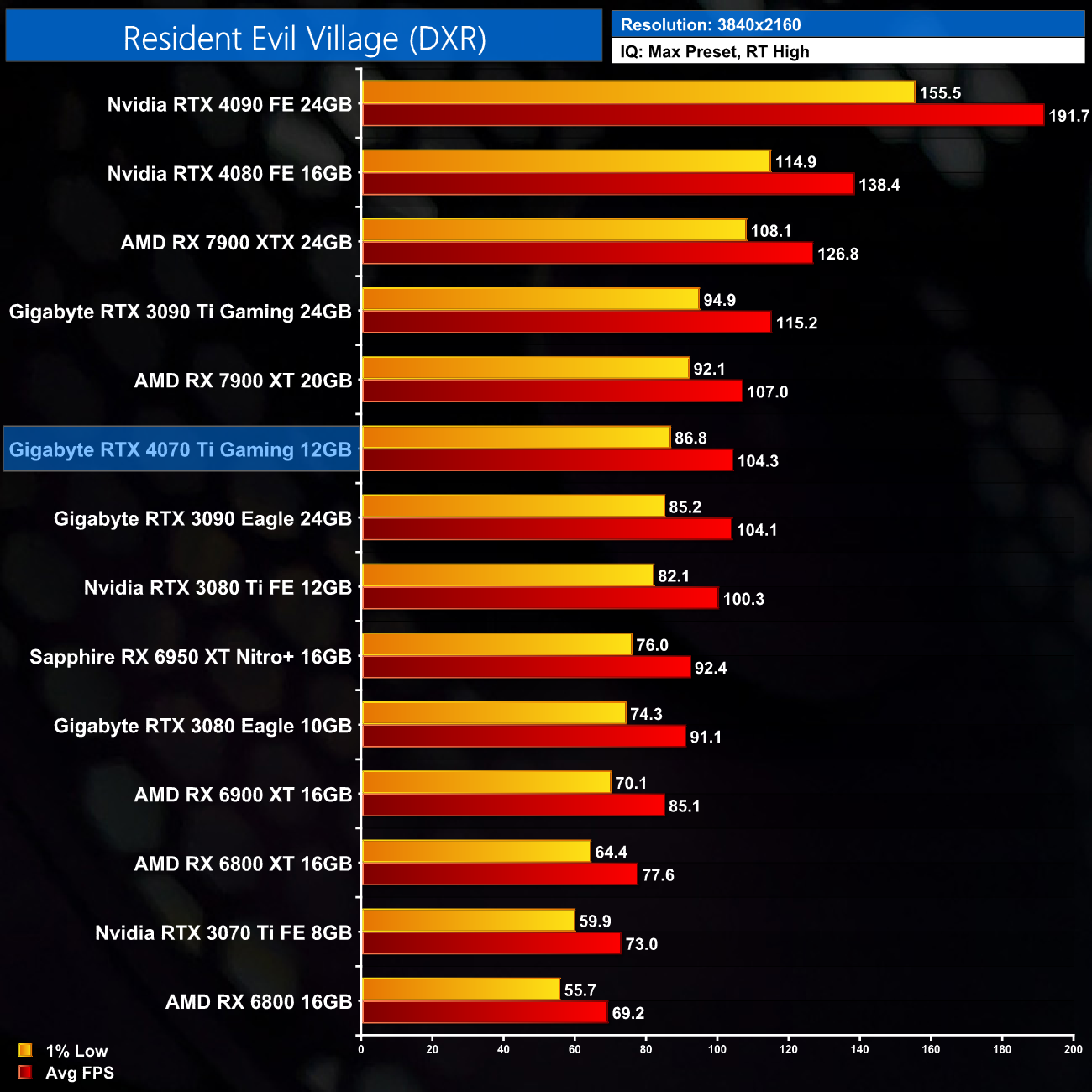 Lastly, for Resident Evil Village and its relatively light ray traced effects, the 4070 Ti is within 4% of the RX 7900 XTX at 1440p, while it's level with the RTX 3090 Ti.