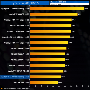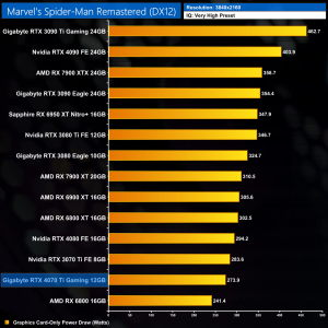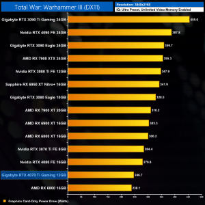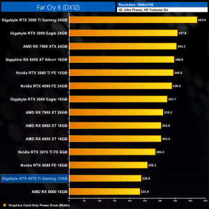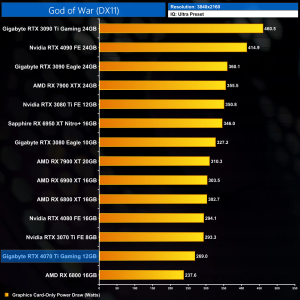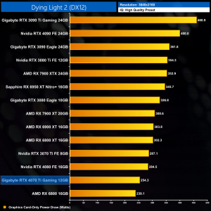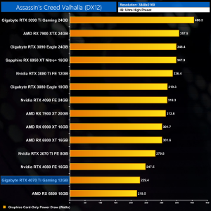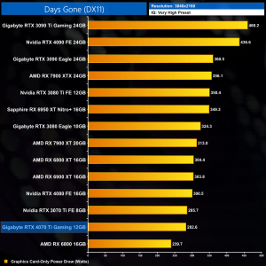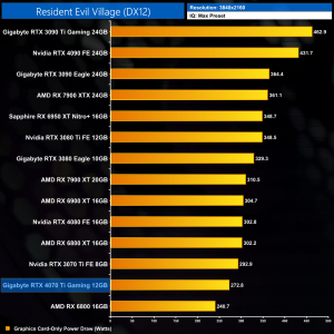 Lastly, up at 4K, we see a new average power draw of 255.5W. Certain games do push more than that – including Cyberpunk, Days Gone and Resident Evil Village (as shown above), but on average, that's 25W lower power draw than the RTX 4080, or just a 9% reduction.