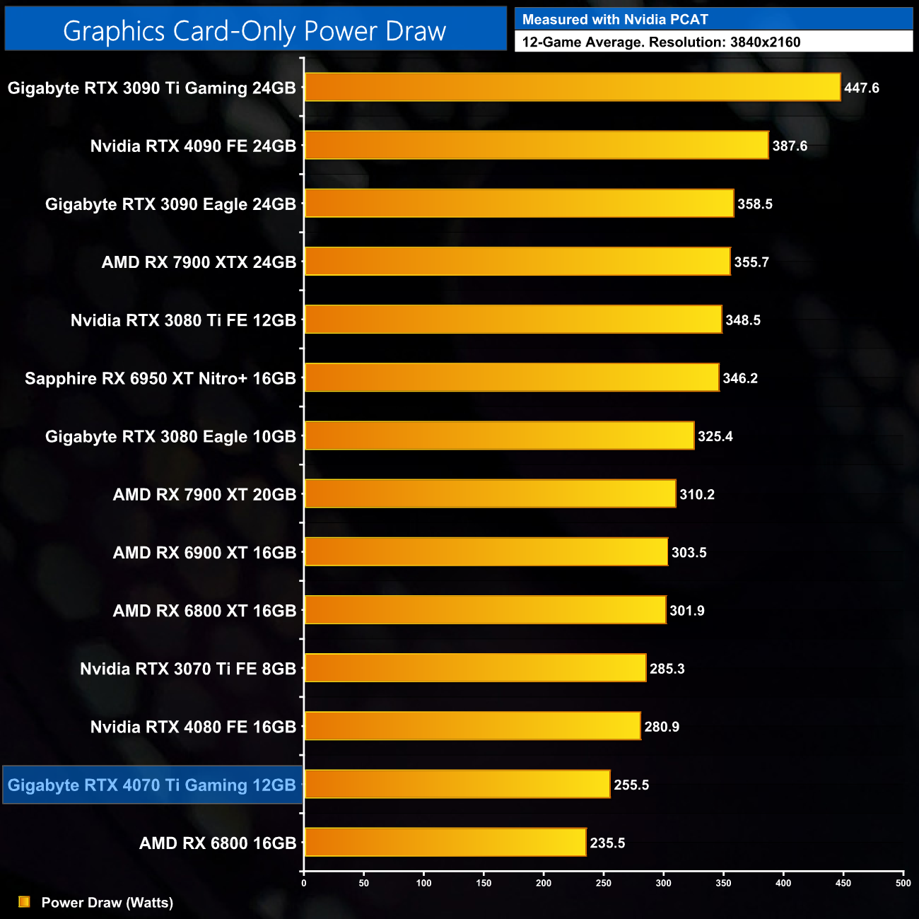 Here we present power draw figures for the graphics card-only, on a per-game basis for all twelve games we tested at 2160p (4K). This is measured using Nvidia's Power Capture Analysis Tool, also known as PCAT. You can read more about our updated power draw testing methodology HERE.