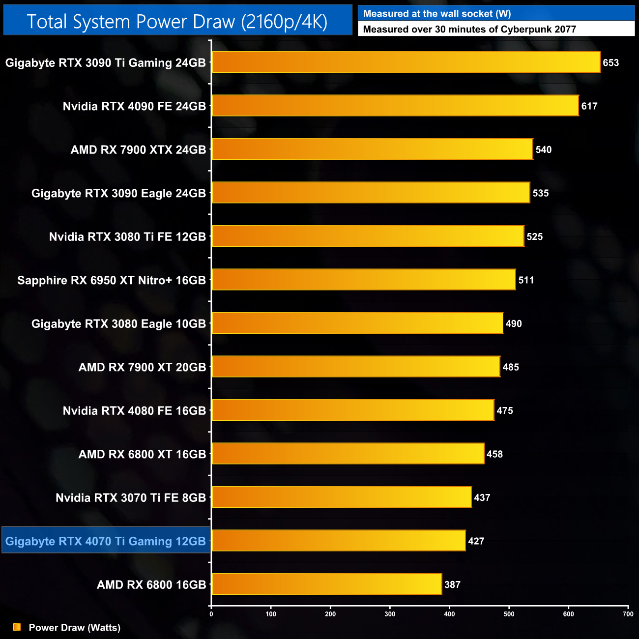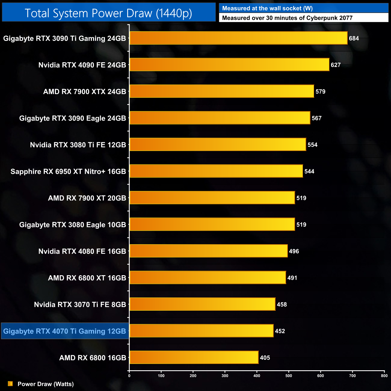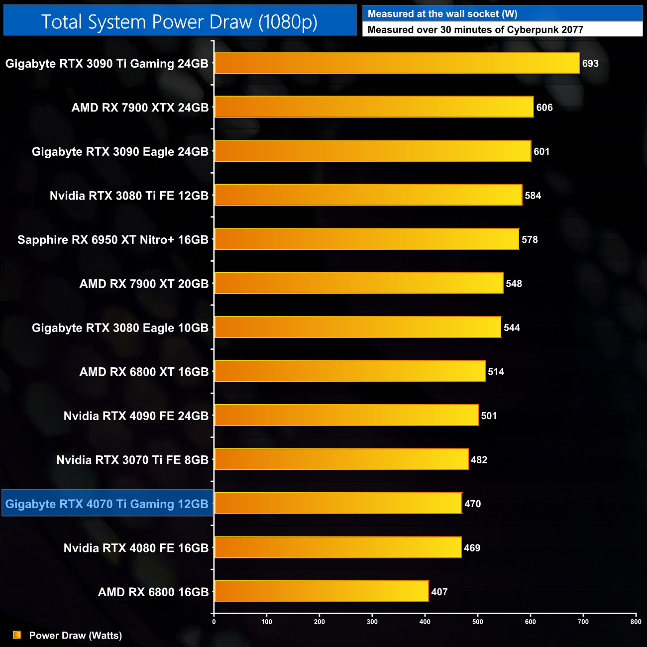 In terms of total system power draw, we measured a peak of 470W in Cyberpunk 2077 when running at 1080p, with less power drawn at 1440p and 4K. Nvidia officially recommends a 700W power supply.