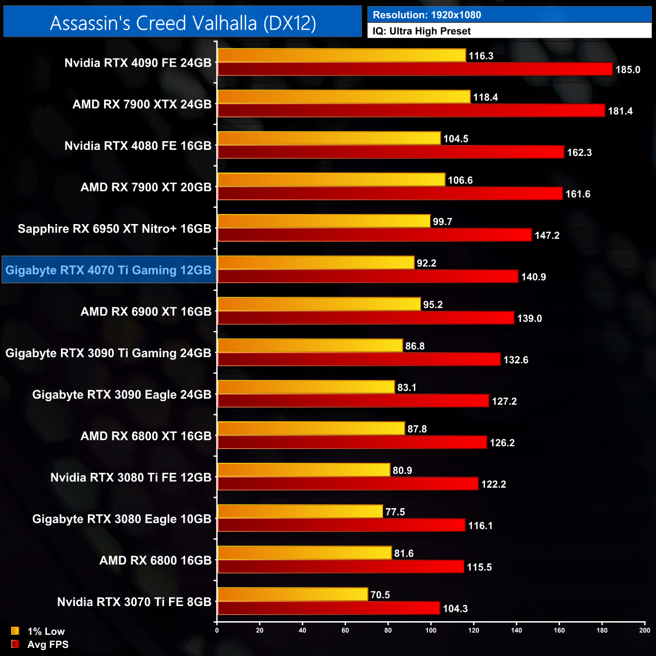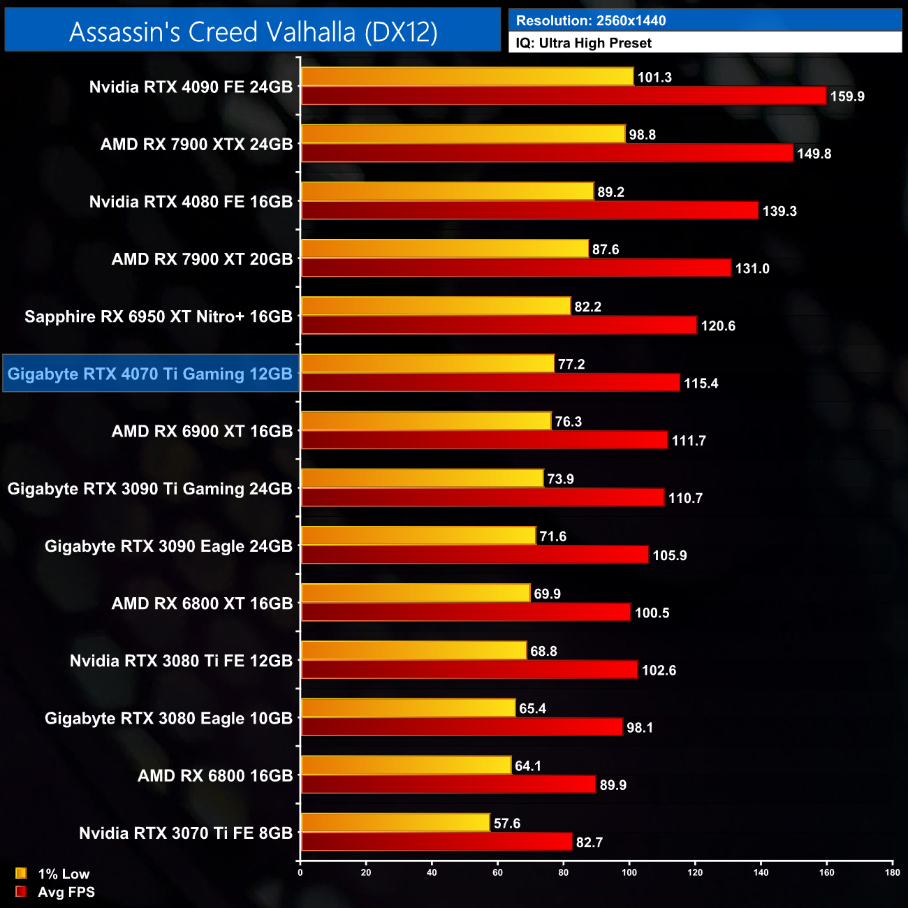 As ever, we start our game benchmarks with Assassin's Creed Valhalla. At 1440p, the RTX 4070 Ti is sandwiched by the AMD 6900 XT and 6950 XT, with the new Ada-based GPU averaging 115FPS. This makes it 4% faster than the RTX 3090 Ti, while it trails the RX 7900 XT by 12%.