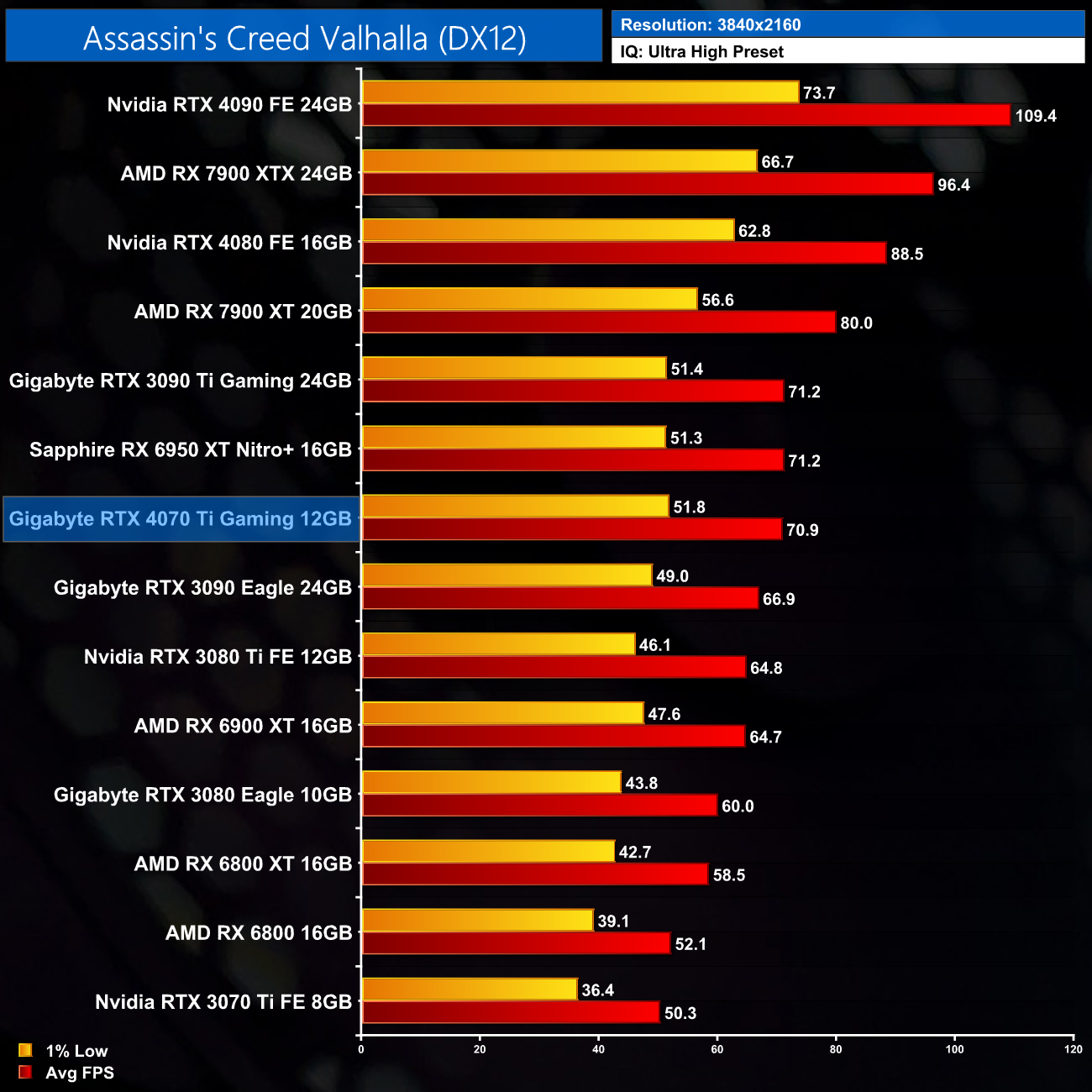 At 4K, it still holds out fairly well, averaging just over 70FPS, putting it level with the RTX 3090 Ti and 6950 XT. That makes it a good 20% slower than the RTX 4080, and it's 11% behind the 7900 XT.