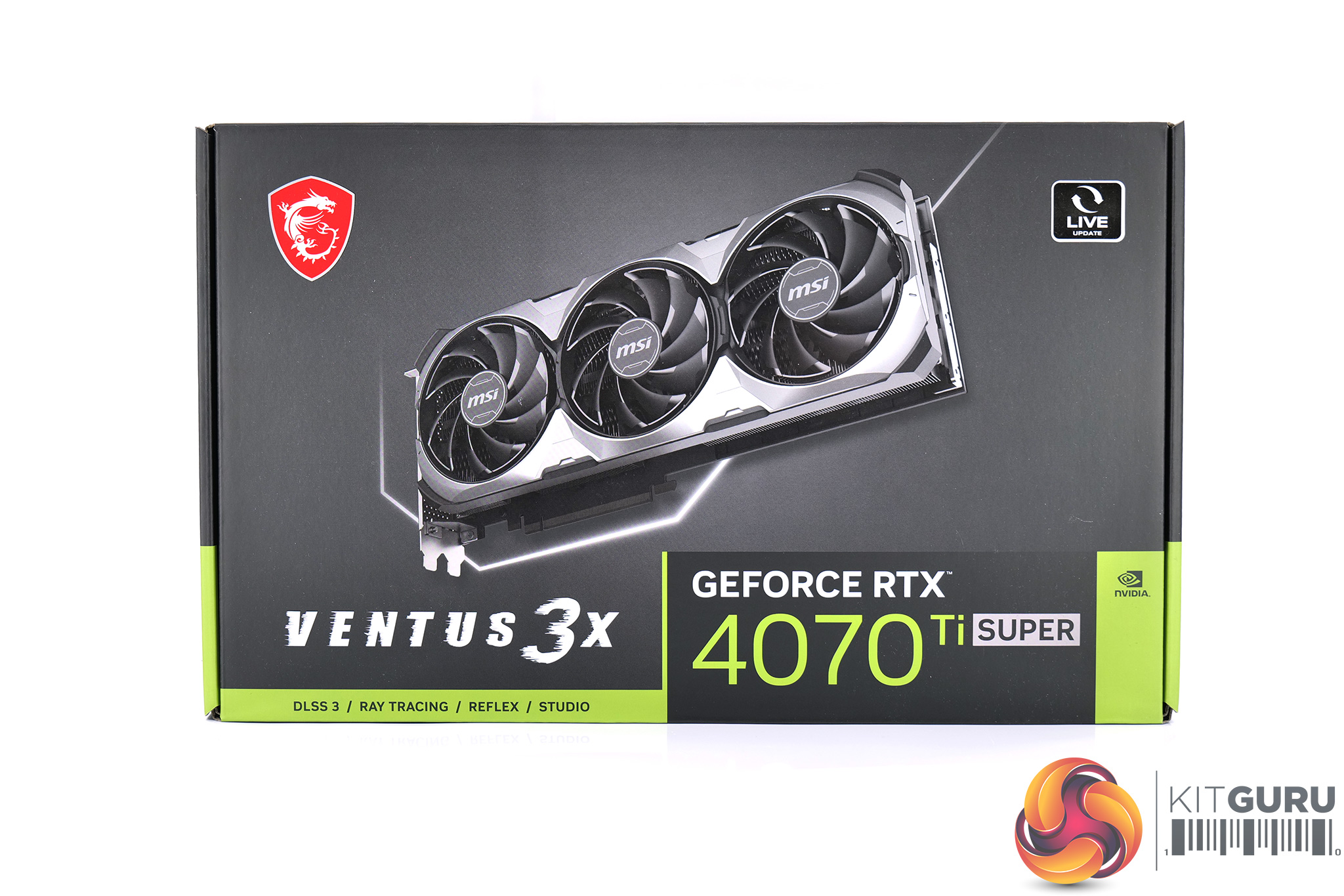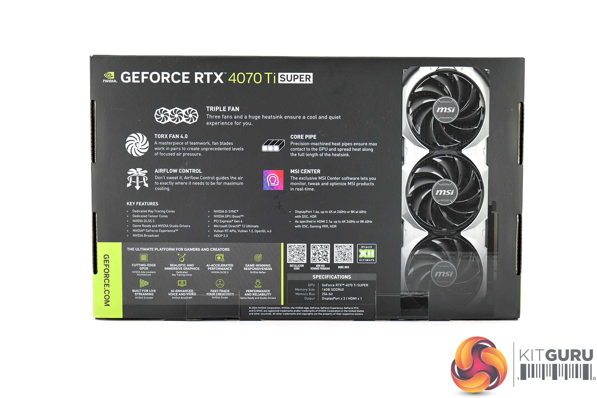 The MSI RTX 4070 Ti Super Ventus 3X ships in a black box, with a large image of the graphics card visible on the front. On the back, MSI highlights various key features of the card and its cooler.
