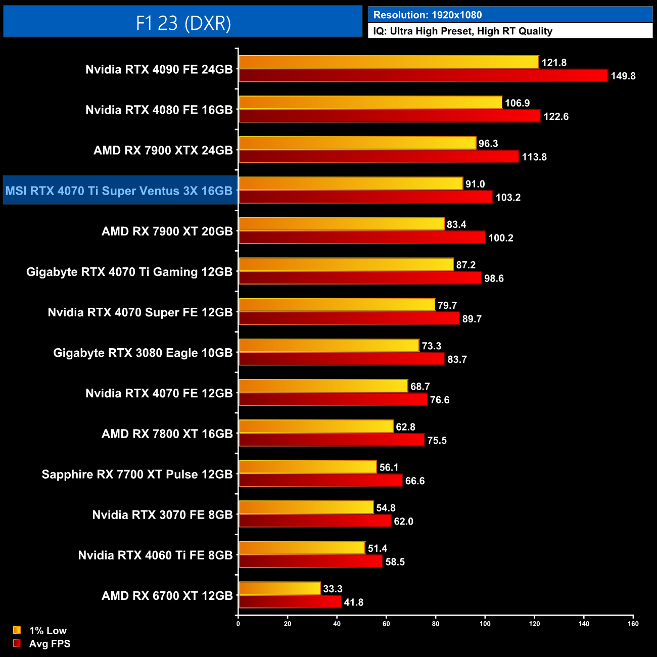AMD GPUs fare a lot better in F1 23, with the 4070 Ti Super coming in 7% faster than the RX 7900 XT. It's also a 5% gain compared to the original 4070 Ti at 1440p.