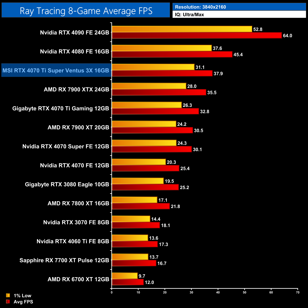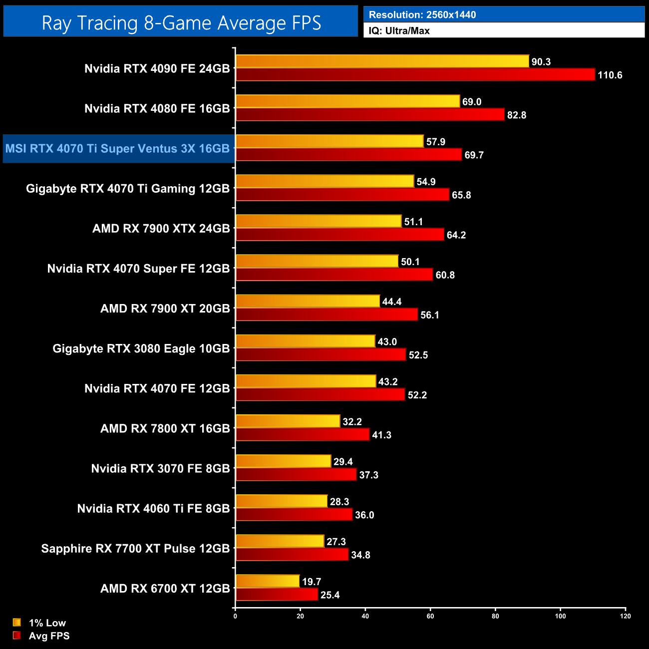 On average, over the eight ray traced games tested, the 4070 Ti Super is 6% faster than the 4070 Ti, so performance scaling is very similar to what we saw from our rasterised games. Nvidia does have a clear lead over AMD however, with the Ti Super 24% faster than the 7900 XT at 1440p, and 9% ahead of the 7900 XTX.