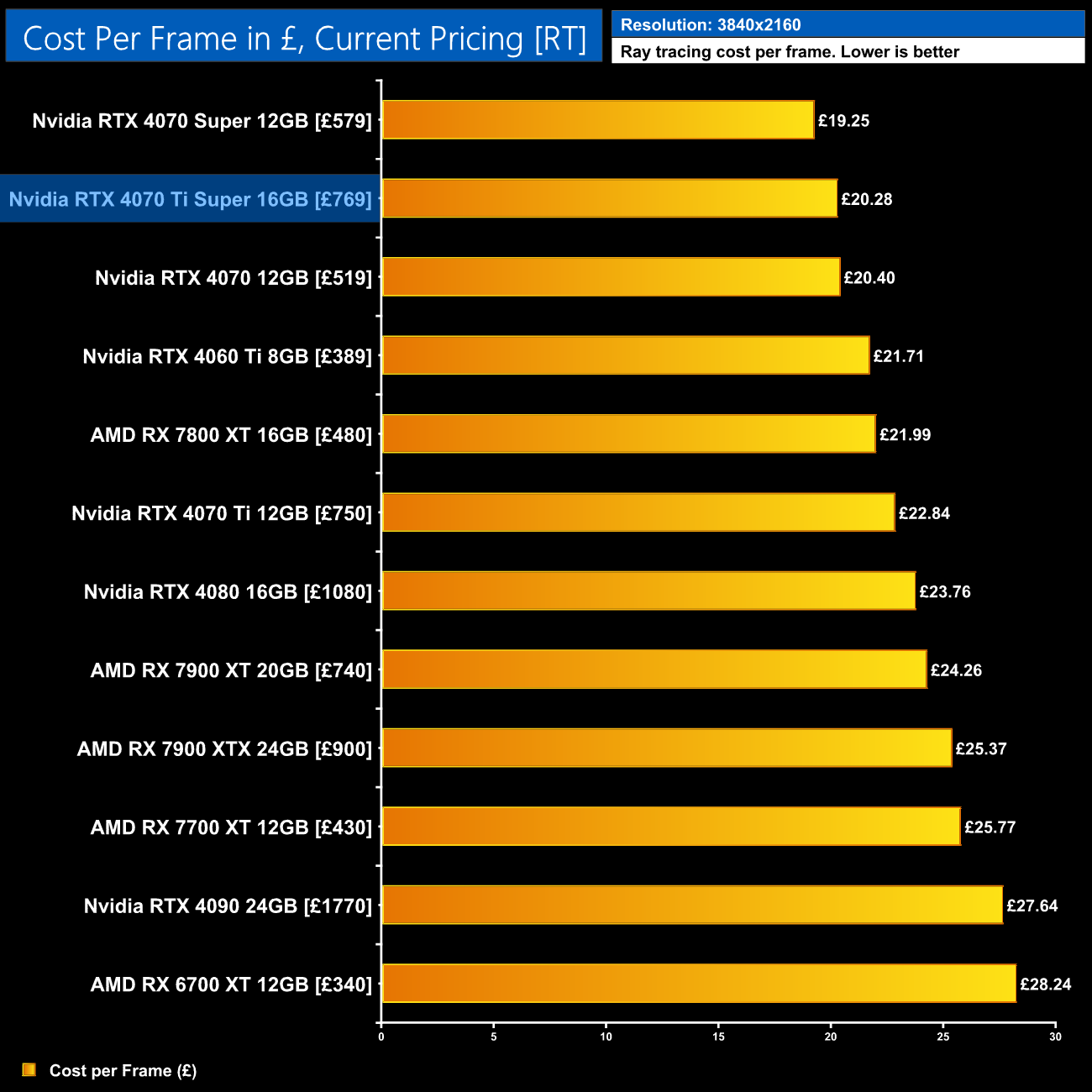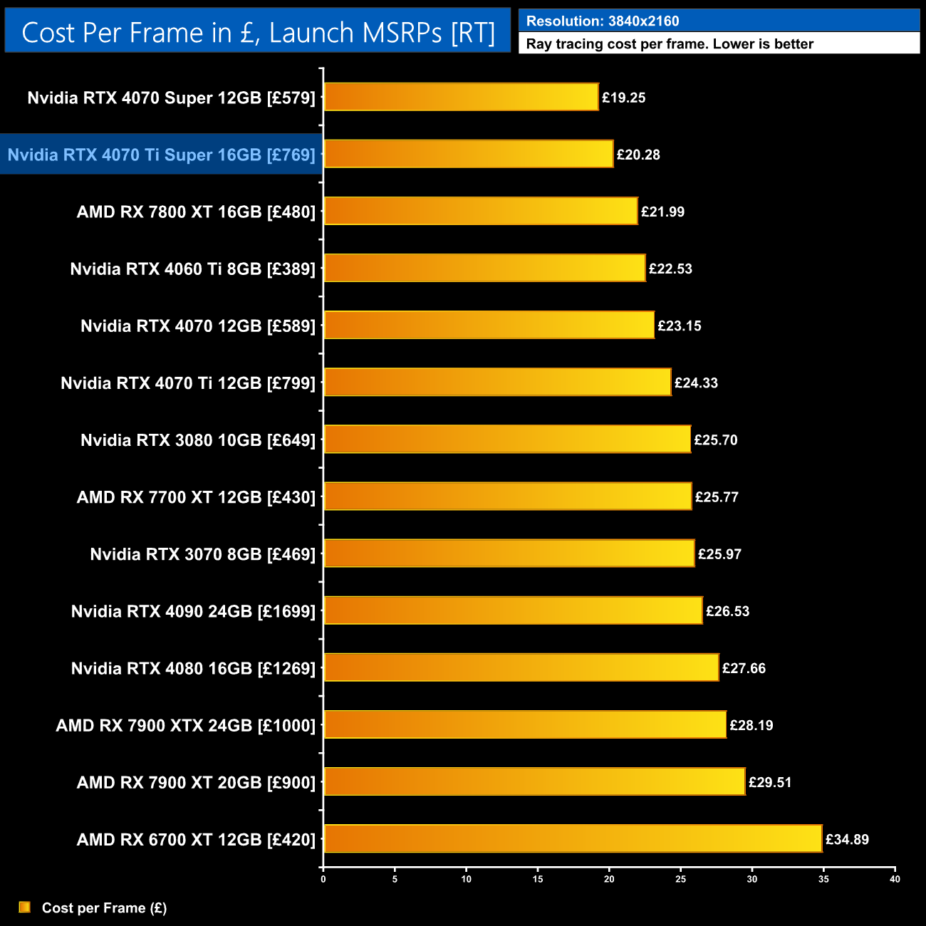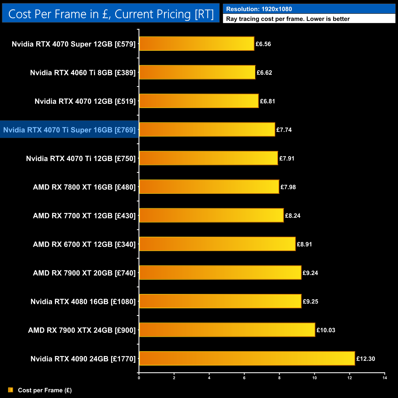 As such, cost per frame for ray tracing clearly shows Nvidia GPUs to be the best value. The 4070 Ti Super can't match the 4070 Super here, but it is substantially better than the likes of the RTX 4080.