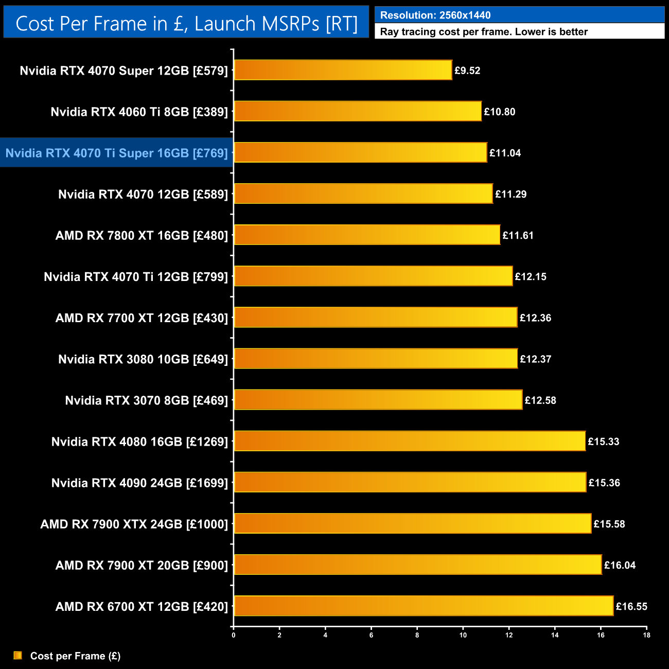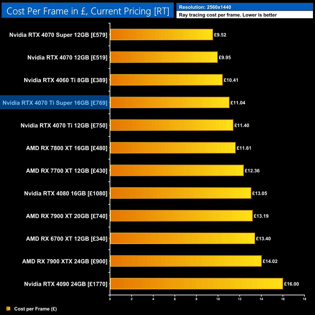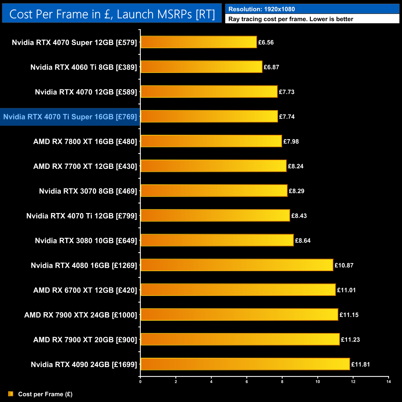 As such, cost per frame for ray tracing clearly shows Nvidia GPUs to be the best value. The 4070 Ti Super can't match the 4070 Super here, but it is substantially better than the likes of the RTX 4080.