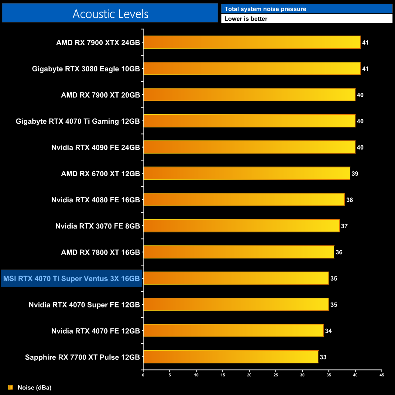 We take our noise measurements with the sound meter positioned 1 foot from the graphics card. I measured the noise floor to be 32 dBA, thus anything above this level can be attributed to the graphics cards. The power supply is passive for the entire power output range we tested all graphics cards in, while all CPU and system fans were disabled. A reading under load comes from running Cyberpunk 2077 for 30 minutes.