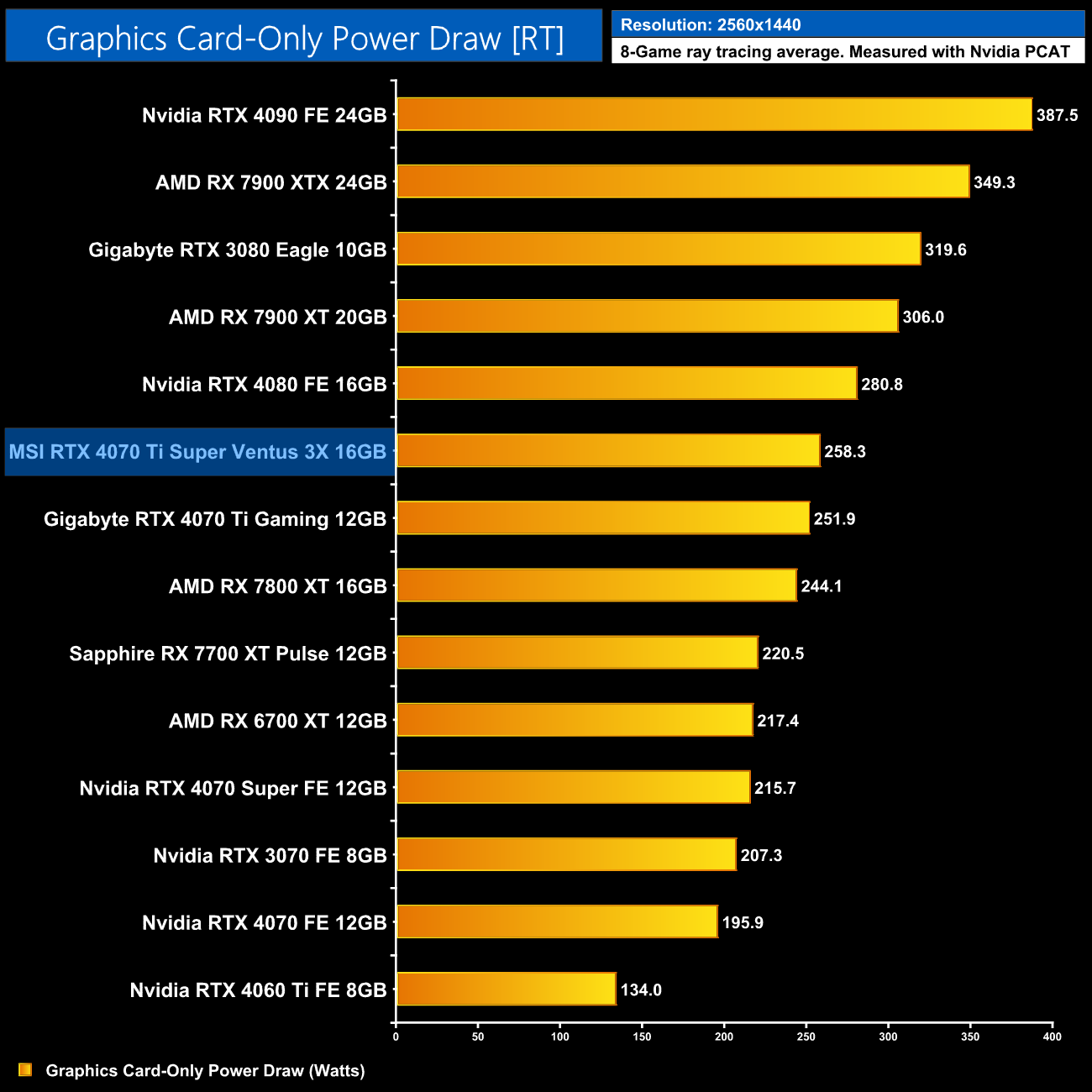 Here we present power draw figures for the graphics card-only, on a per-game basis for all twelve games we tested at 1440p. This is measured using Nvidia's Power Capture Analysis Tool, also known as PCAT. You can read more about our updated power draw testing methodology HERE.