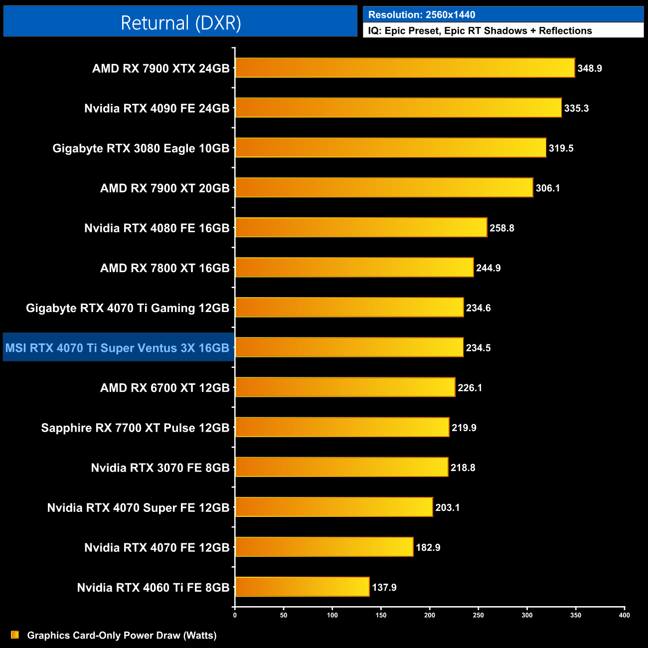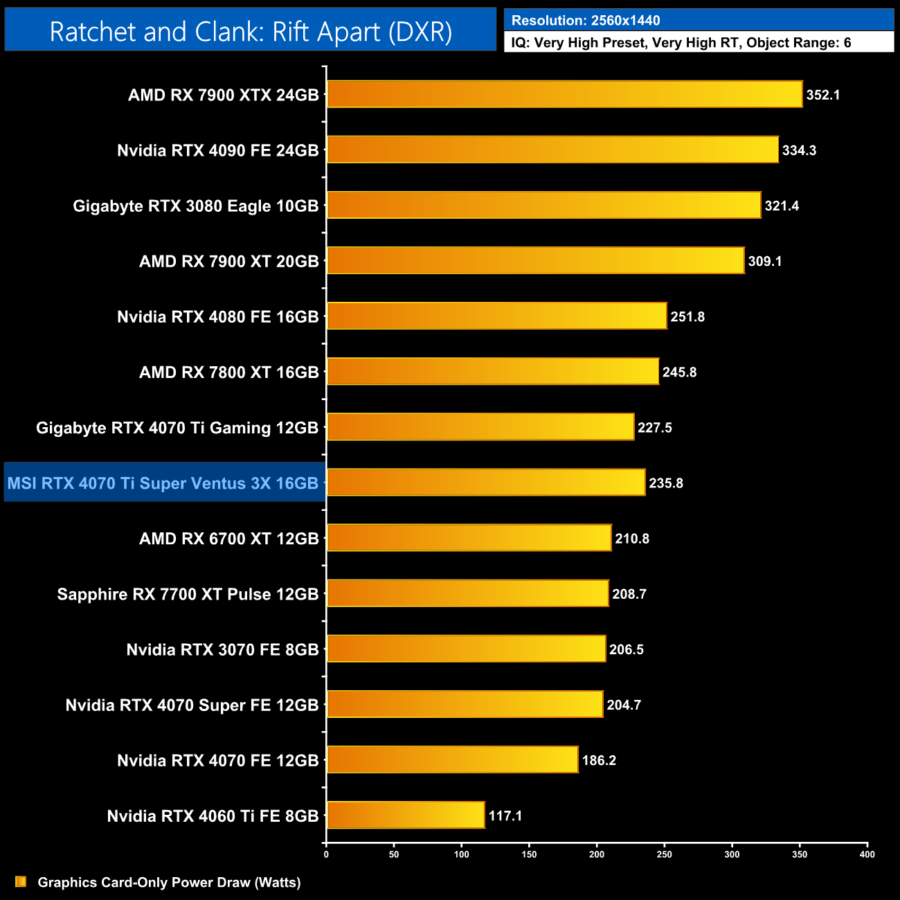 Power draw does increase at 1440p, this time averaging 247.8W. That's just a 6W increase over the original 4070 Ti and is on par with the RX 7800 XT, which gives you an idea about how much more efficient Ada Lovelace GPUs are compared to their RDNA 3 rivals.