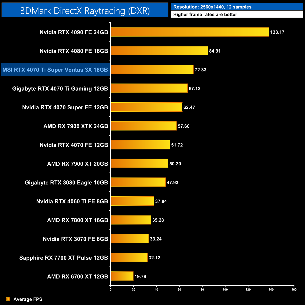 On average, over the eight ray traced games tested, the 4070 Ti Super is 6% faster than the 4070 Ti, so performance scaling is very similar to what we saw from our rasterised games. Nvidia does have a clear lead over AMD however, with the Ti Super 24% faster than the 7900 XT at 1440p, and 9% ahead of the 7900 XTX.
