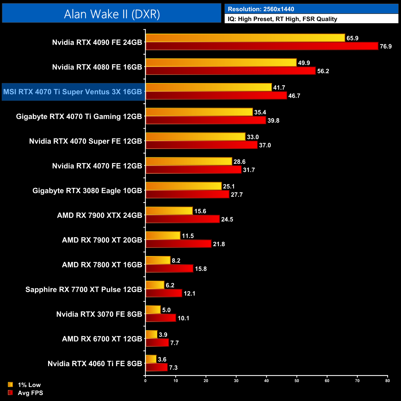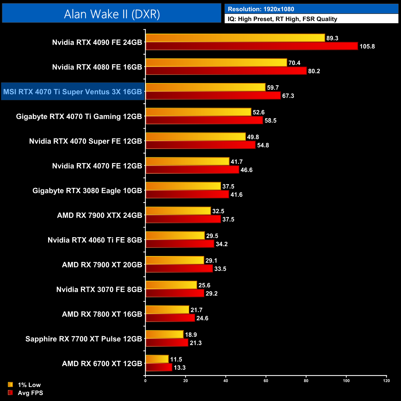 Starting our ray tracing benchmarks with Alan Wake II, here the 4070 Ti Super is the third-fastest card on our chart, averaging 47FPS at 1440p and that actually makes it 17% faster than the 4070 Ti – which is much more like it! It's also over twice as fast as the 7900 XT here.