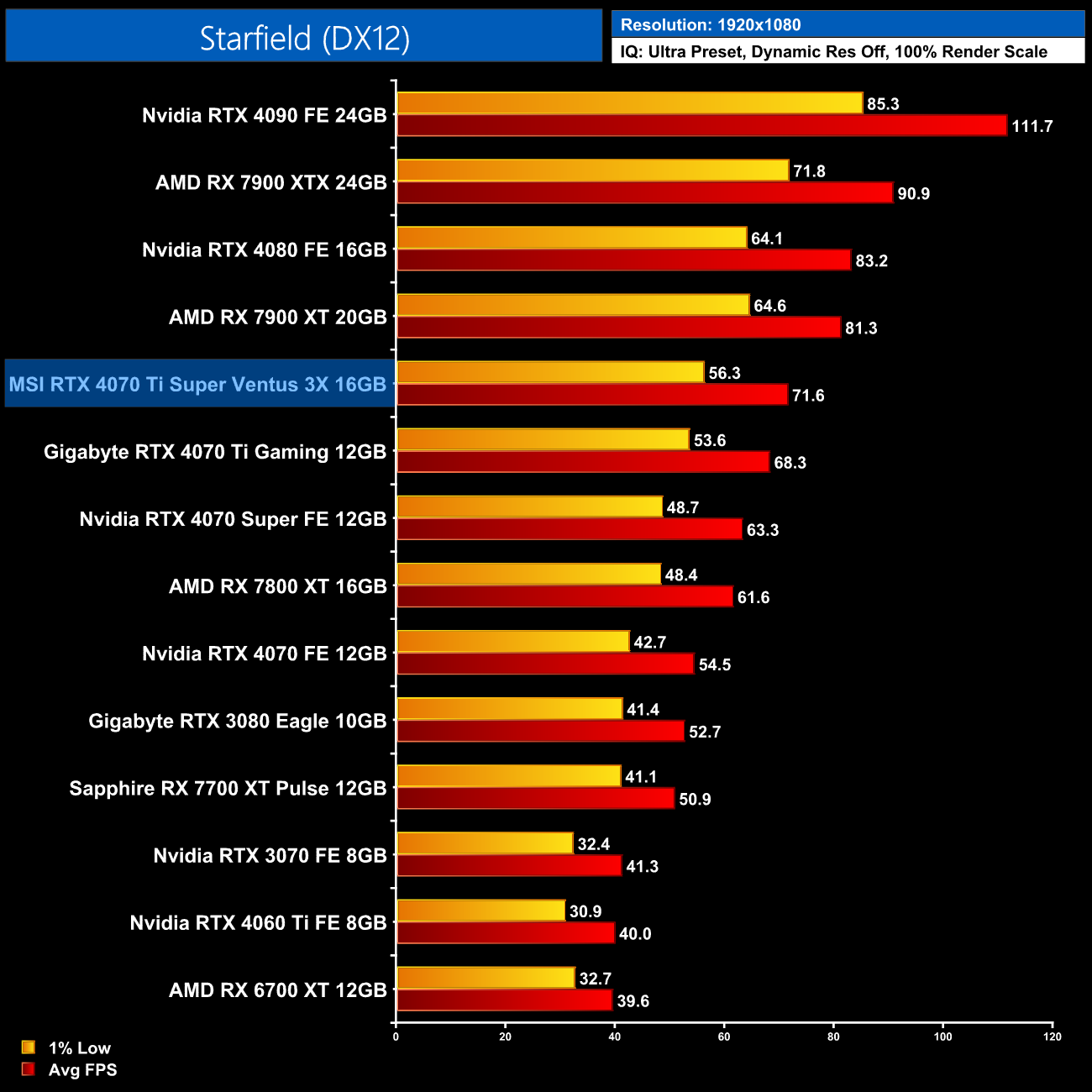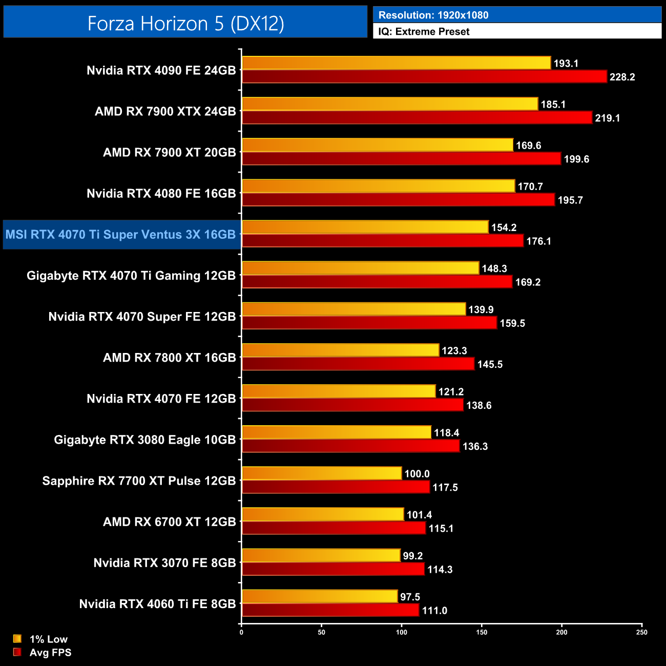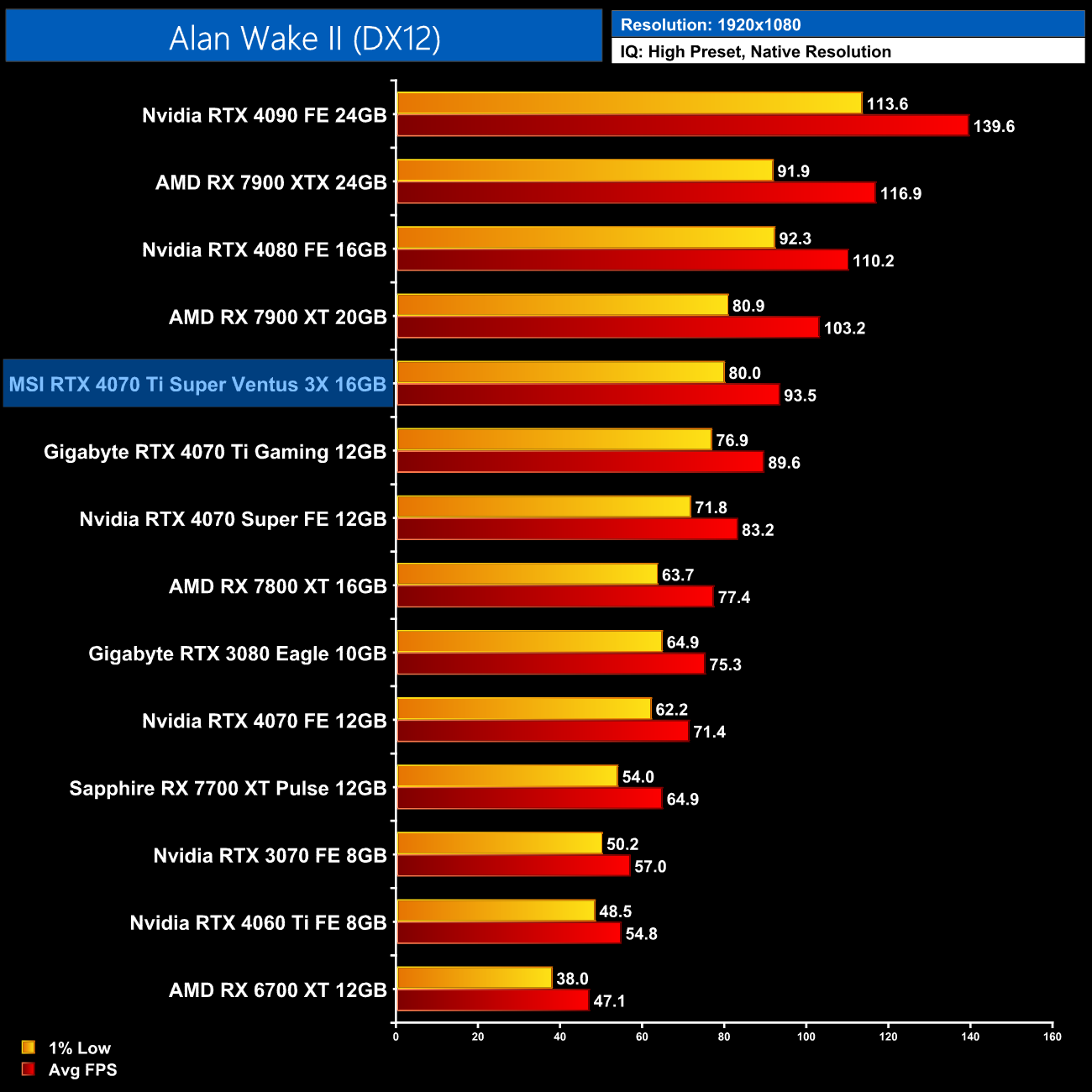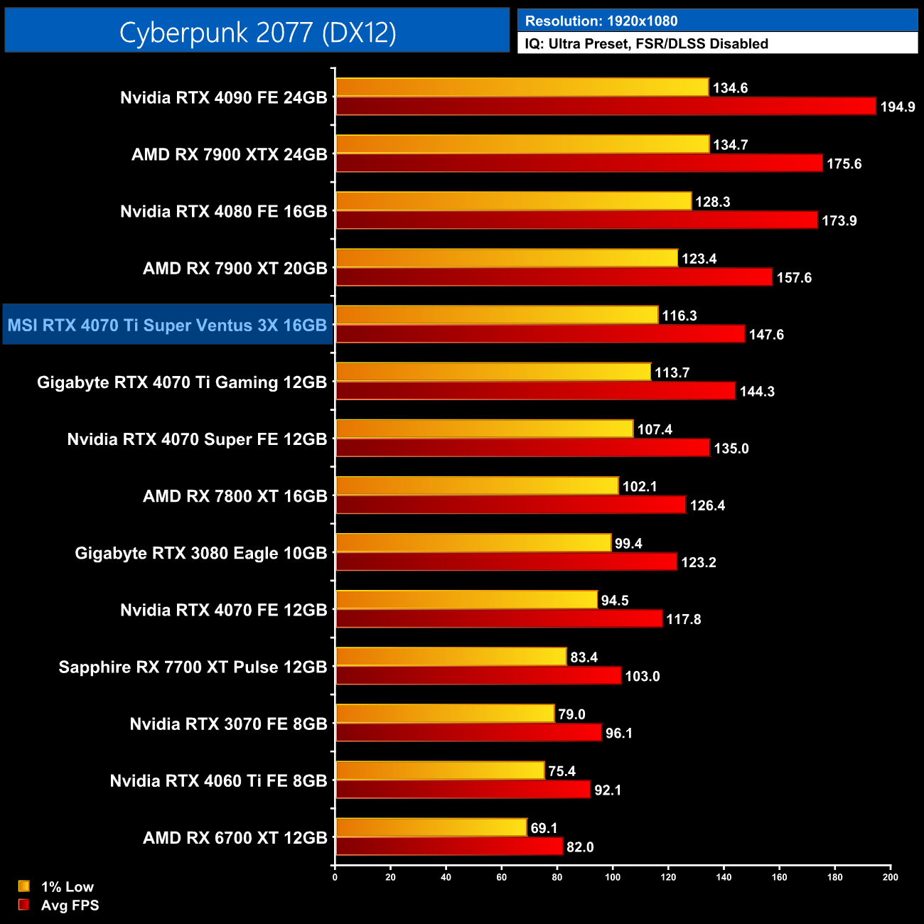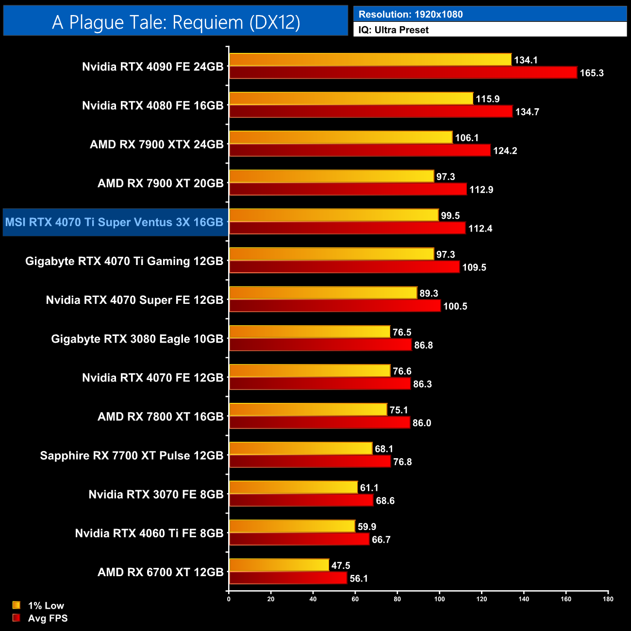 Before we talk about performance, we do need to provide some context to the data shown in this review. As mentioned on page four of this review, Nvidia got in touch with us on Sunday night, letting us know there was an issue with the MSI Ventus 3X graphics card that Nvidia provided us for this review, and performance is 5% lower than what Nvidia expected from other 4070 Ti Supers. Nvidia also provided a new BIOS for the Ventus 3X which was said to reduce this gap to 3%, but in my testing it made next to no difference to overall performance. A second updated BIOS was also provided to us just two hours before publication of this review, though needless to say we were unable to test that before going live.