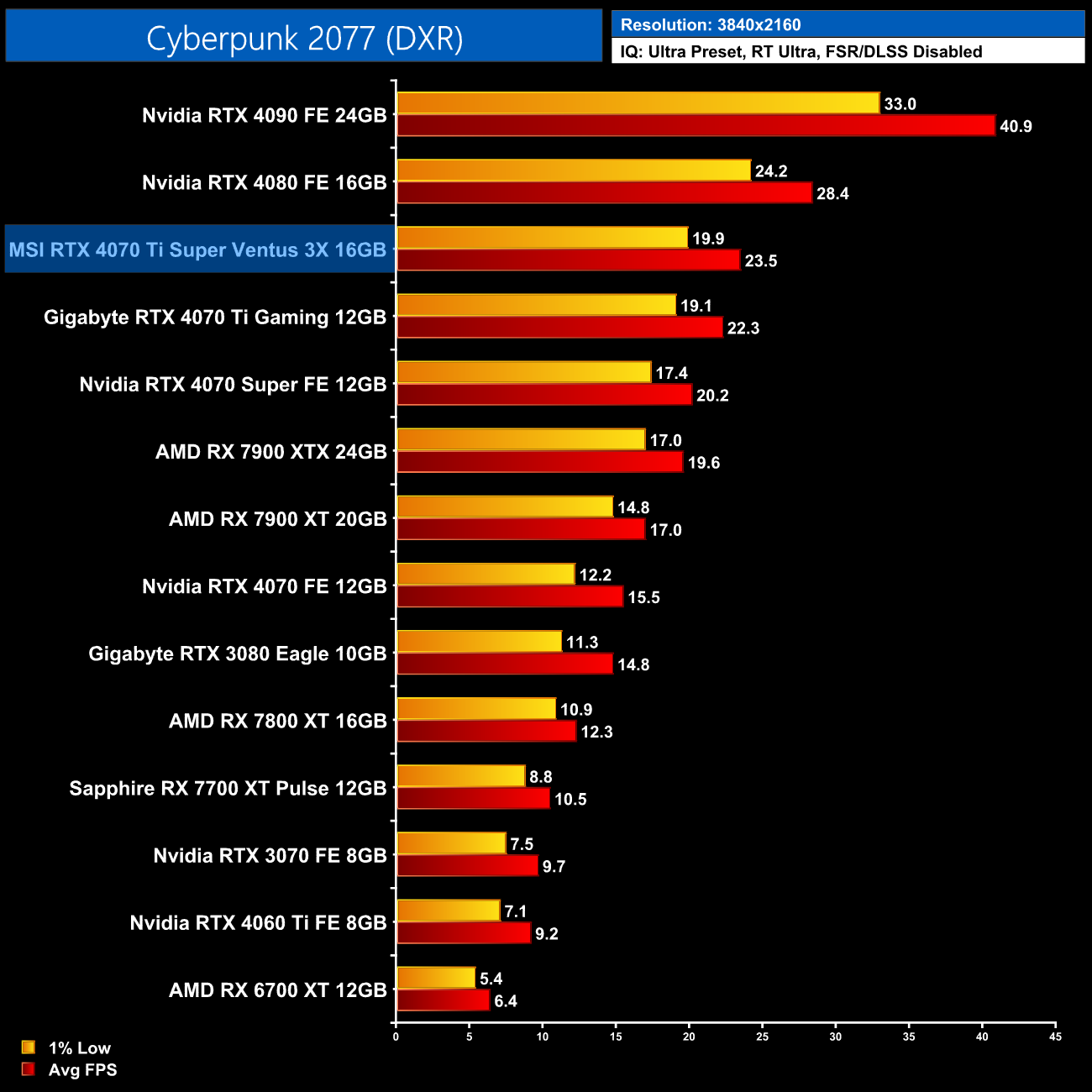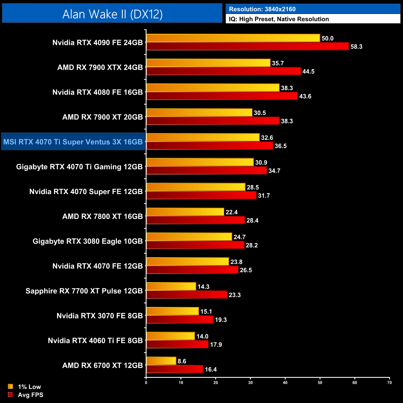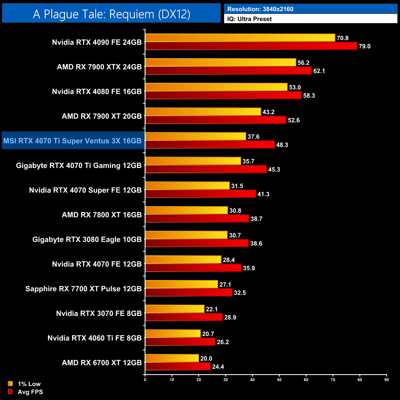 4K is another example of the benefit of a 16GB framebuffer though. The RTX 4070 Ti and other 12GB cards drop off significantly, whereas the 4070 Ti Super stays smooth and averages 38FPS – making it 50% faster than the non-Super model.