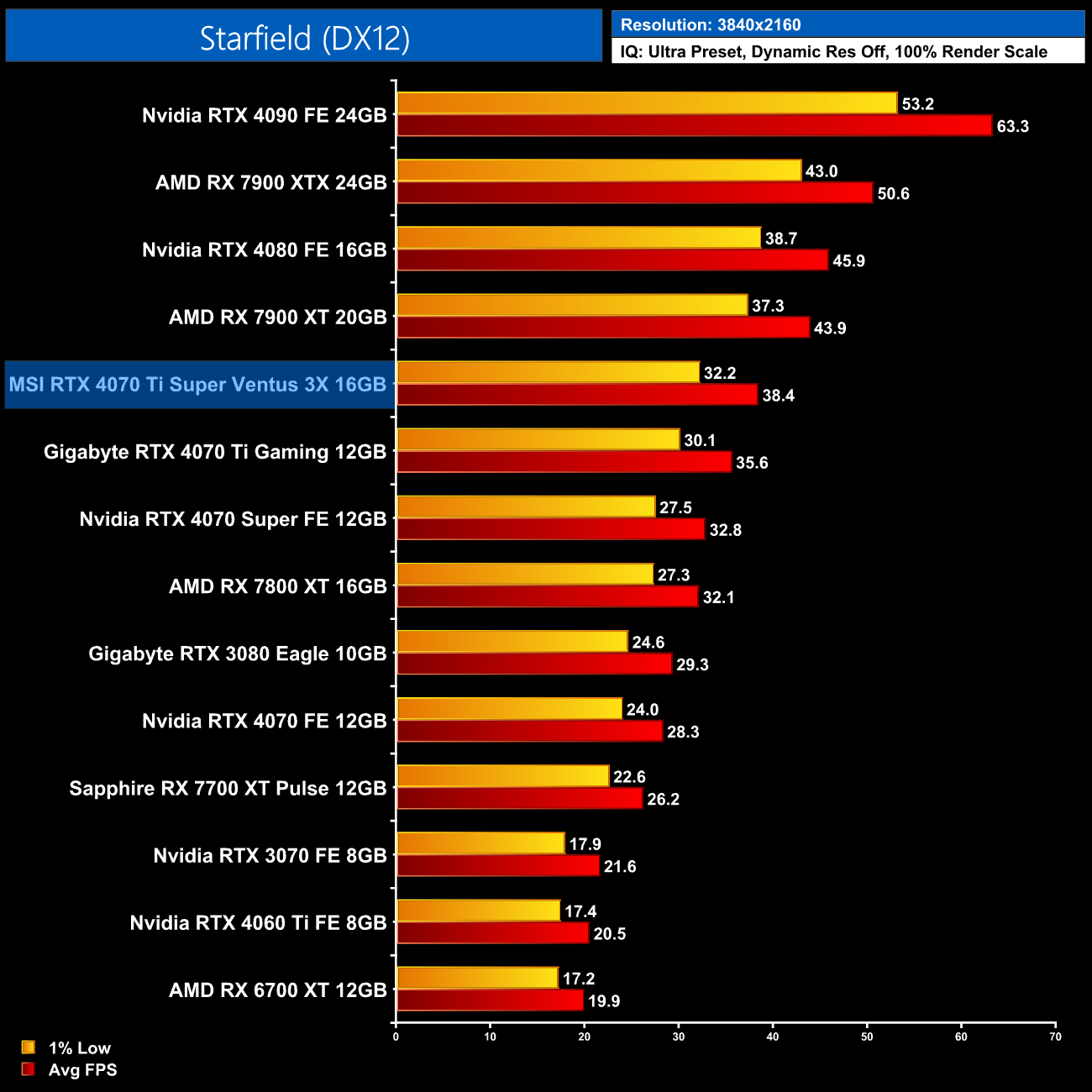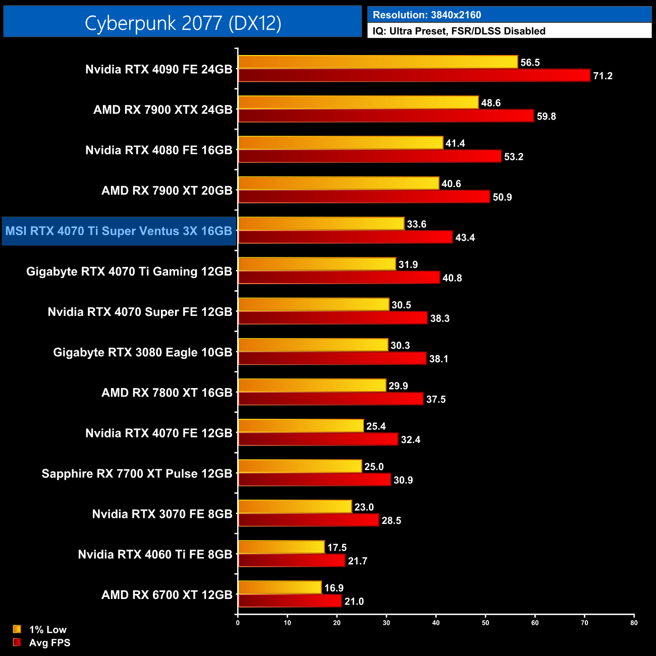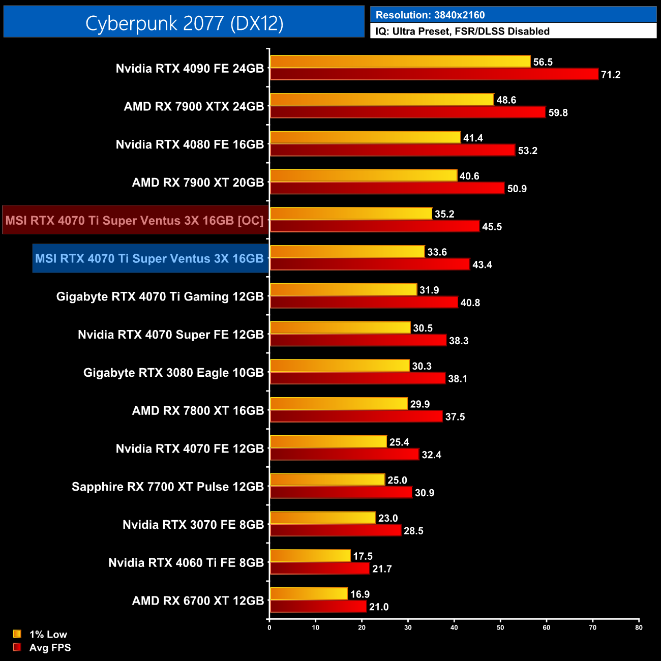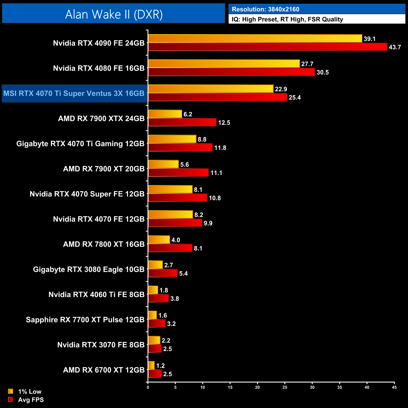 4K is another example of the benefit of a 16GB framebuffer though. The RTX 4070 Ti and other 12GB cards drop off significantly, whereas the 4070 Ti Super stays smooth and averages 38FPS – making it 50% faster than the non-Super model.
