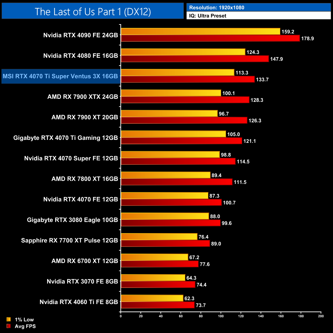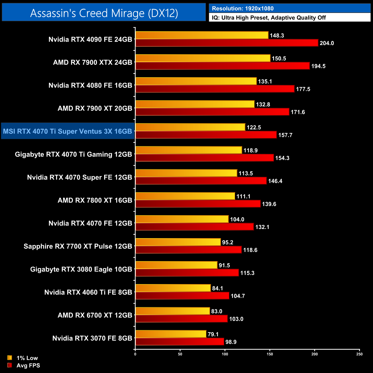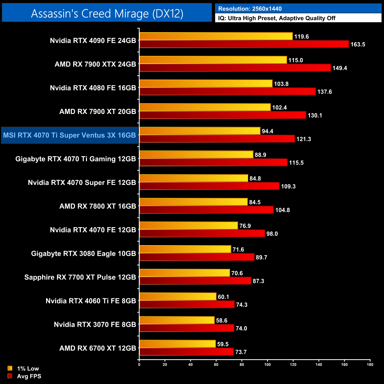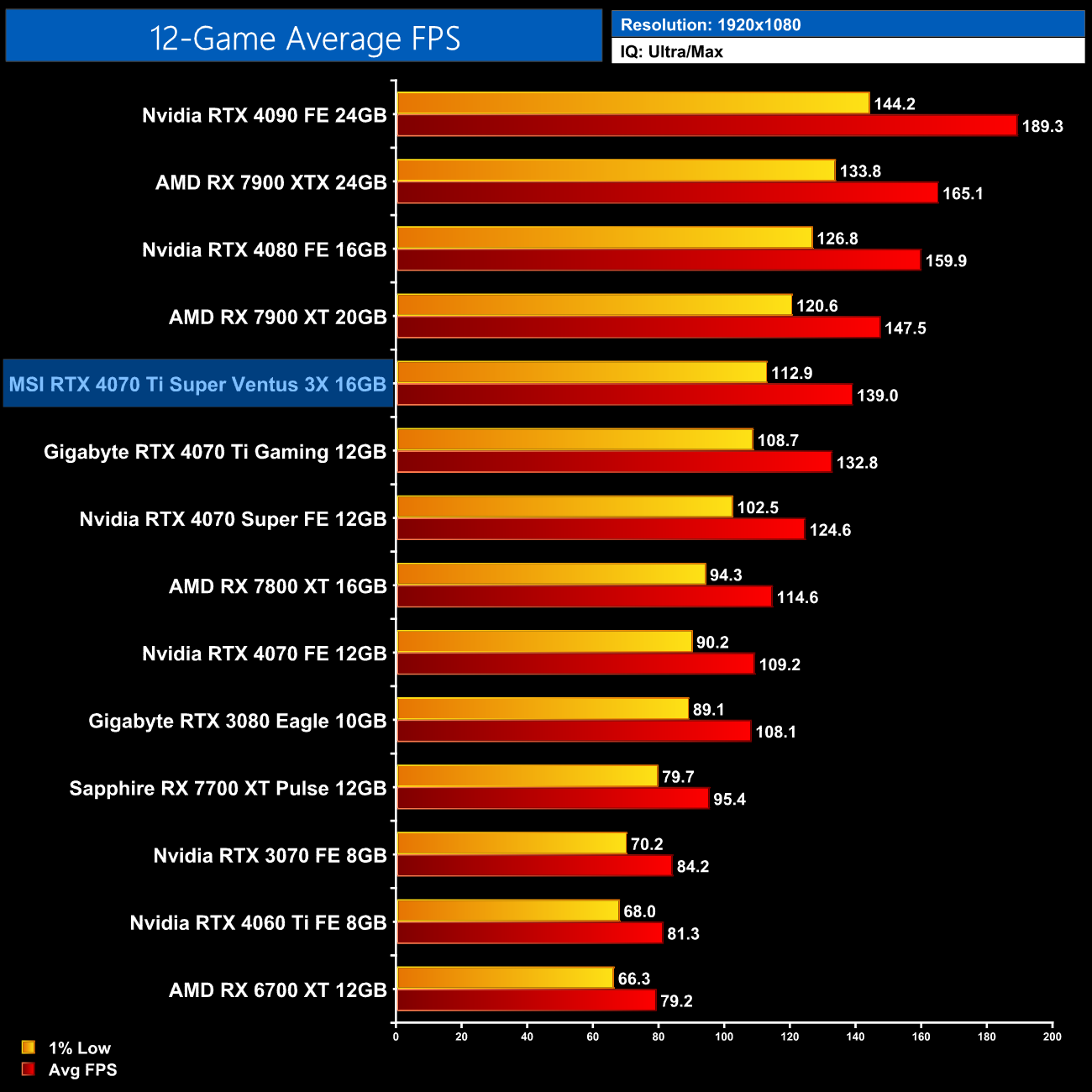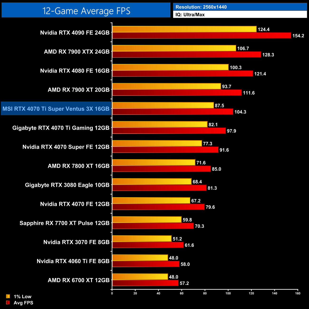Overall then, across the 12 games tested, the RTX 4070 Ti Super averaged 104FPS at 1440p. That makes it 7% faster on average compared to the RTX 4070 Ti, and 7% slower than AMD's RX 7900 XT. It also comes in 14% behind the RTX 4080 so there's still a decently-sized gap between these AD103 GPUs.