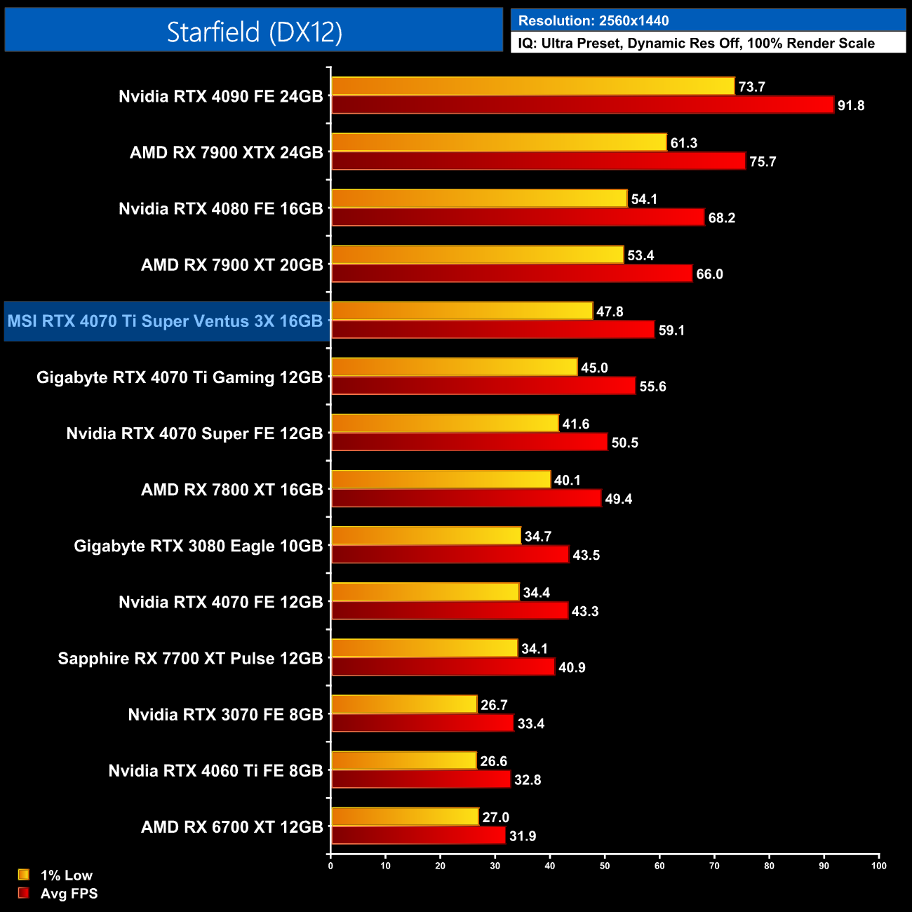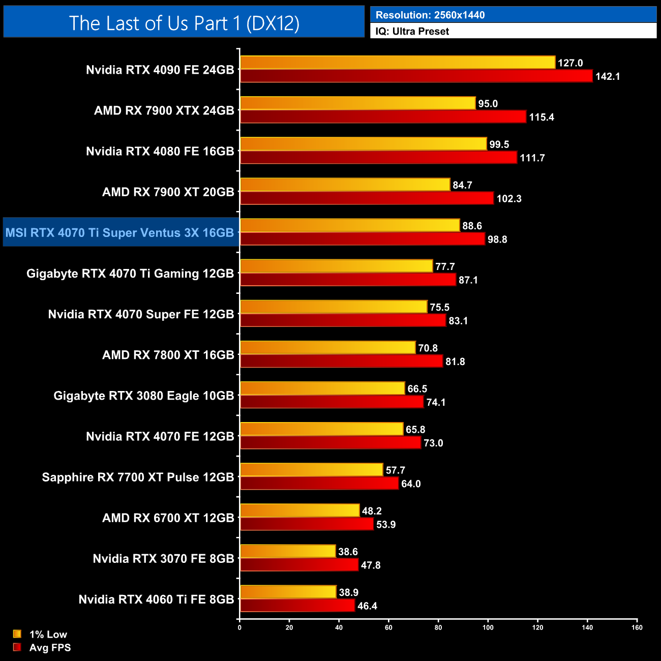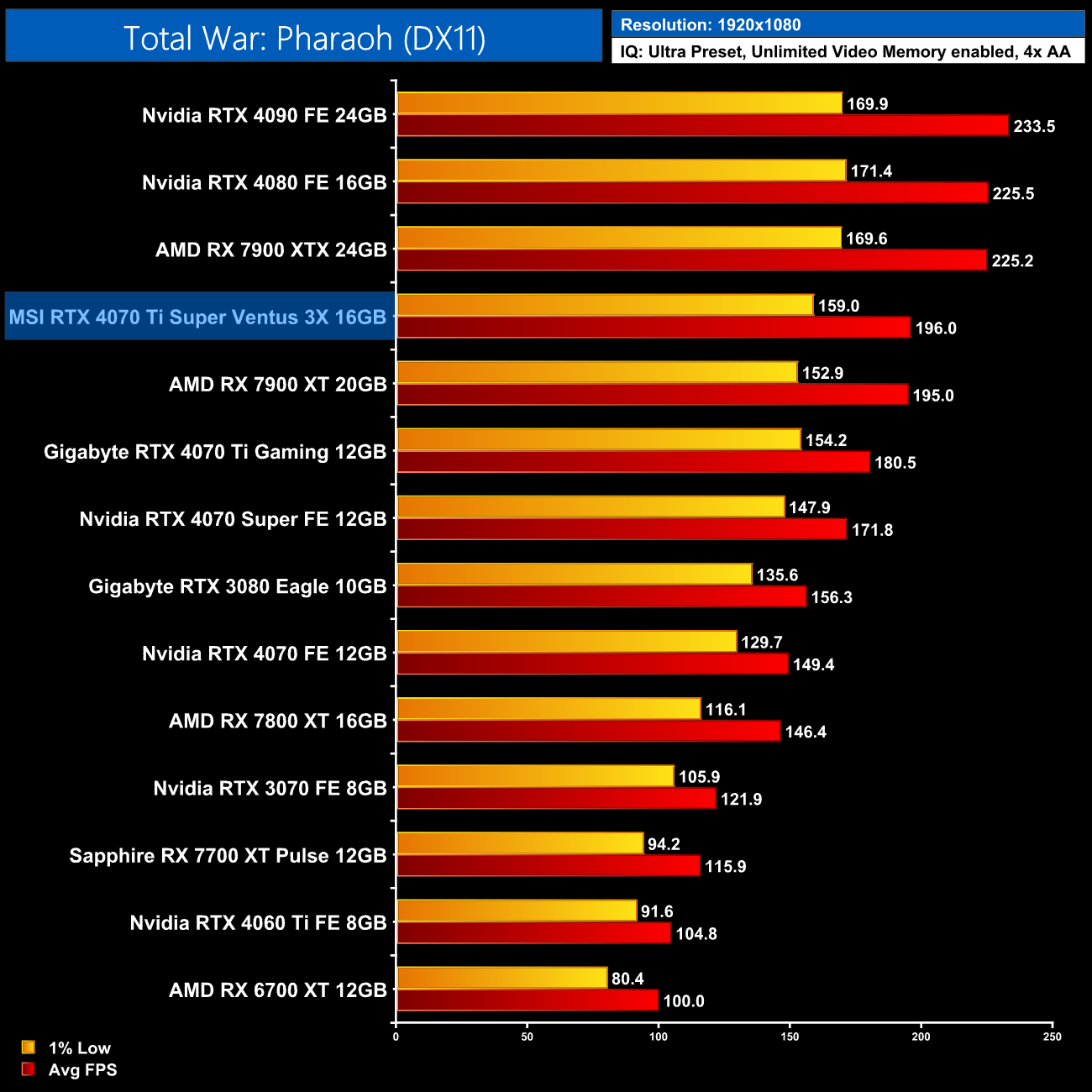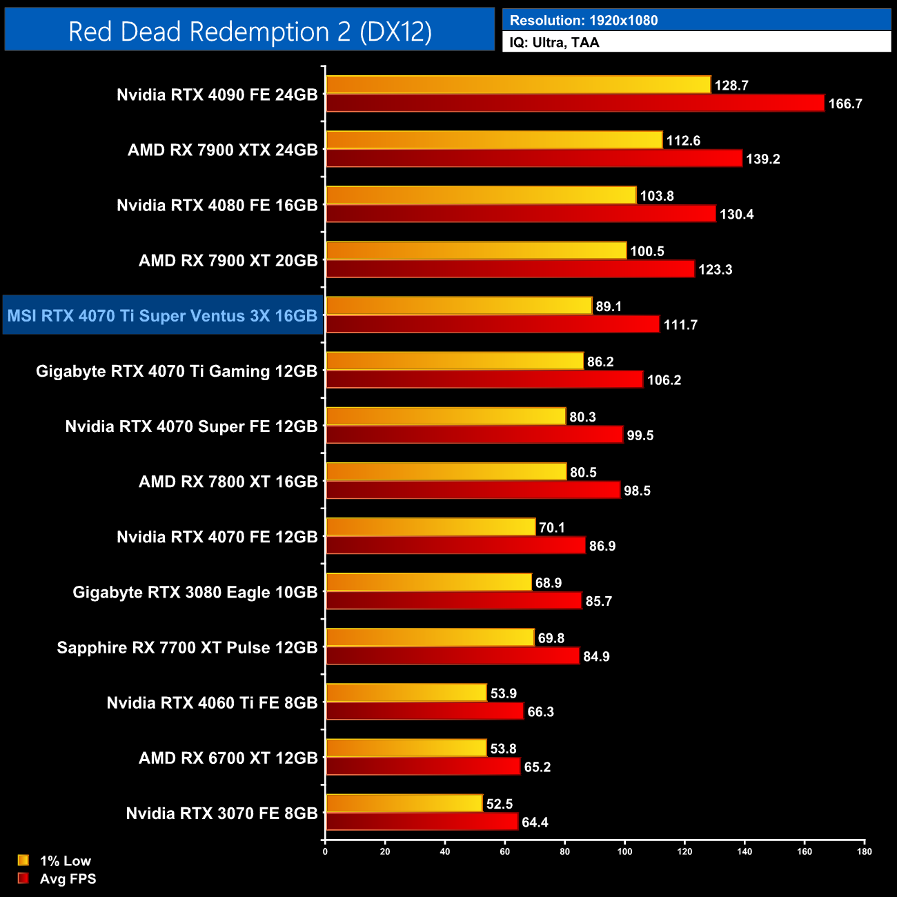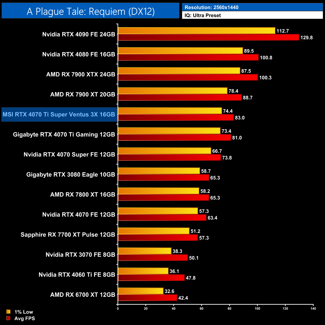 Overall then, across the 12 games tested, the RTX 4070 Ti Super averaged 104FPS at 1440p. That makes it 7% faster on average compared to the RTX 4070 Ti, and 7% slower than AMD's RX 7900 XT. It also comes in 14% behind the RTX 4080 so there's still a decently-sized gap between these AD103 GPUs.