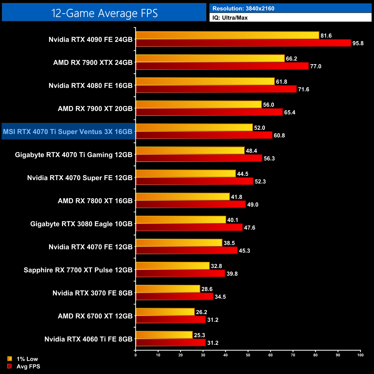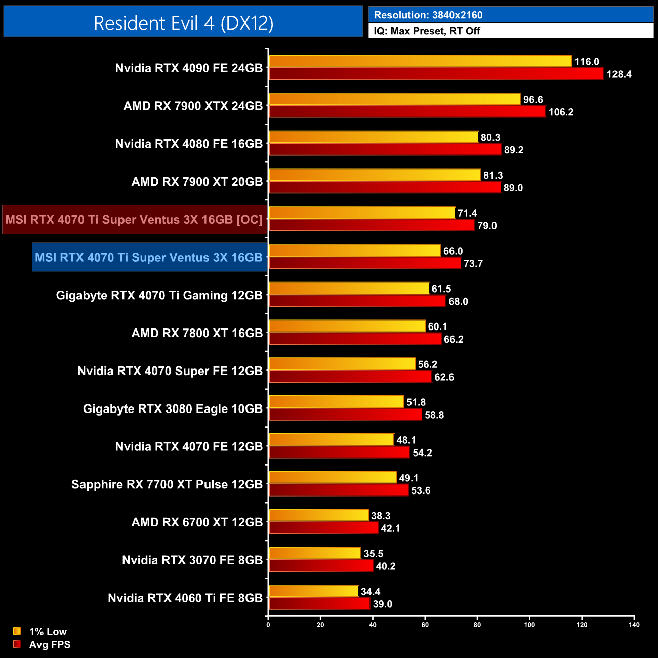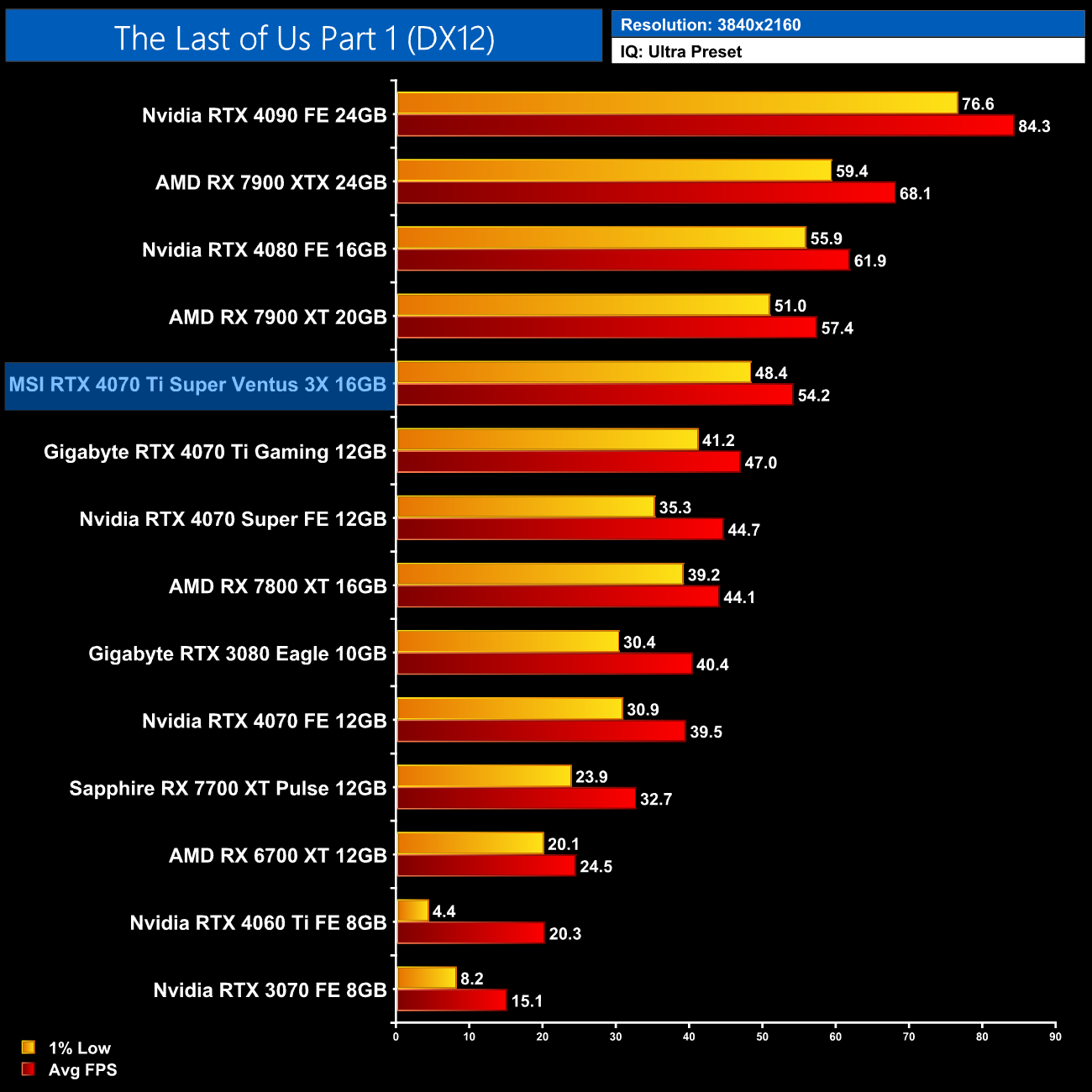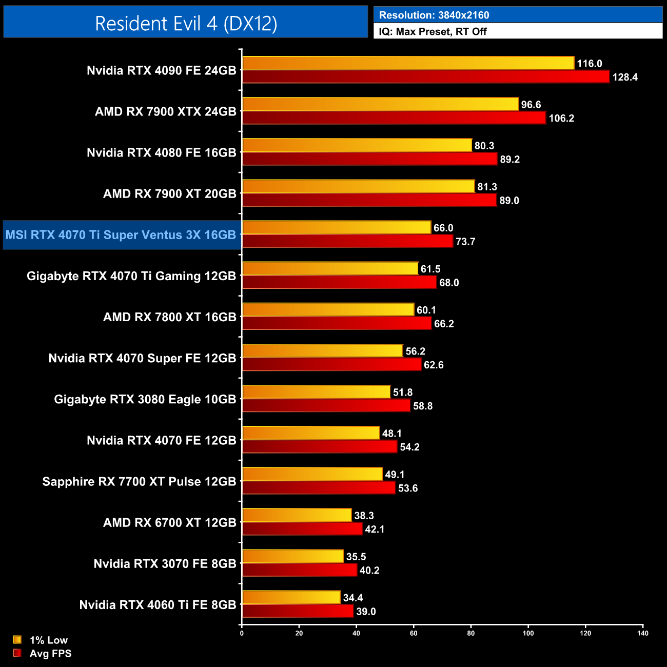 Lastly, the results follow a very similar trend at 4K, with the 4070 Ti Super on par with the RTX 4070 Super and just a hair behind the 4090 and 4080.