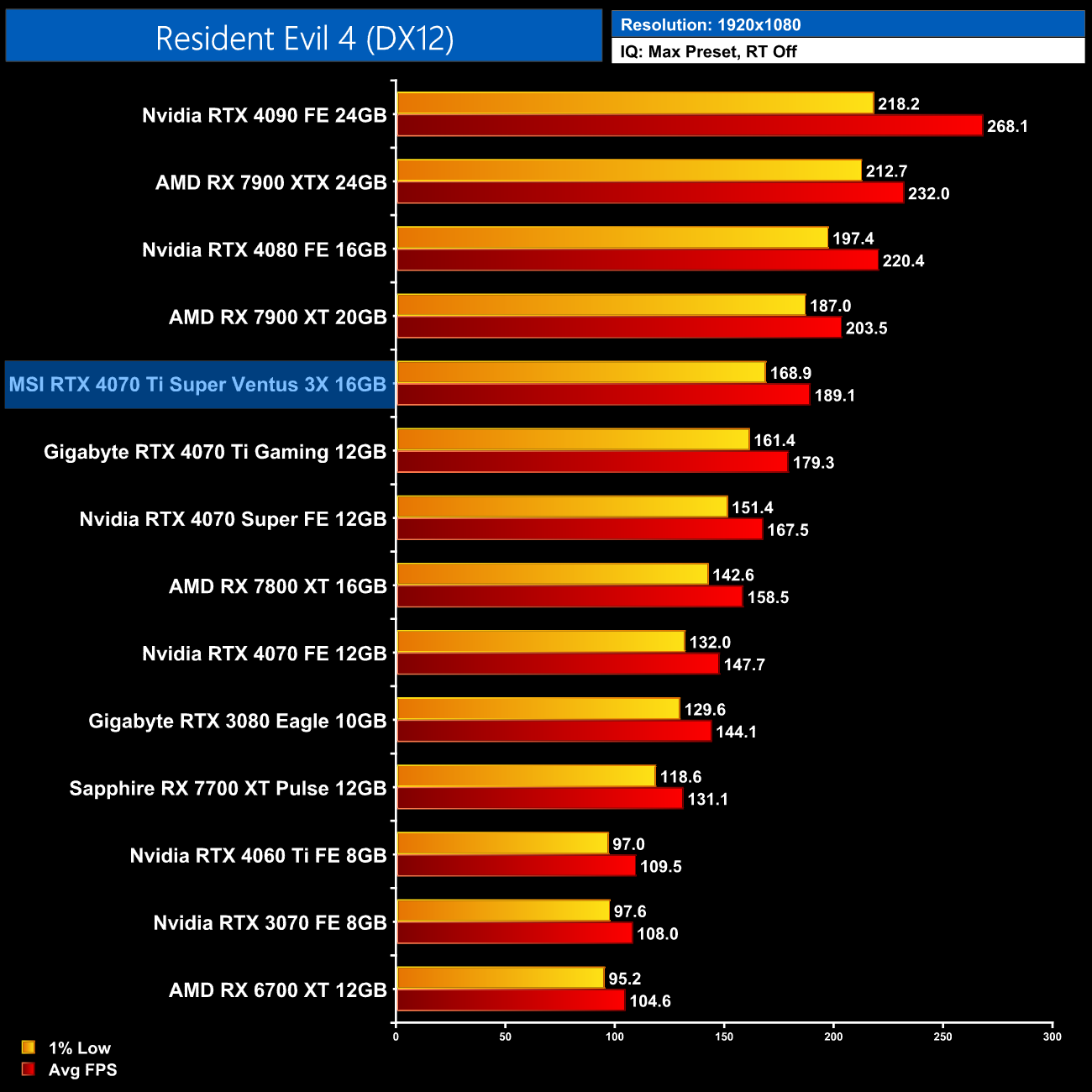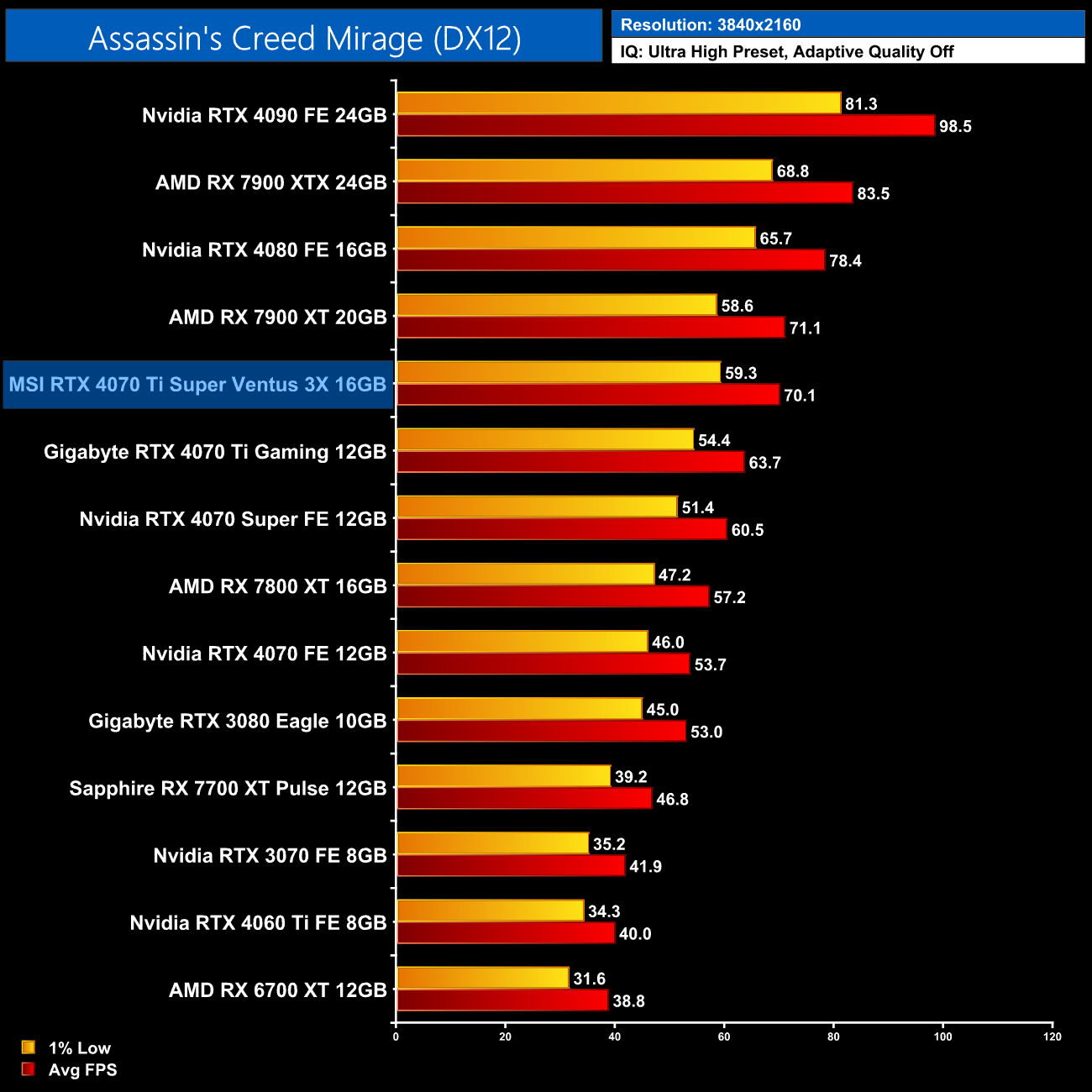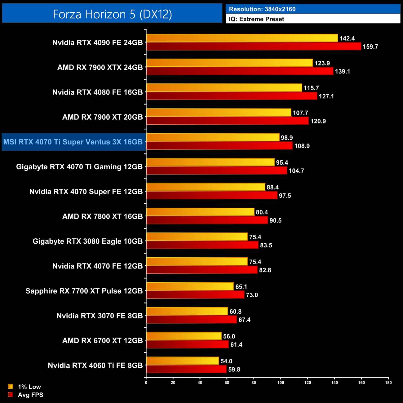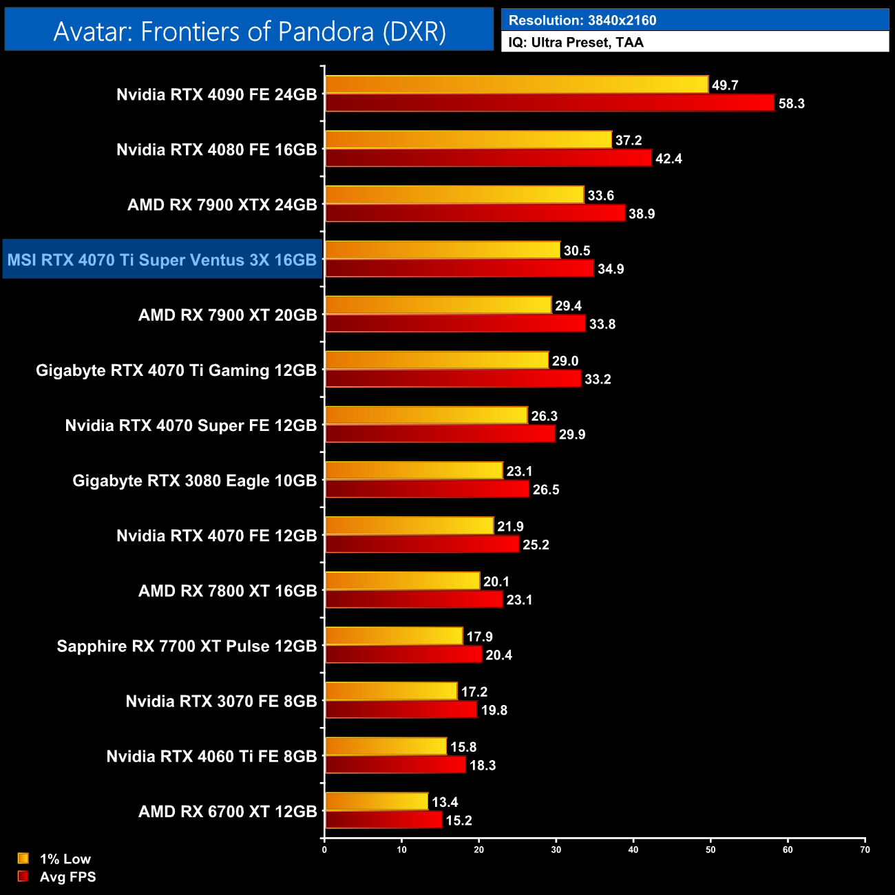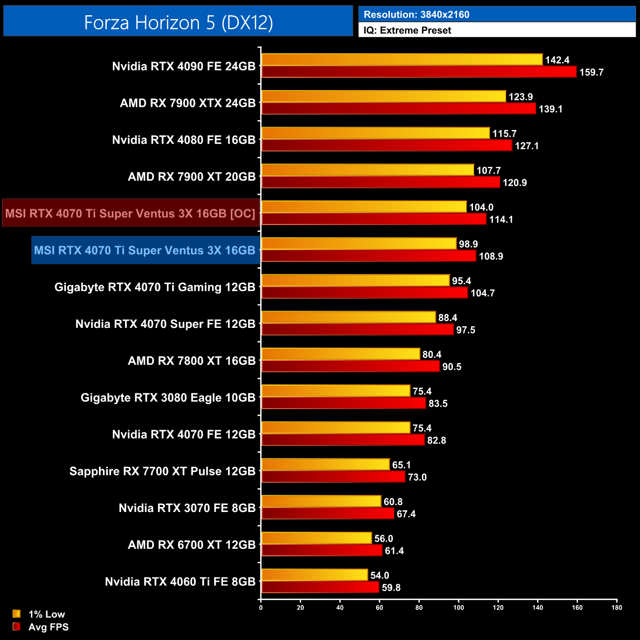 Lastly, the results follow a very similar trend at 4K, with the 4070 Ti Super on par with the RTX 4070 Super and just a hair behind the 4090 and 4080.