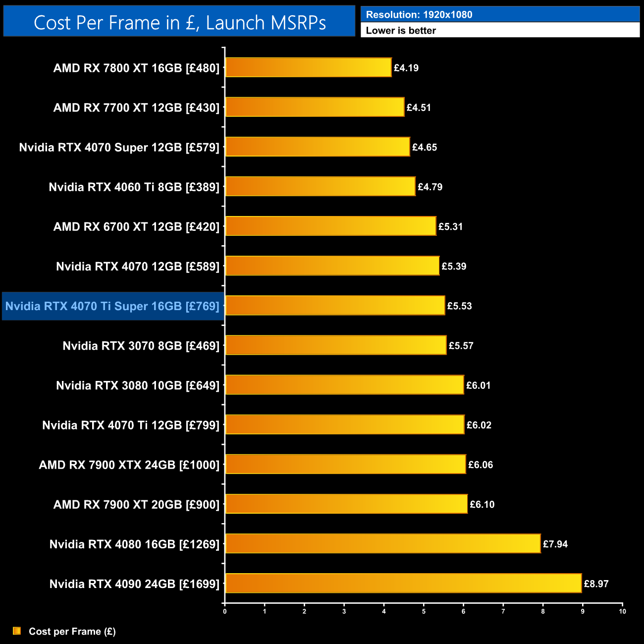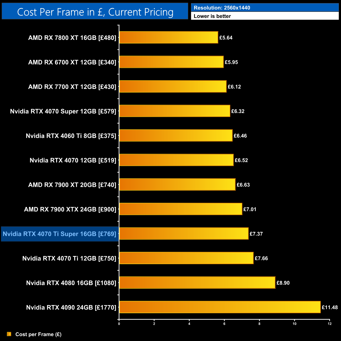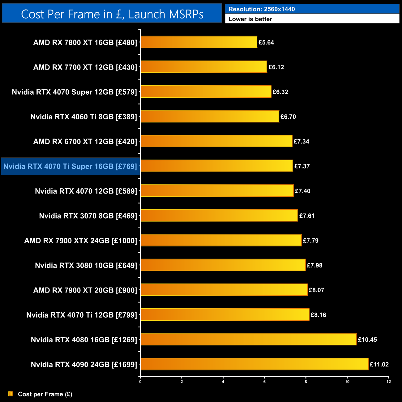 Given the 4070 Ti Super is both faster and £30 cheaper than the 4070 Ti's launch MSRP, we do see a 10% reduction in cost per frame for rasterised performance at 1440p. That's obviously a good improvement and doesn't necessarily factor in the extra longevity of the 16GB frame buffer, though it's also true that there are better value offerings out there, such as AMD's RX 7800 XT or the recently released RTX 4070 Super.