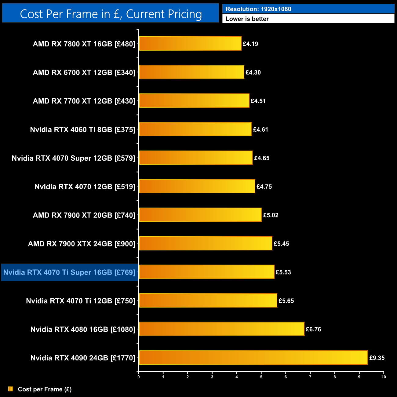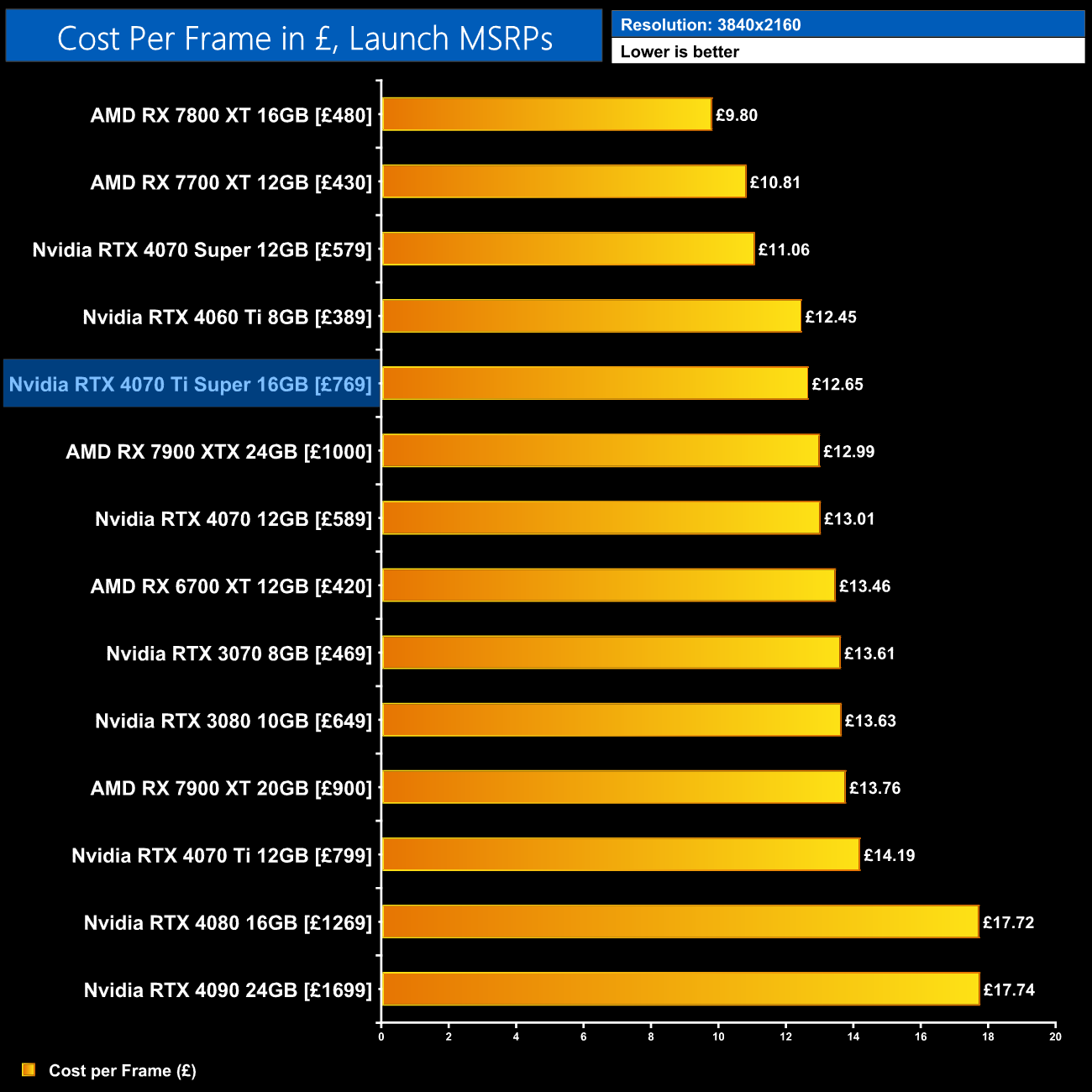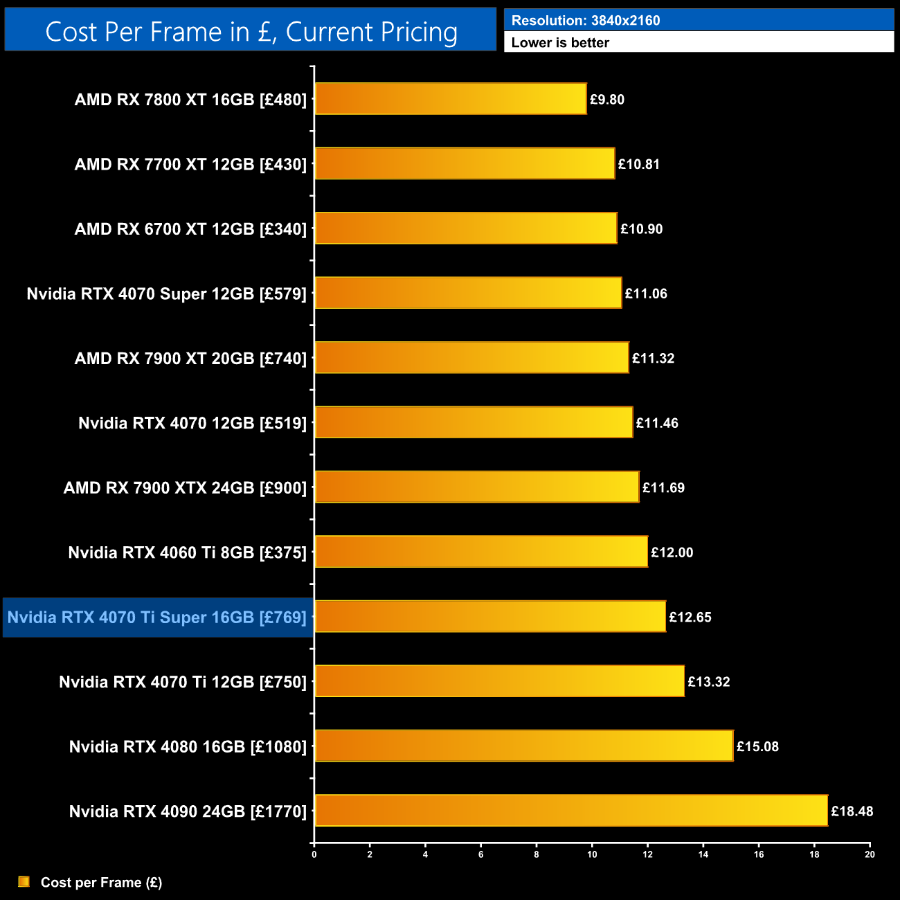 Given the 4070 Ti Super is both faster and £30 cheaper than the 4070 Ti's launch MSRP, we do see a 10% reduction in cost per frame for rasterised performance at 1440p. That's obviously a good improvement and doesn't necessarily factor in the extra longevity of the 16GB frame buffer, though it's also true that there are better value offerings out there, such as AMD's RX 7800 XT or the recently released RTX 4070 Super.