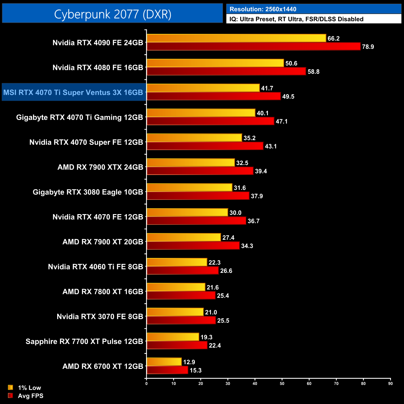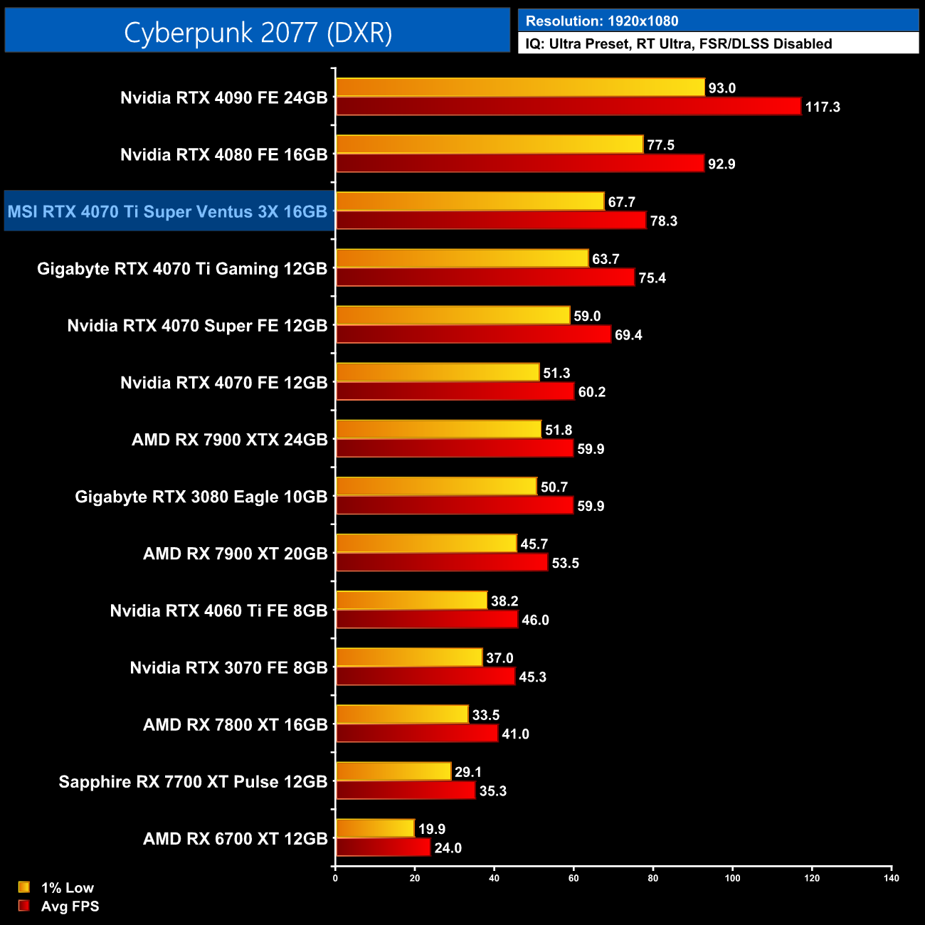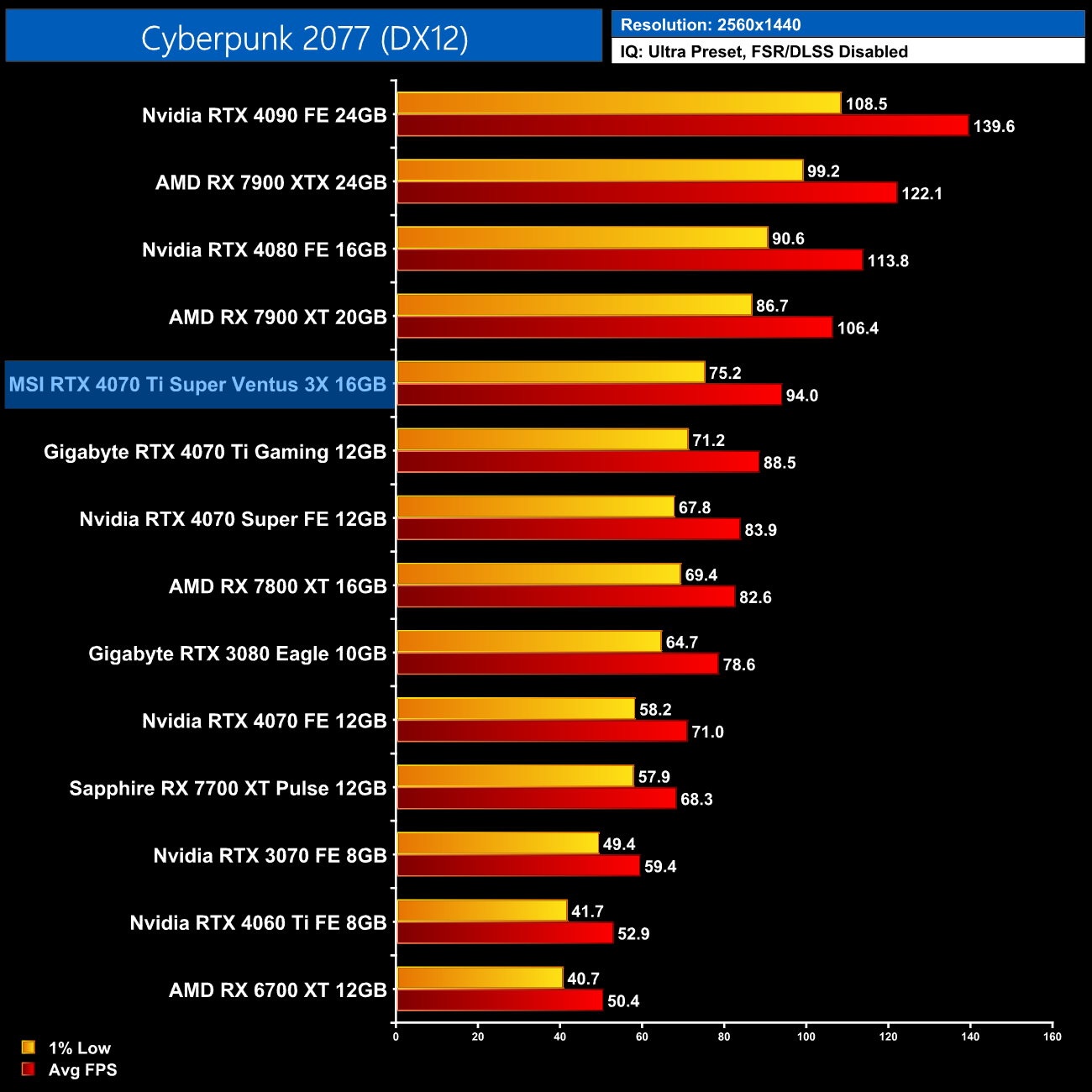 Likewise, In Cyberpunk 2077, we're only looking at a 5% gain for the 4070 Ti Super over the 4070 Ti, while it's 16% slower than the 4080. Nvidia GPUs still crush AMD in this one though, so we're still looking at a 26% lead over the RX 7900 XTX at 1440p.