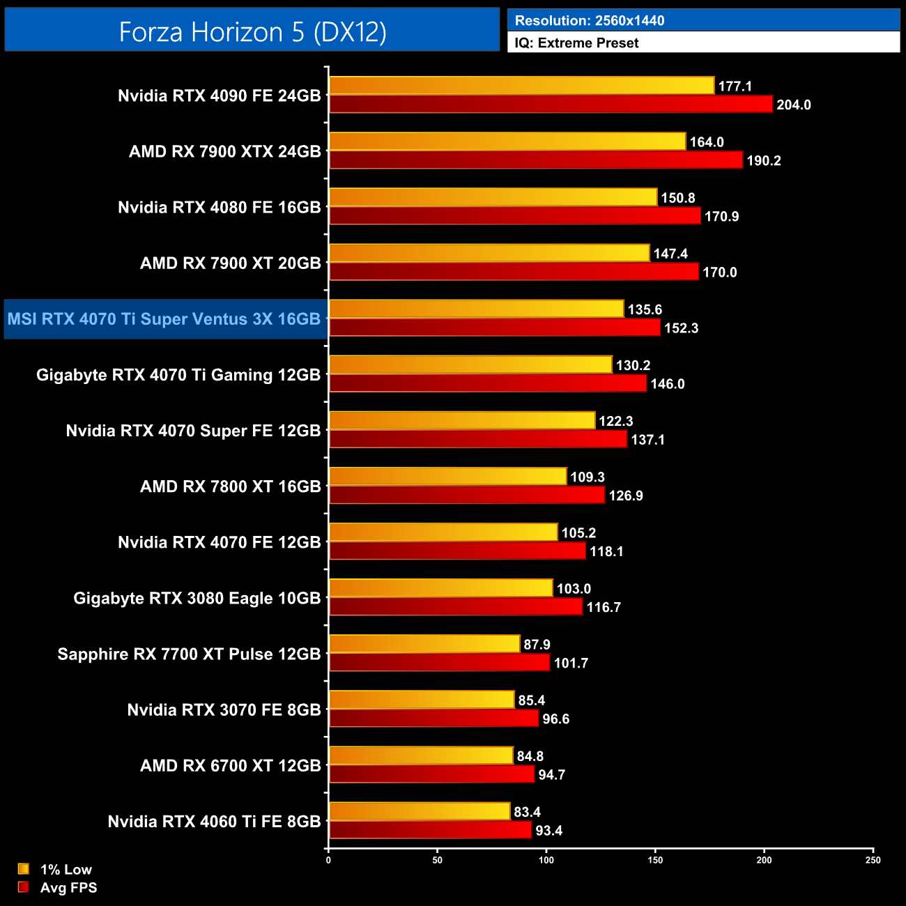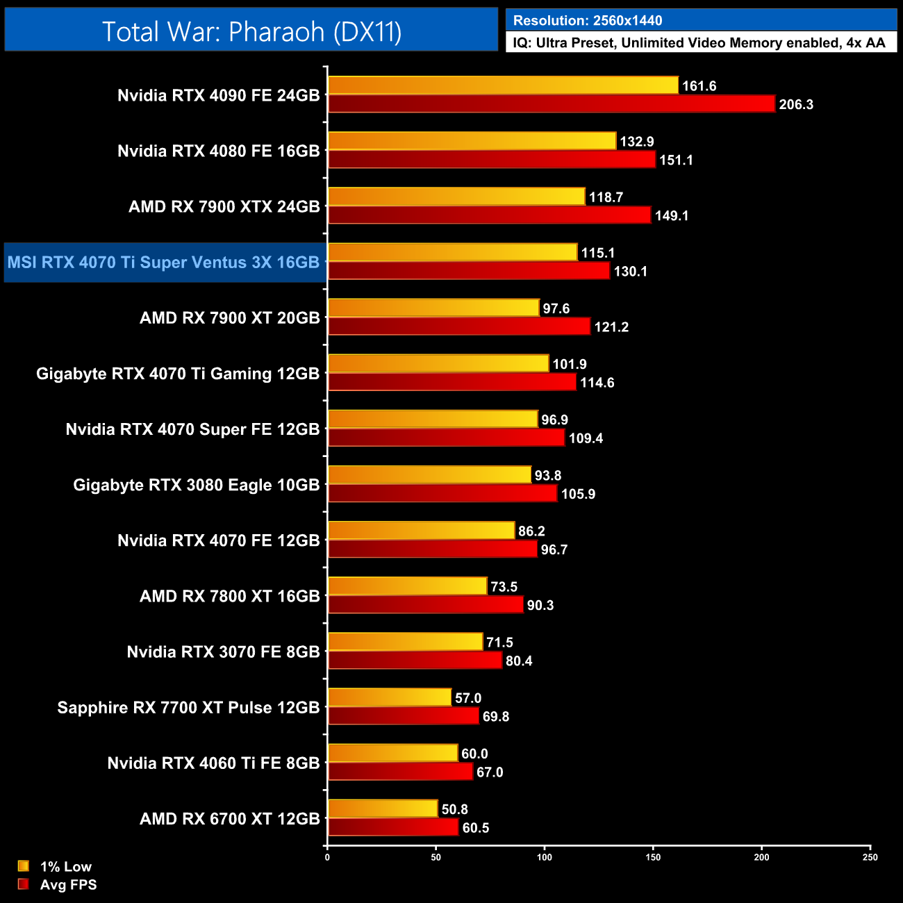 AMD GPUs fare a lot better in F1 23, with the 4070 Ti Super coming in 7% faster than the RX 7900 XT. It's also a 5% gain compared to the original 4070 Ti at 1440p.