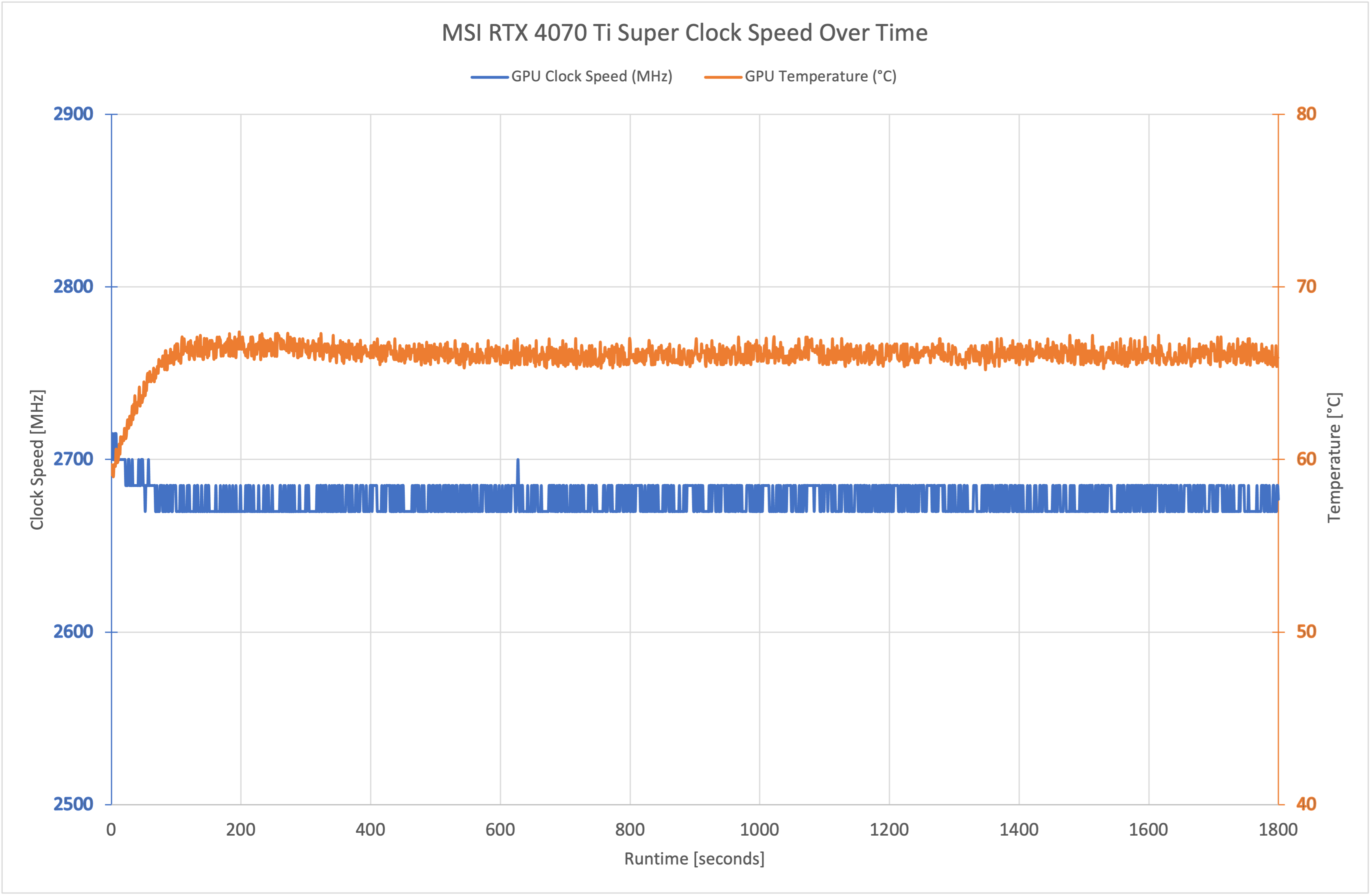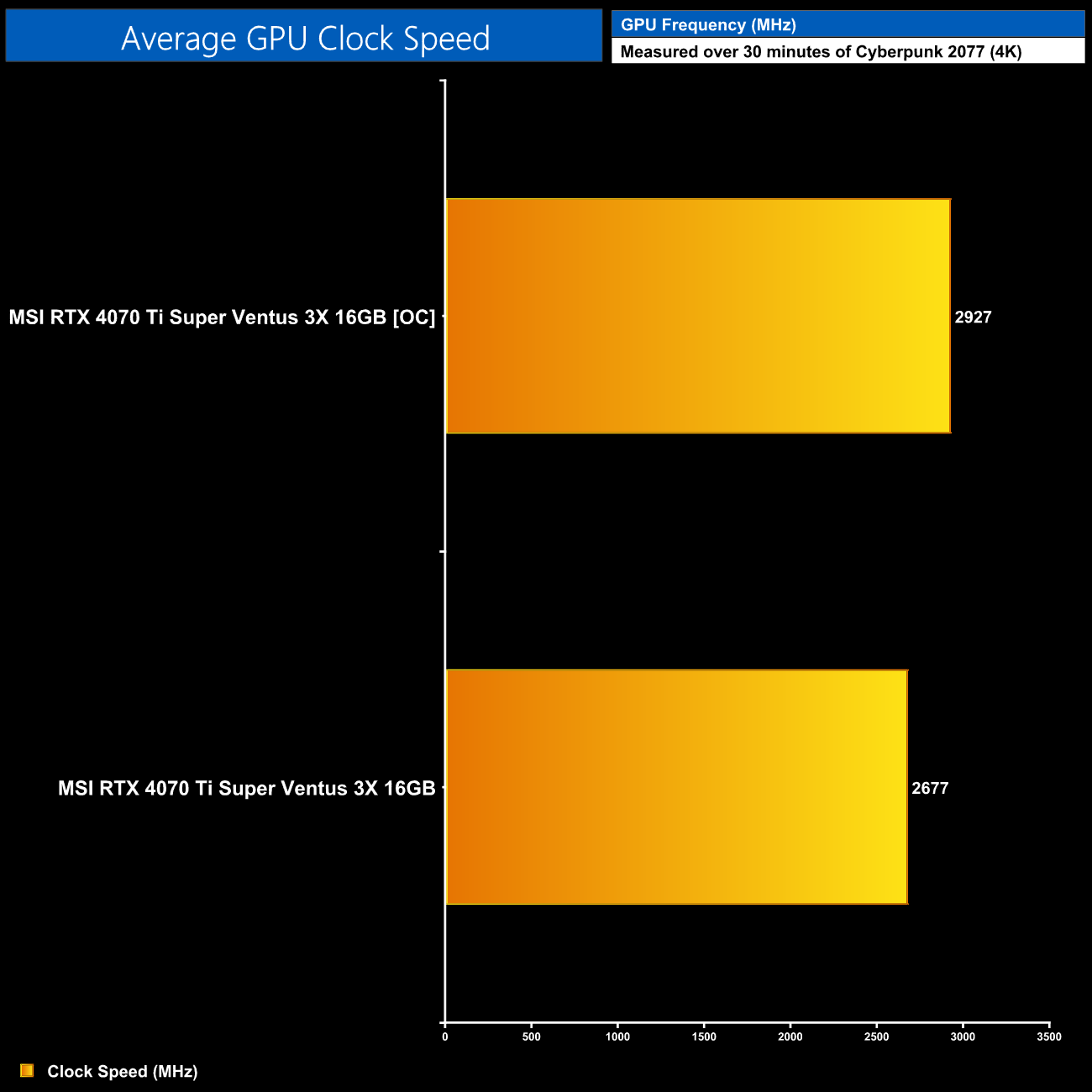 We've only tested one 4070 Ti Super so far so we will get a better idea of clock speeds when we can test more cards. For now, the Ventus 3X model typically ran a bit below 2700MHz, averaging 2677MHz over our 30-minute stress test.