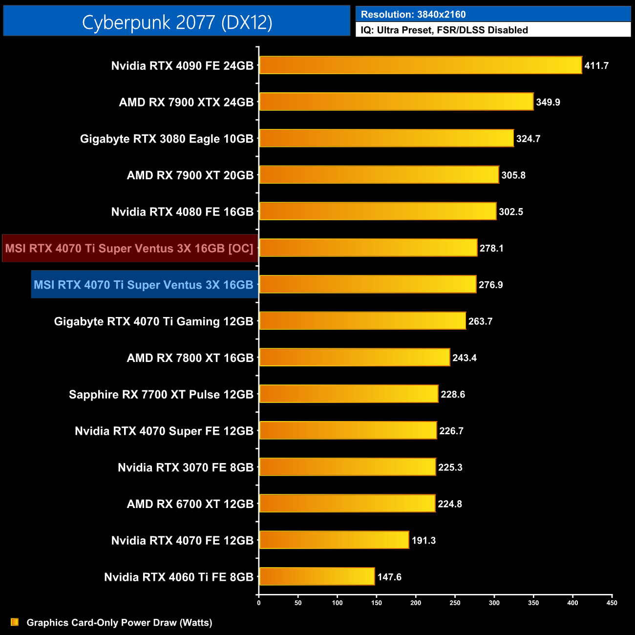 We measure system-wide power draw from the wall while running Cyberpunk 2077 for 30 minutes (4K resolution).