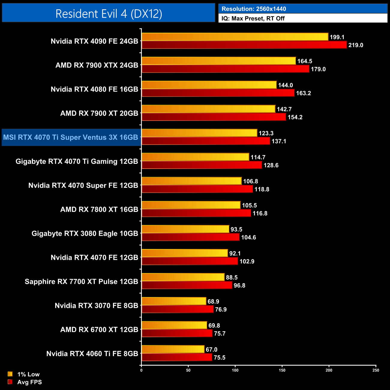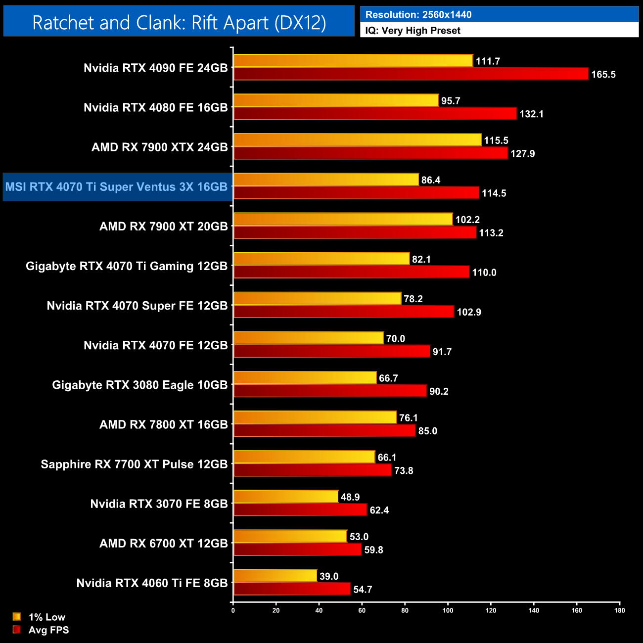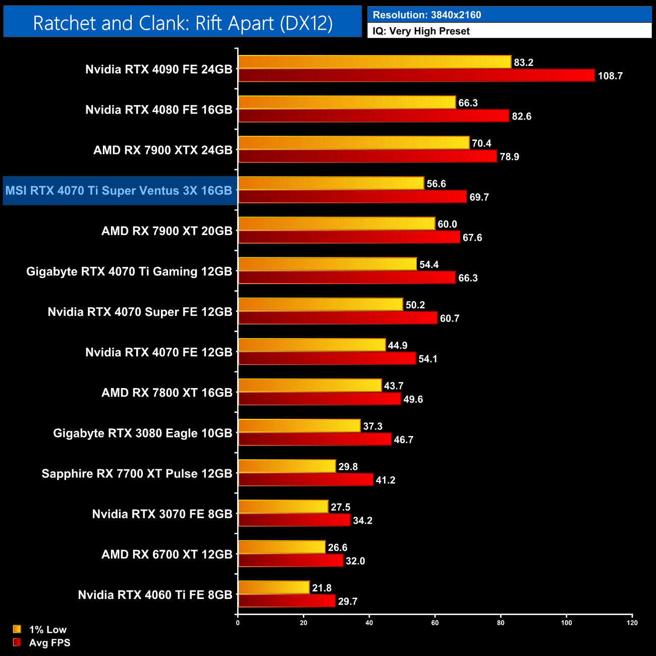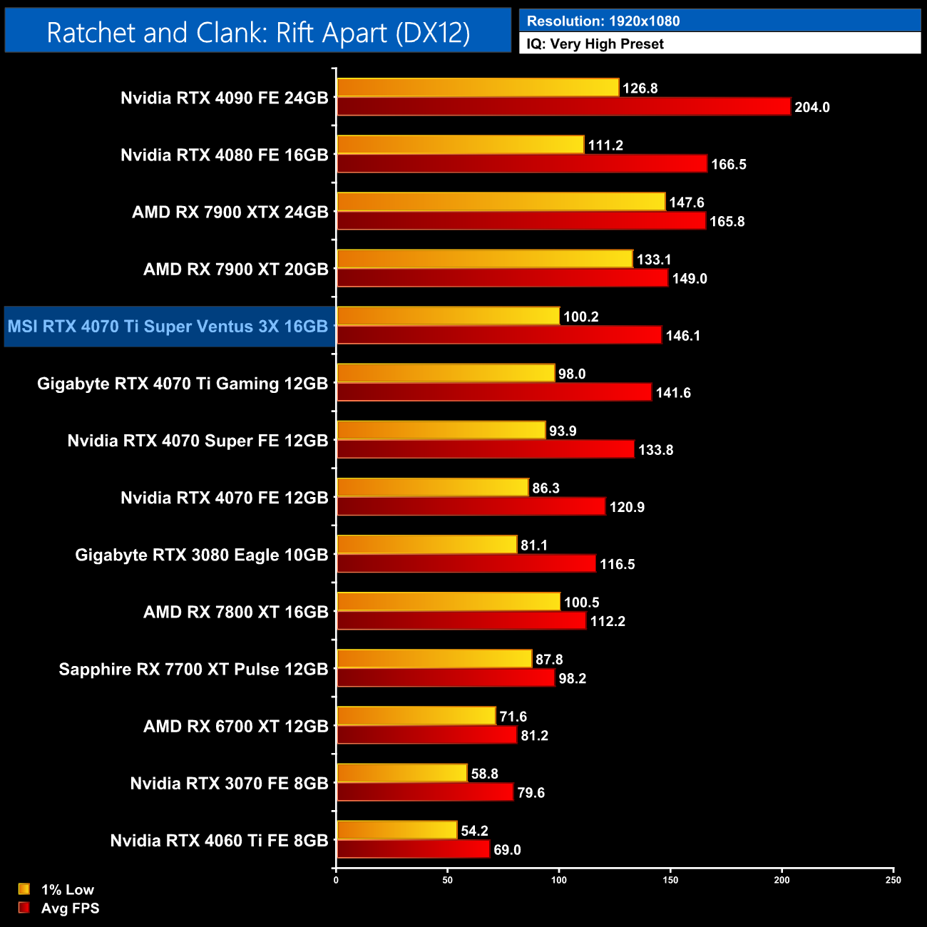 Next up we have Ratchet and Clank, where AMD GPUs get destroyed with ray tracing enabled – at 1440p, the 4070 Ti Super is 67% faster than the RX 7900 XT, though only 6% ahead of the 4070 Ti.
