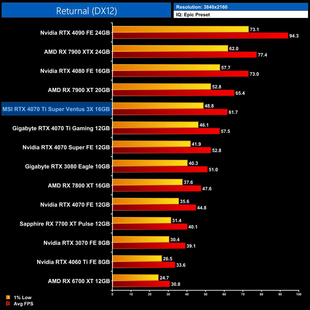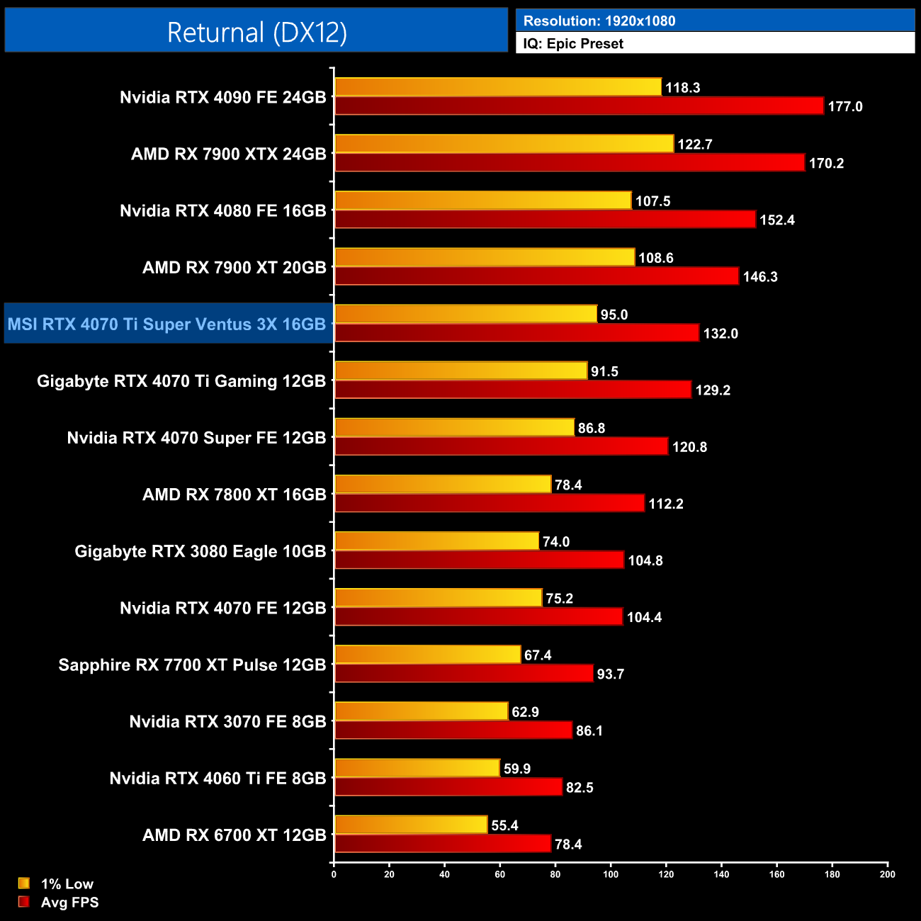 Returnal shows pretty meagre gains for the Ti Super over the 4070 Ti however, we're talking just a 3% difference at 1440p, though that's still enough for the new card to come in 10% ahead of the 7900 XT.